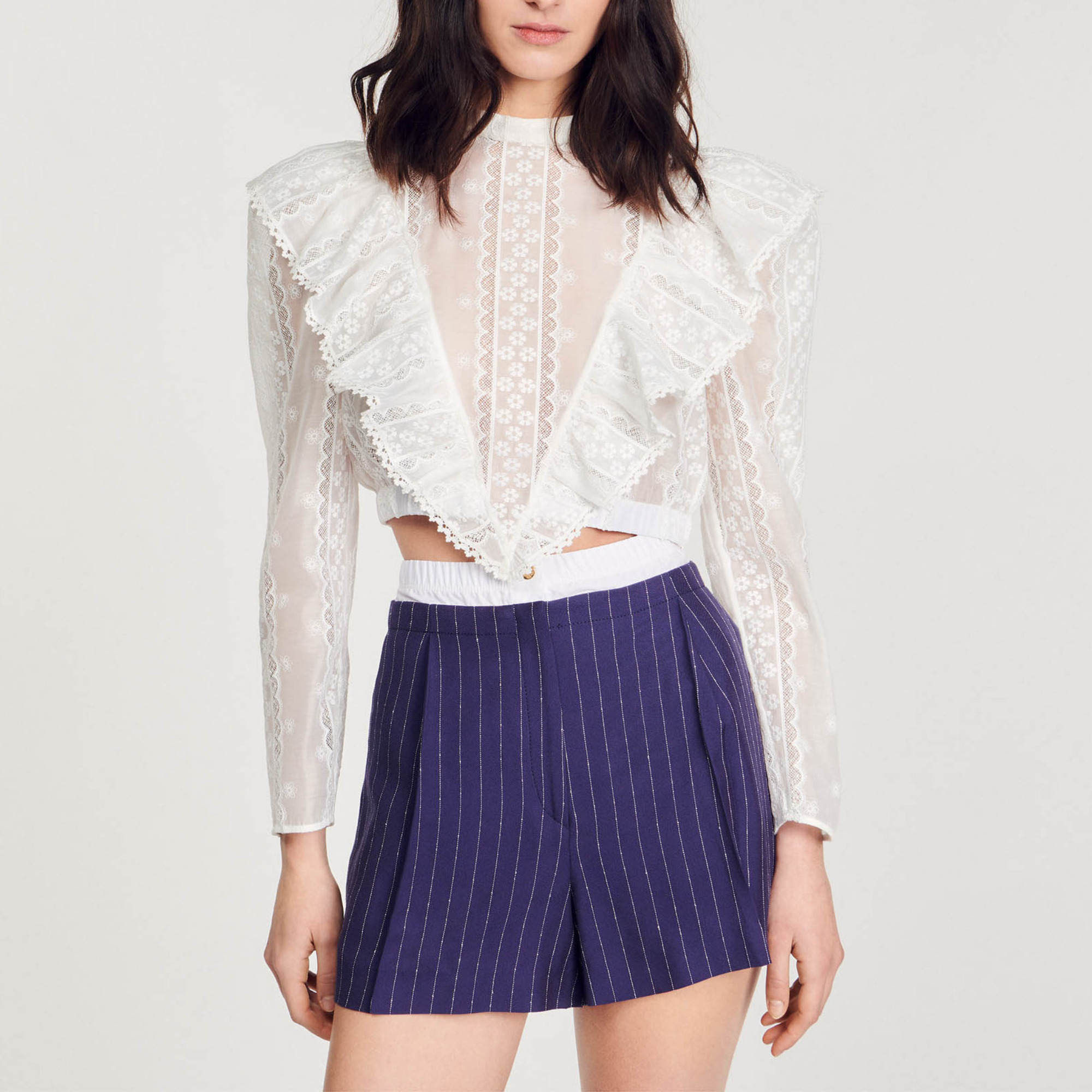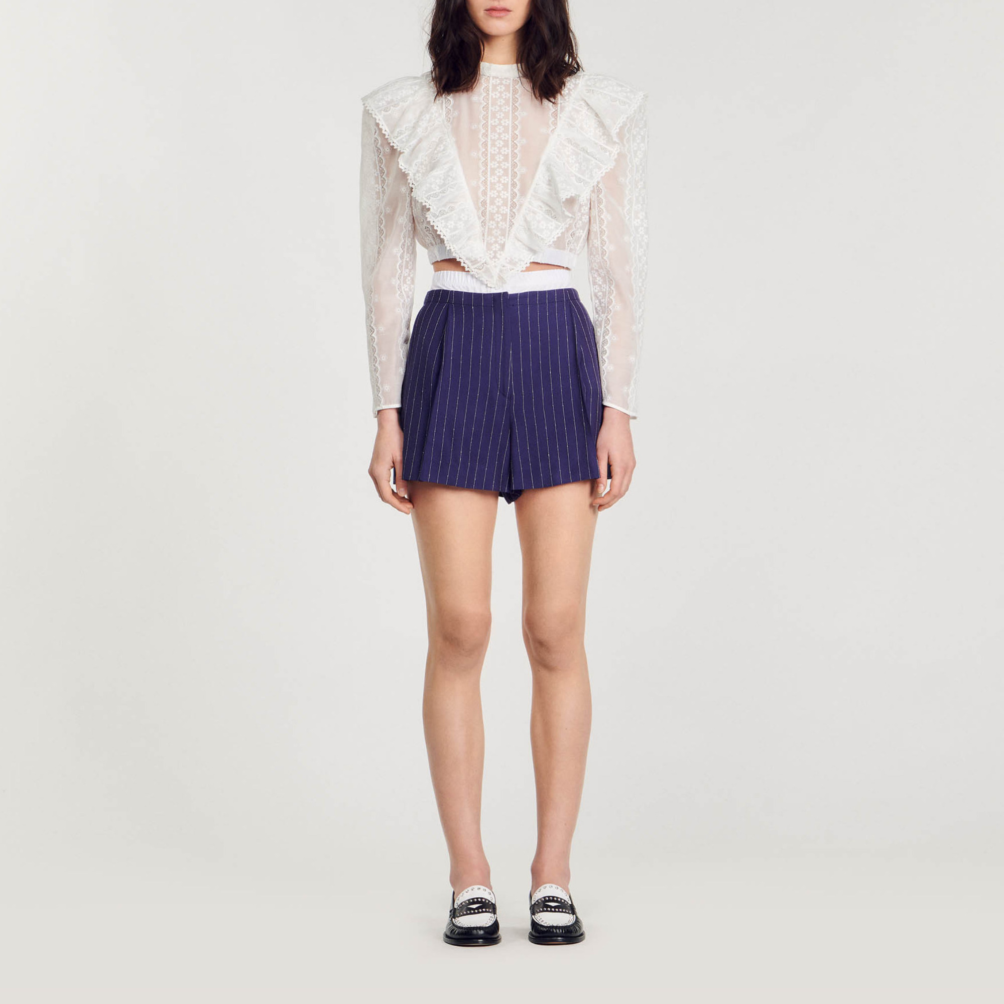 Sandro viscose Pinstriped shorts with contrasting illusion effect elasticated waistband, side pockets and press stud zip fastening Sandro Women's pinstripe shorts Contrasting elasticated waistband 2 pockets Zip fastening with button Back pocket These shorts match the jacket.