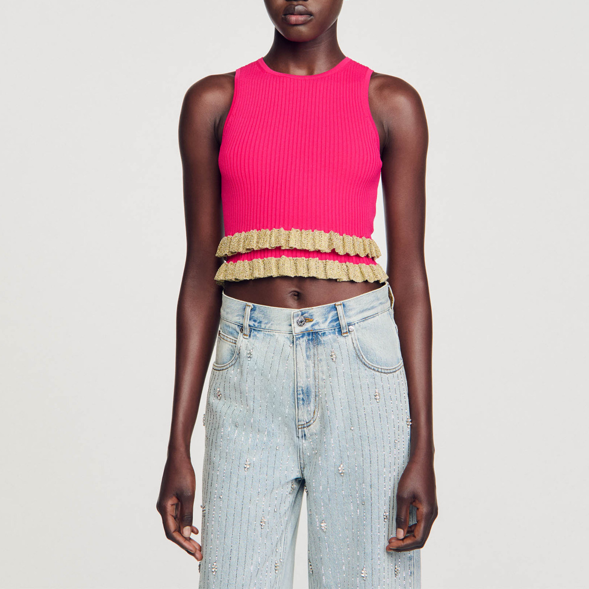 Sandro viscose Sleeveless rib knit sweater with round neck and contrasting ruffles at the bottom.