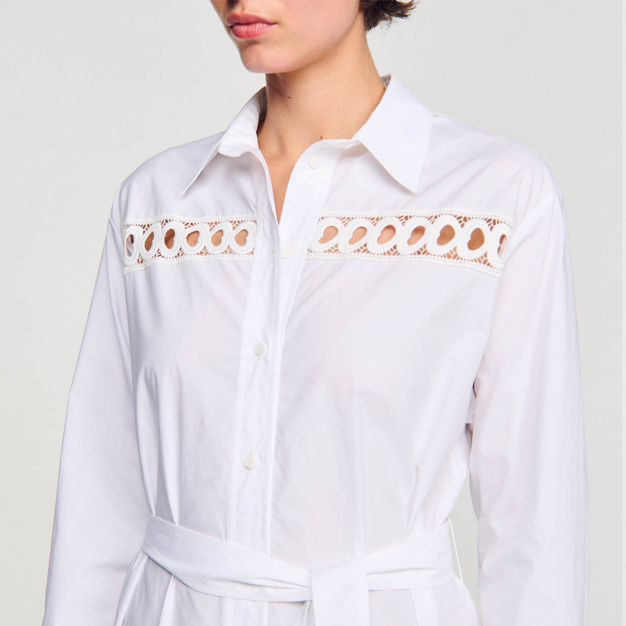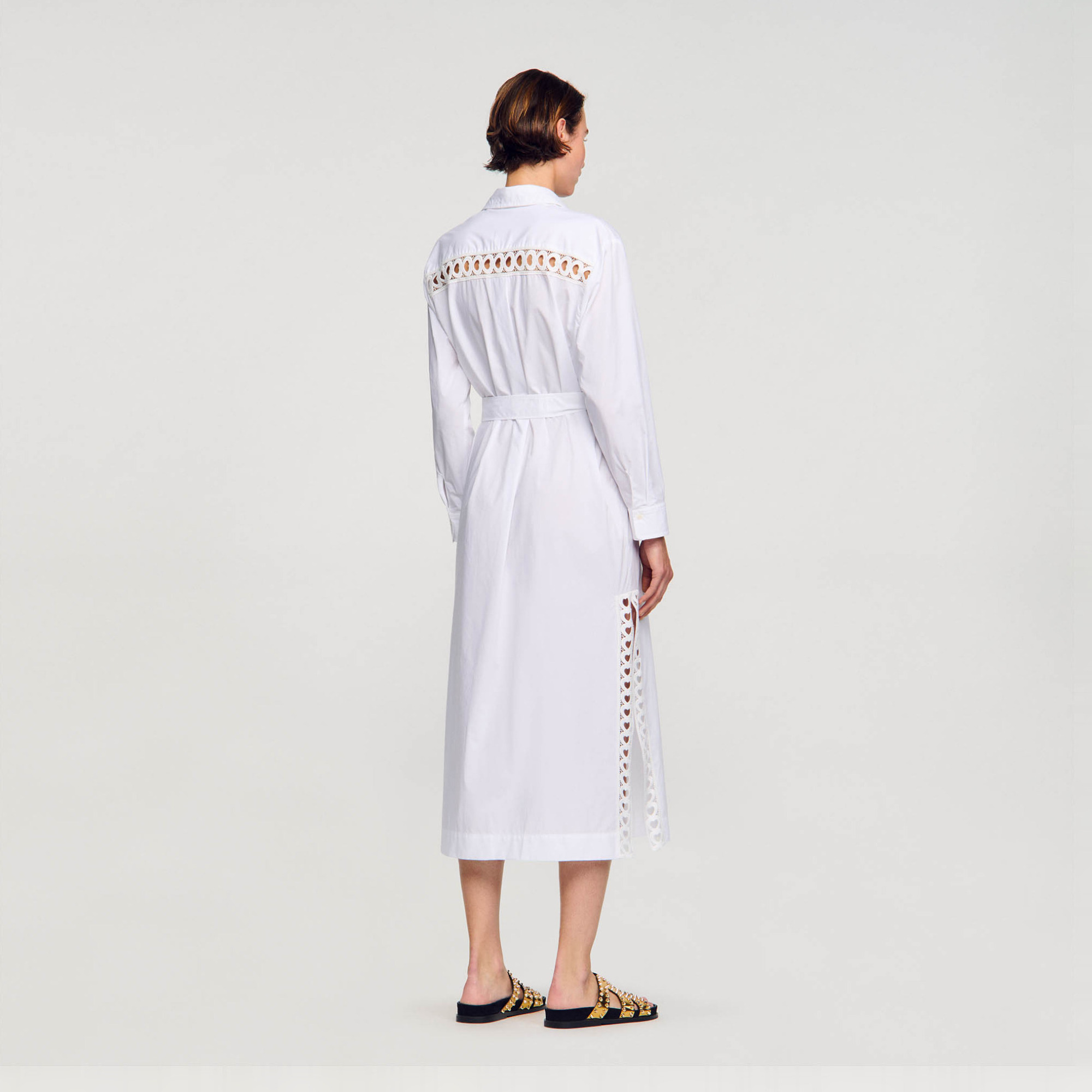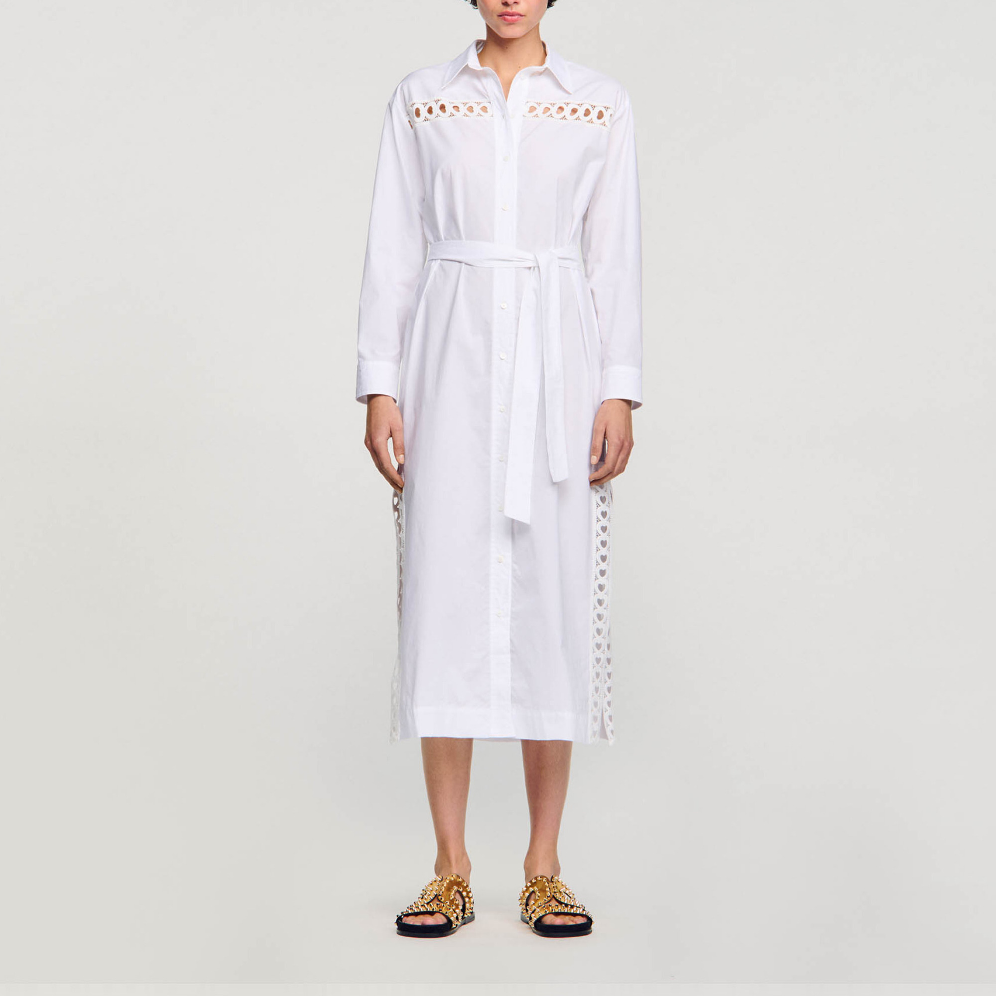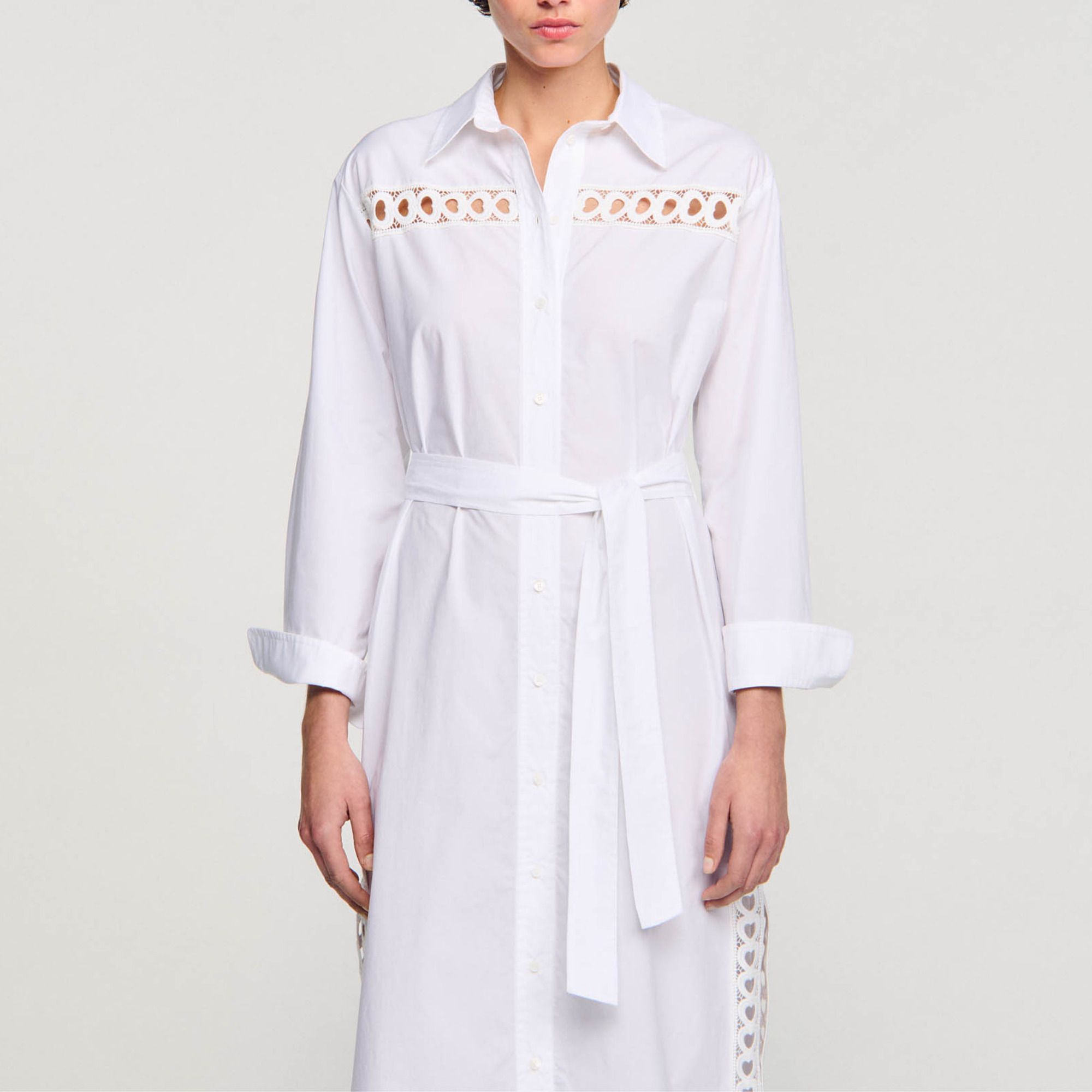 Sandro cotton Cotton maxi dress inlaid with tone-on-tone heart trim, featuring a shirt collar, button fastening, tone-on-tone tie belt, long sleeves and side slits.