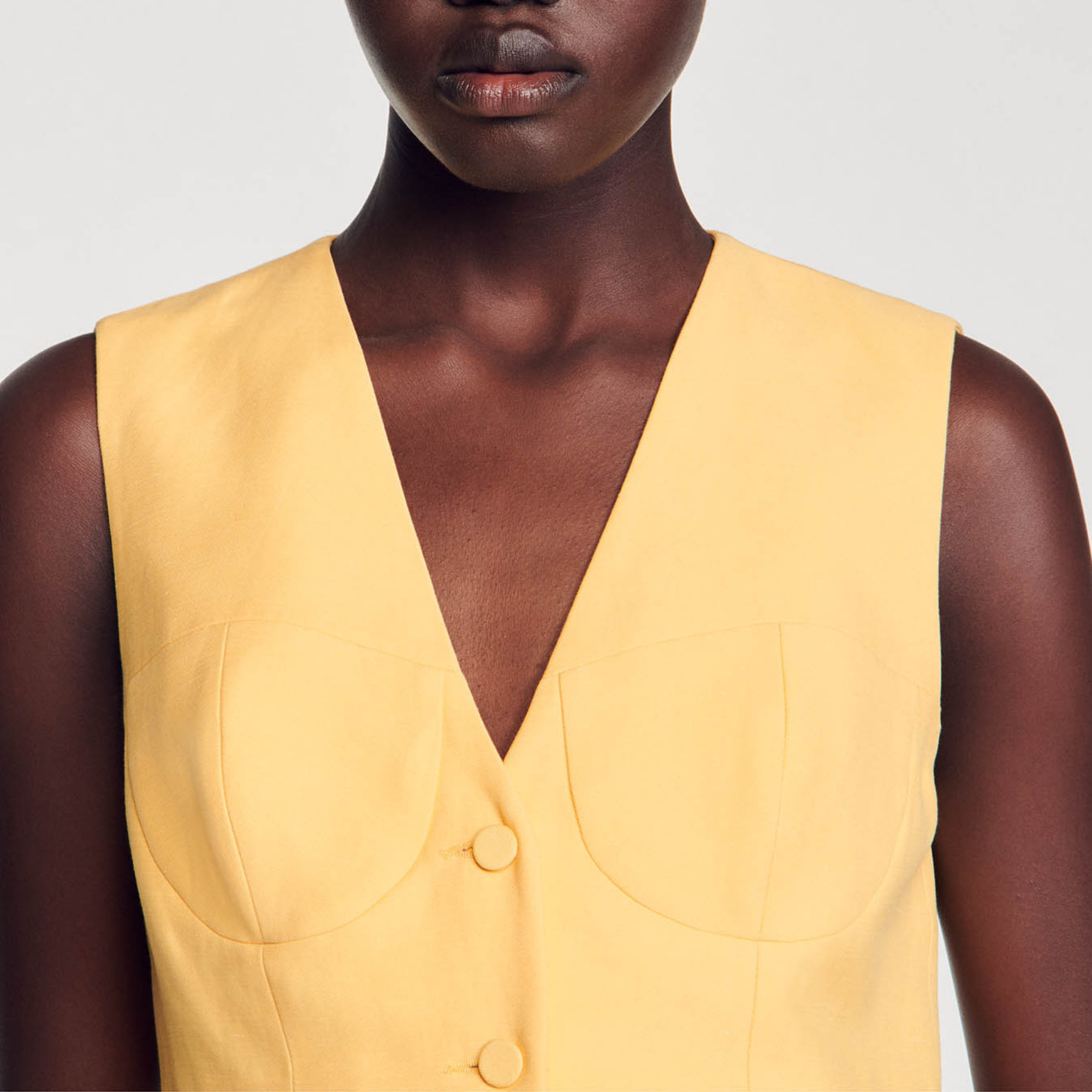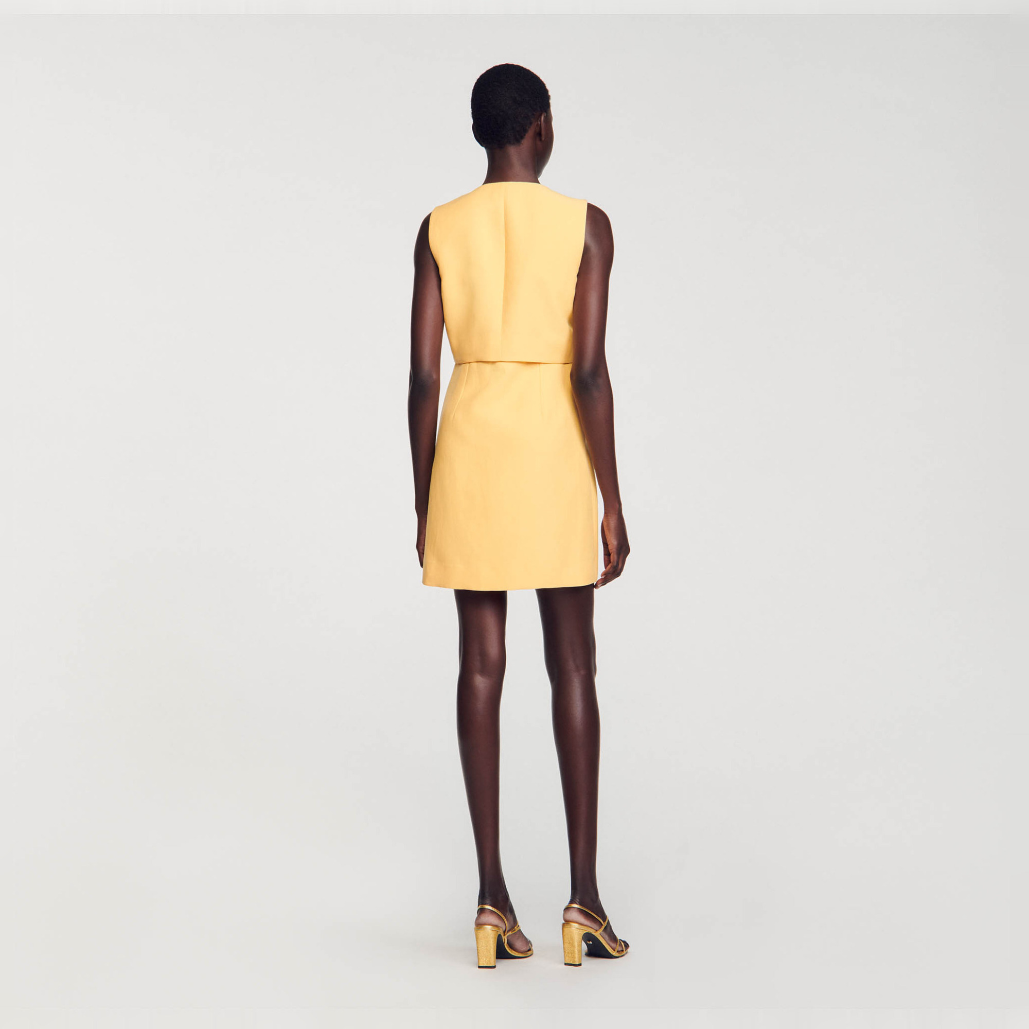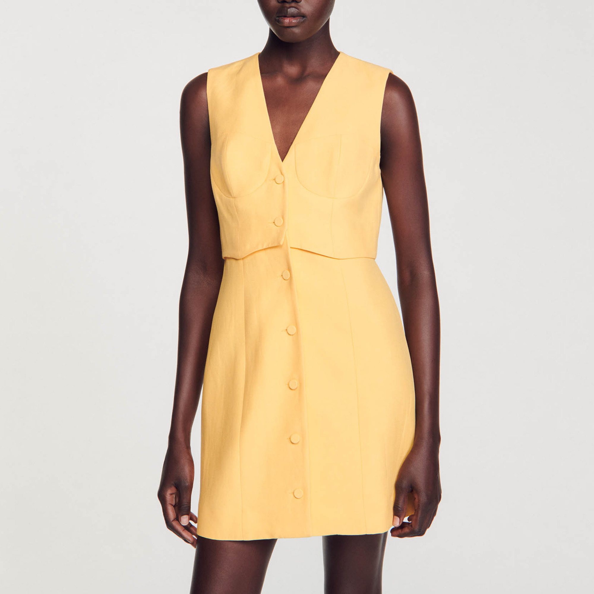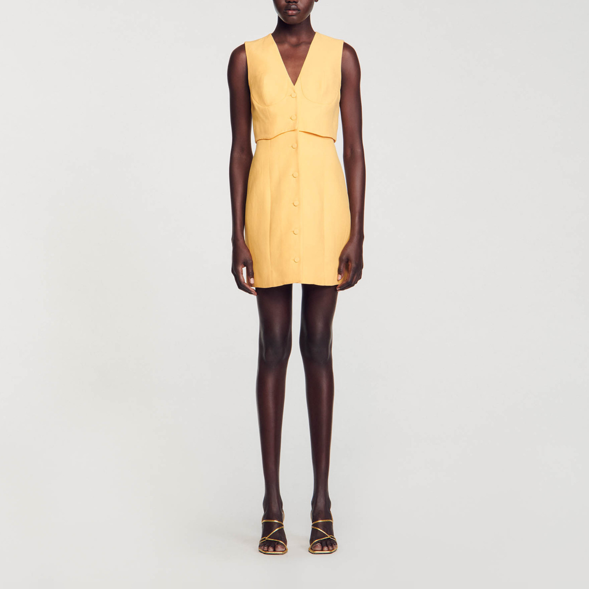 1 effect short dress in linen blend, featuring a sleeveless top with a jacket-style V-neckline embellished with corset-effect tailoring, a button fastening on the front and a snug straight skirt.