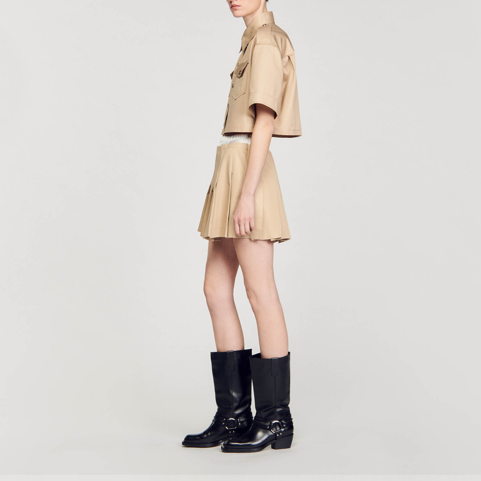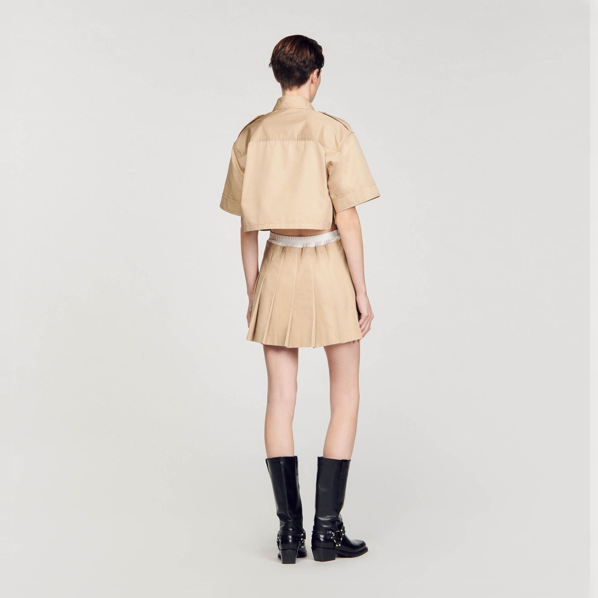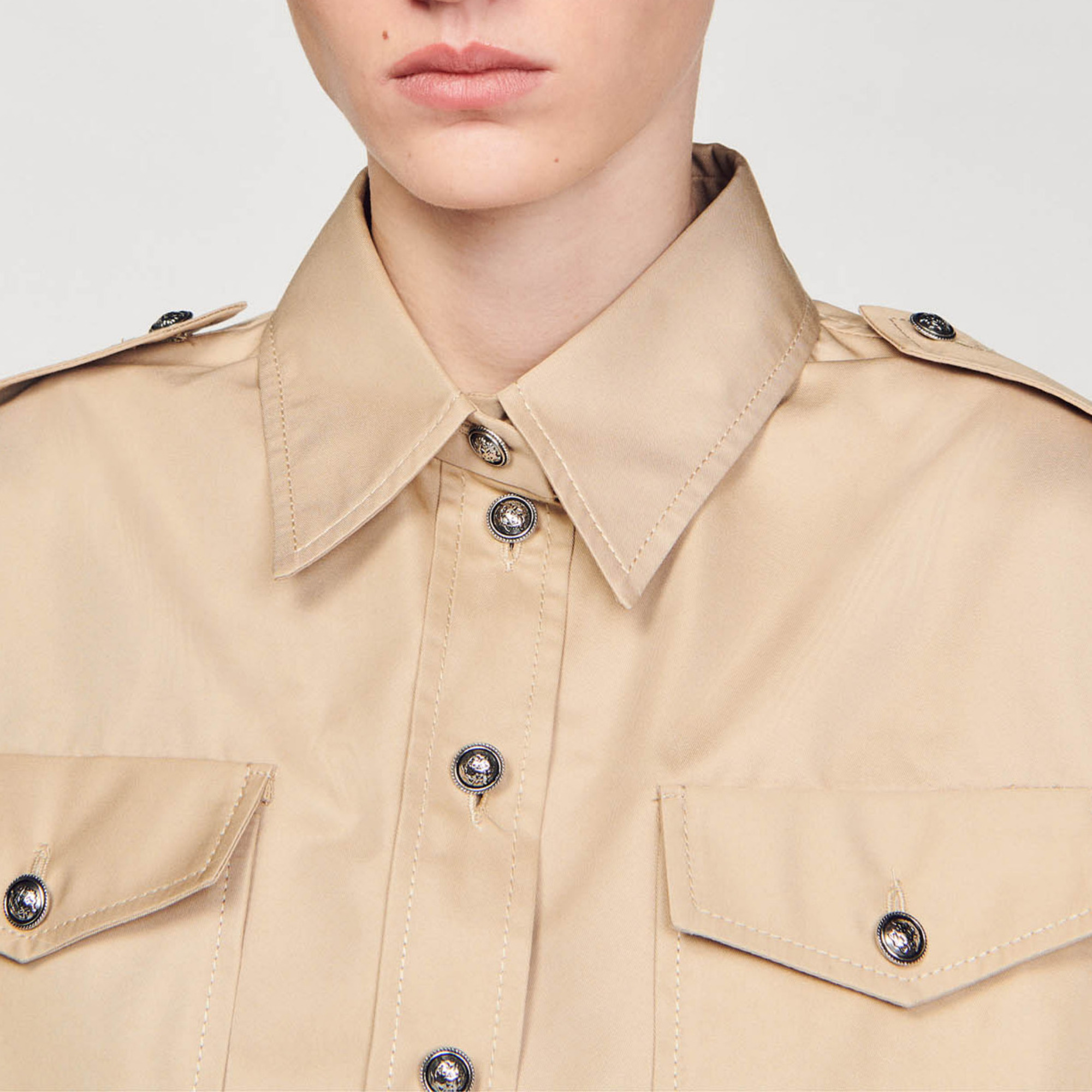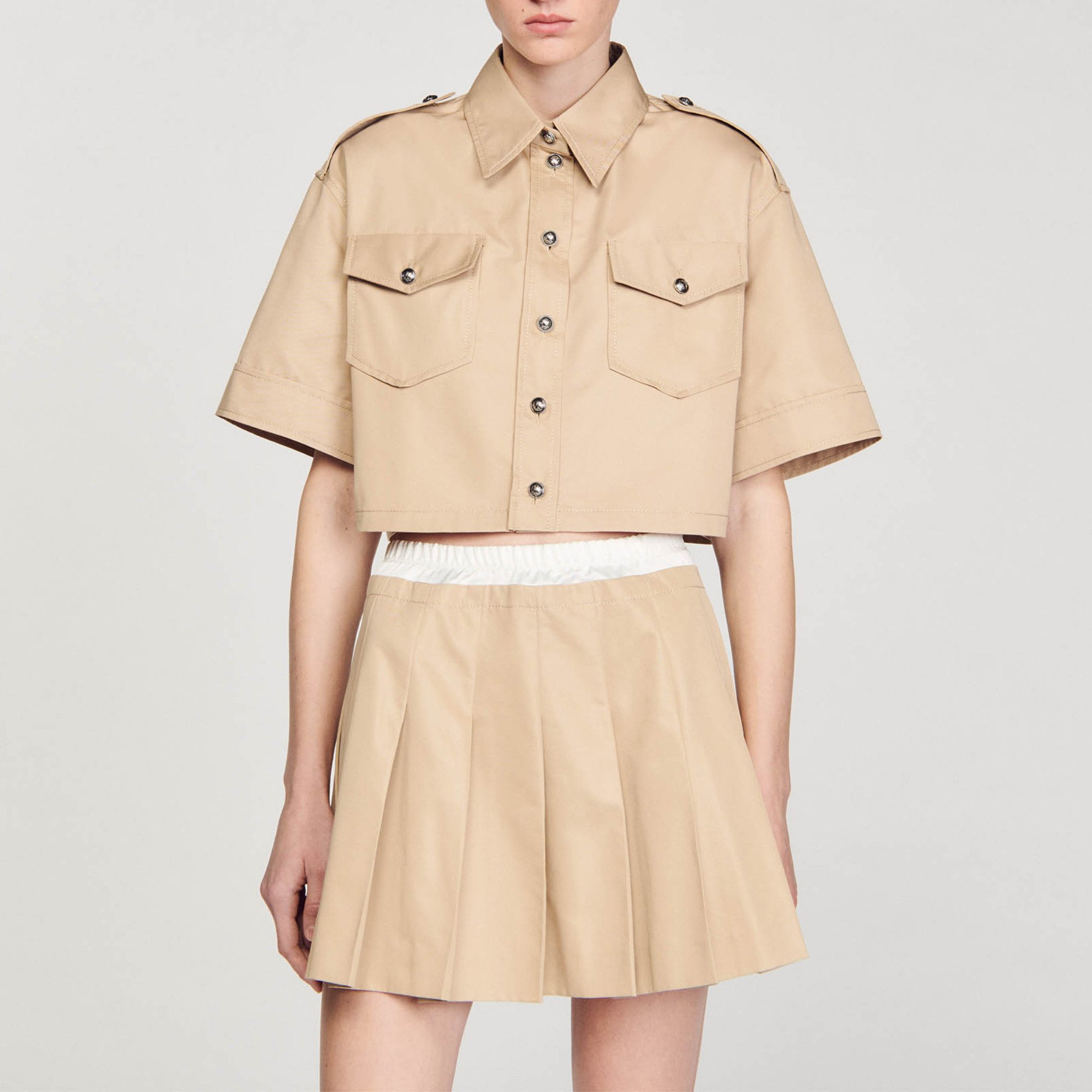 Sandro cotton Officer-style cropped shirt with collar, short sleeves, button fastening and patch pockets on the chest, alongside shoulder plackets.