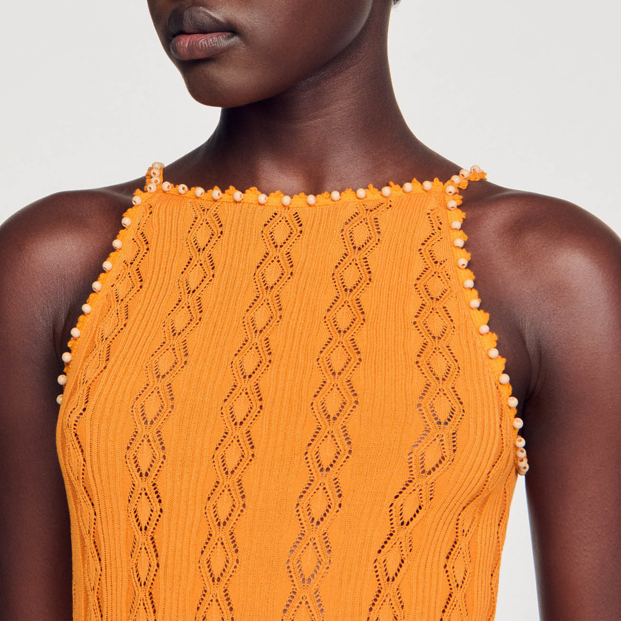 Vest top with American-style armholes, in diamond-shaped pointelle knit, with spaghetti straps embellished with beads.