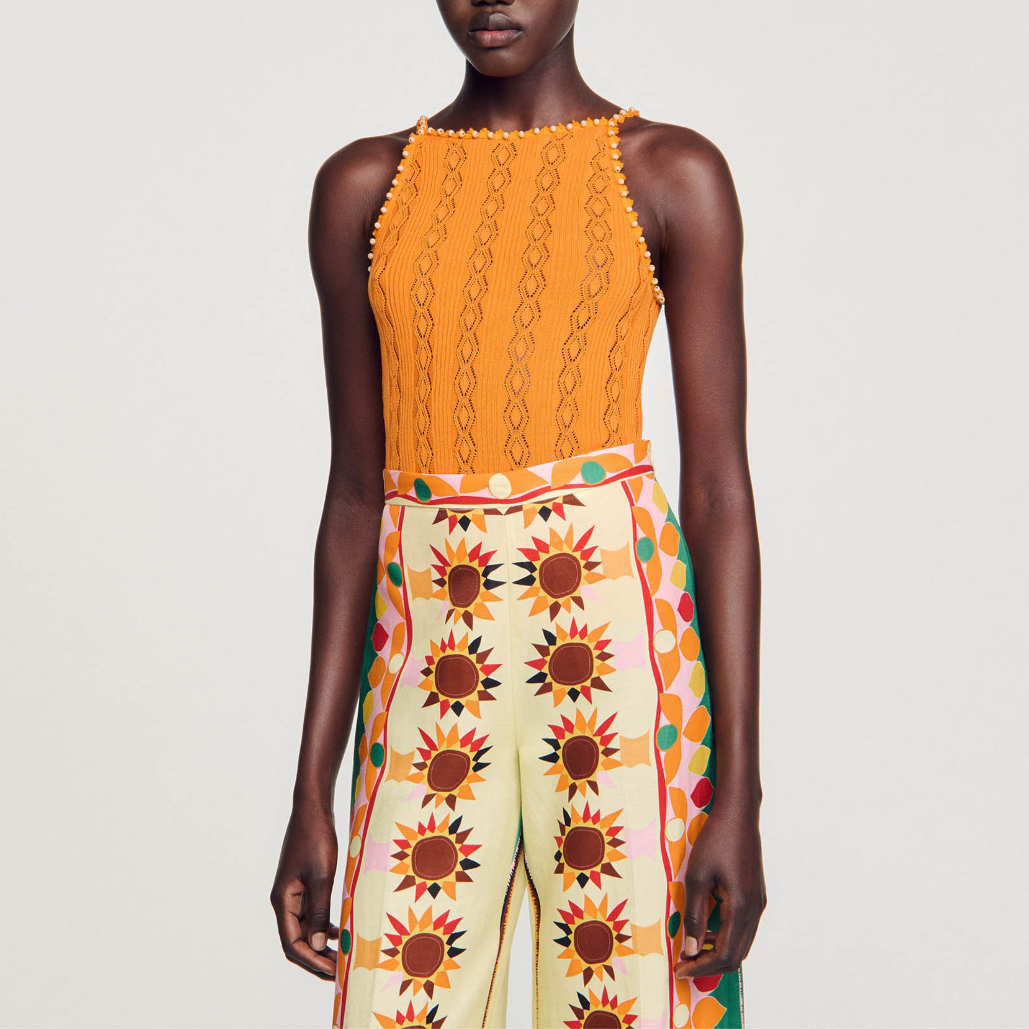 Sandro Women's pointelle knit vest top American armholes Straps with contrasting beading Lozenge pointelle stitch.