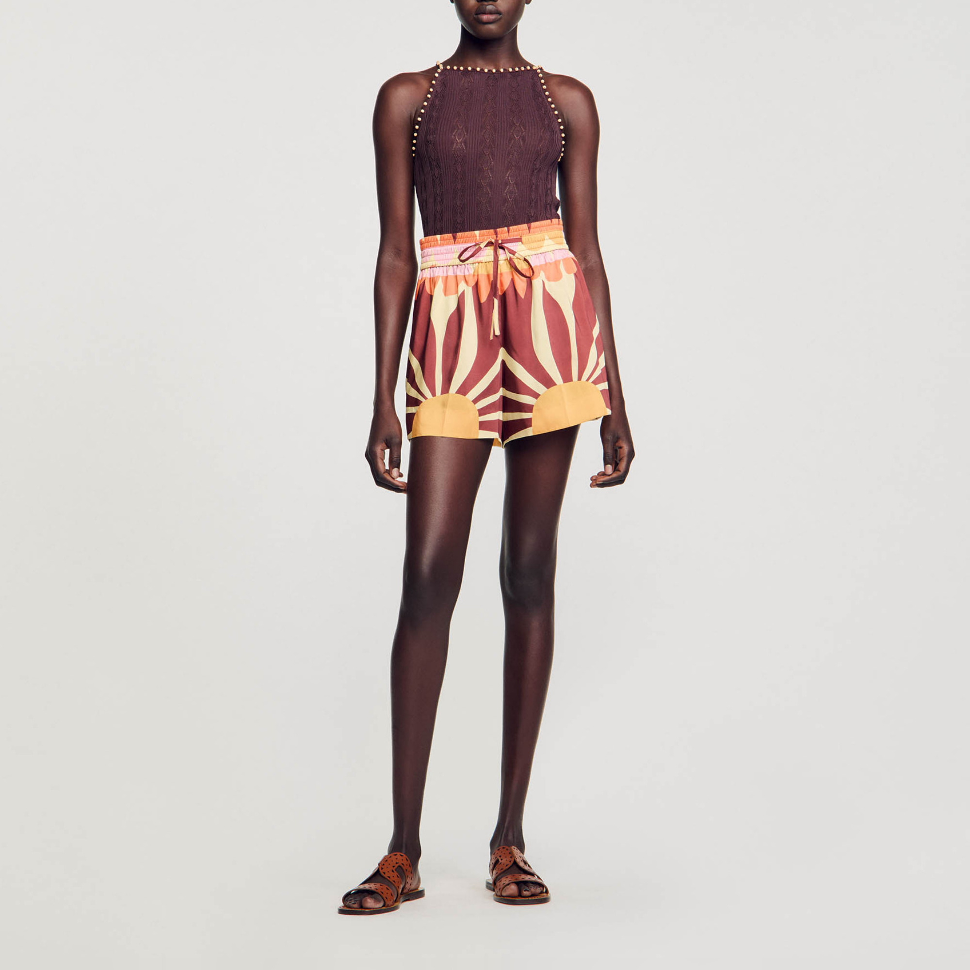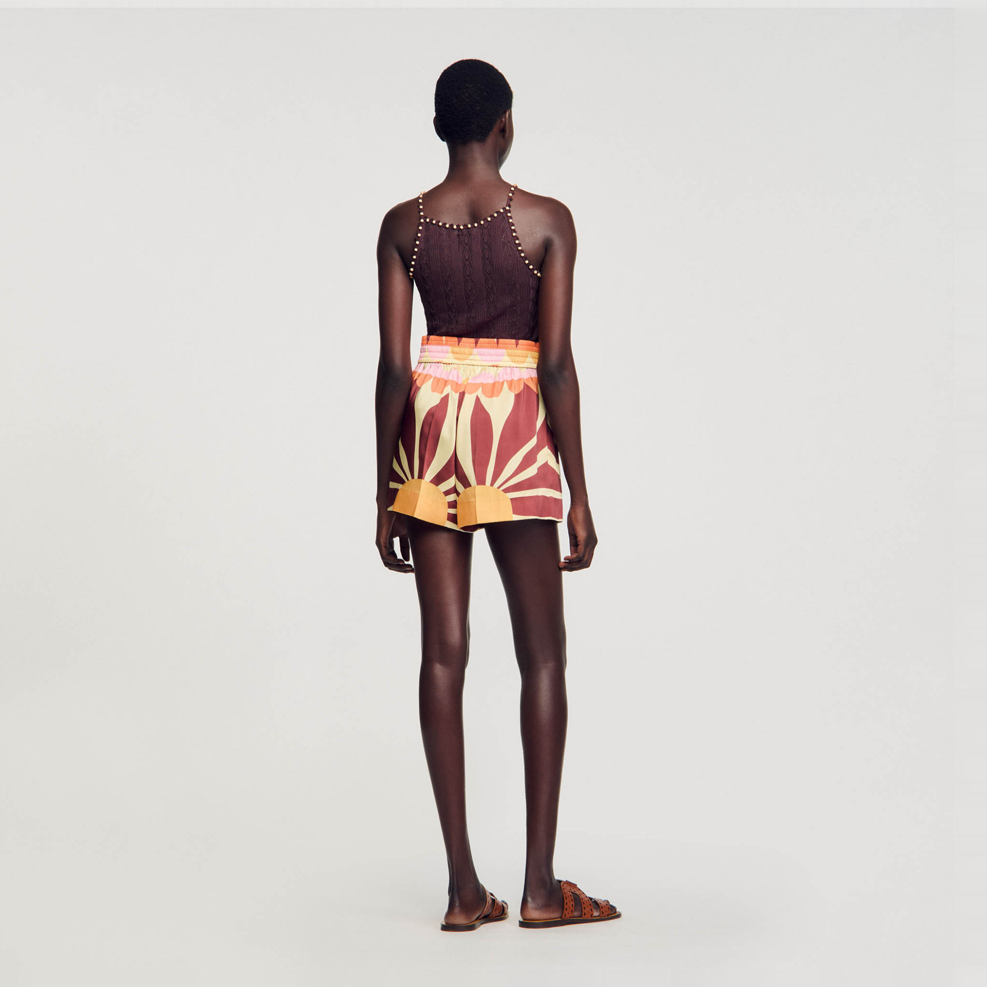 Sleeveless vest top in diamond-shaped pointelle knit, with spaghetti straps embellished with beads.