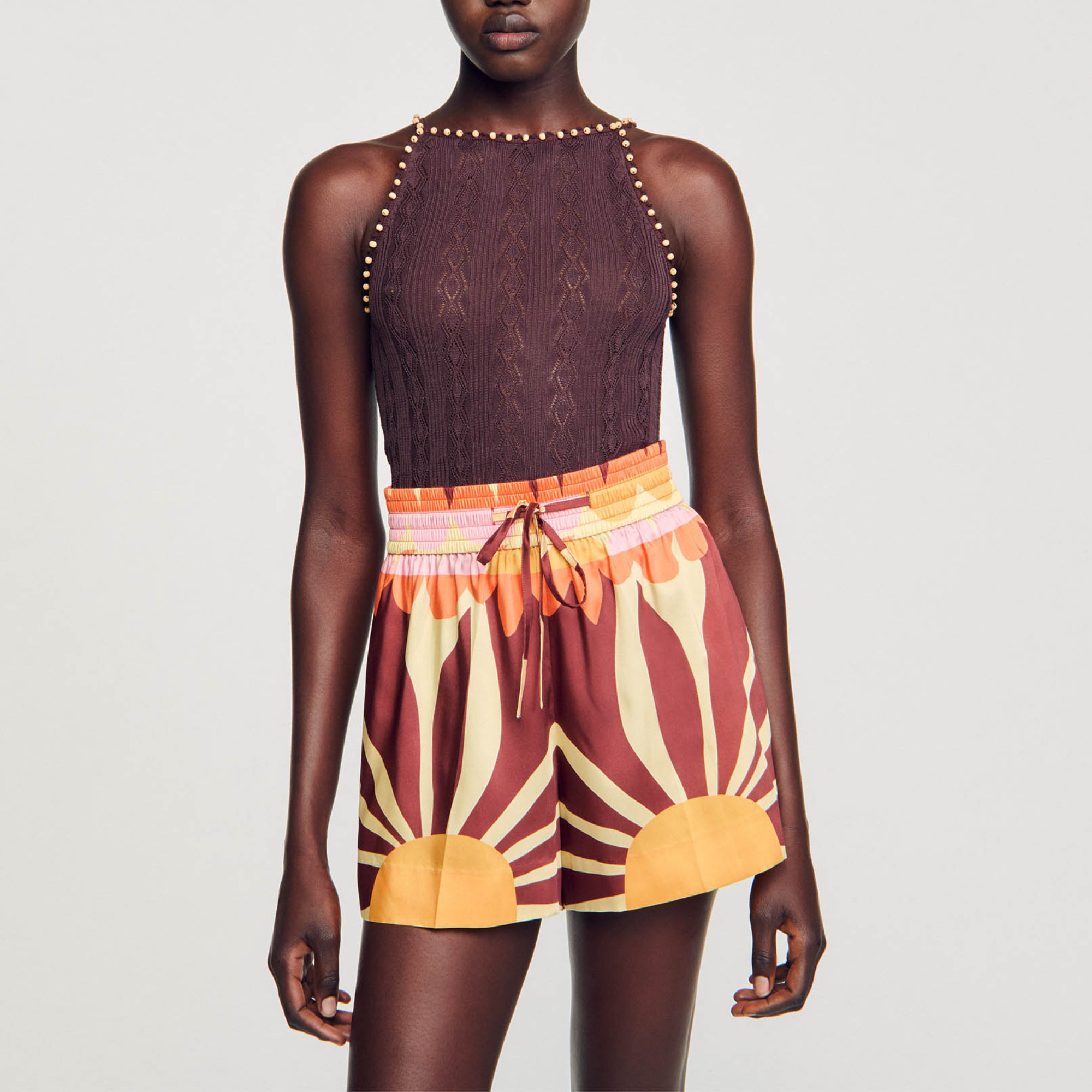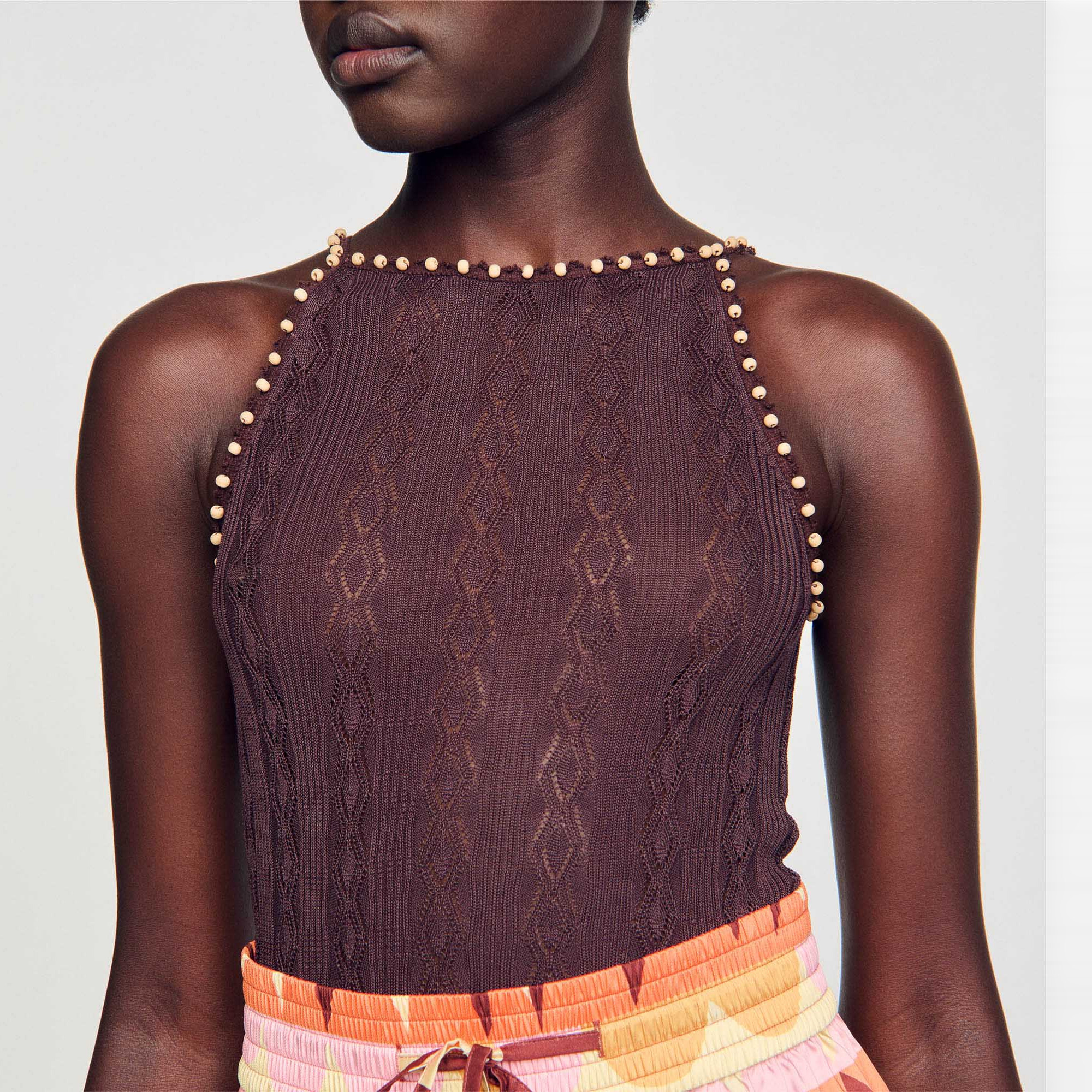 Sandro Women's pointelle knit vest top Sleeveless Straps with contrasting beading Lozenge pointelle stitch.