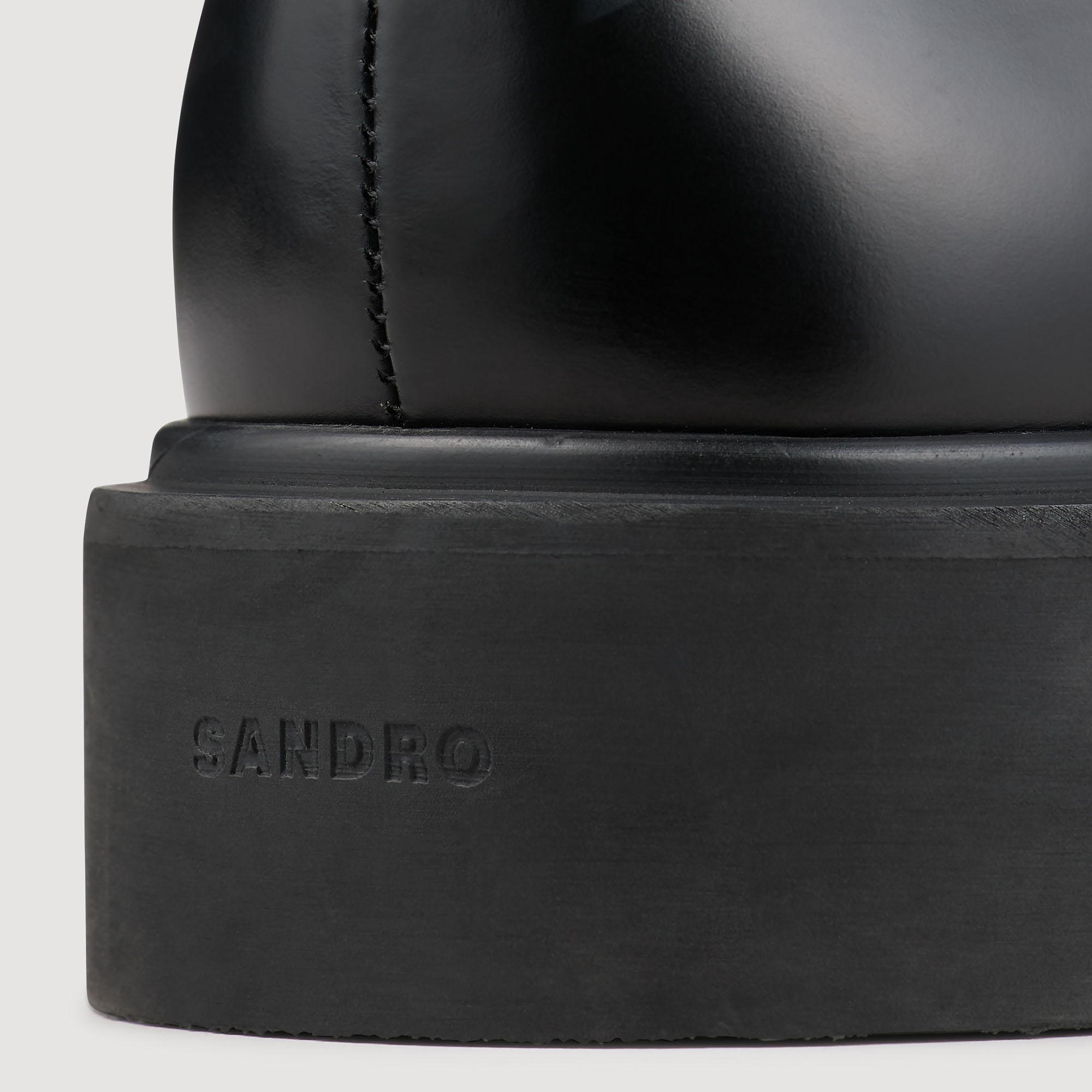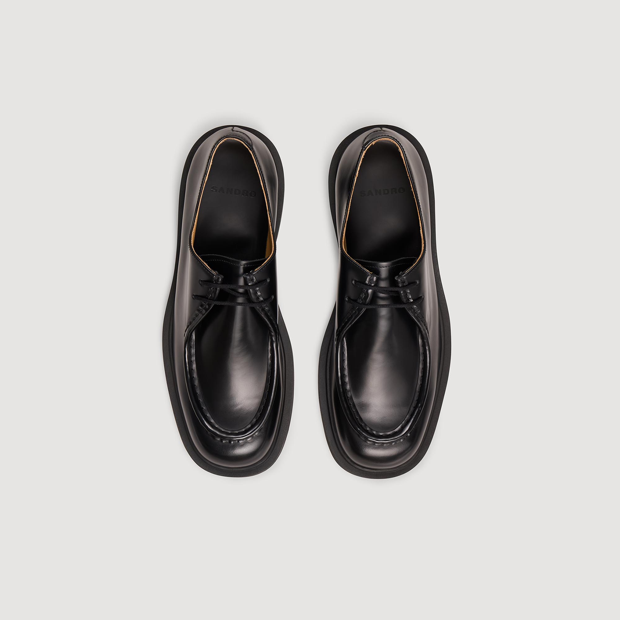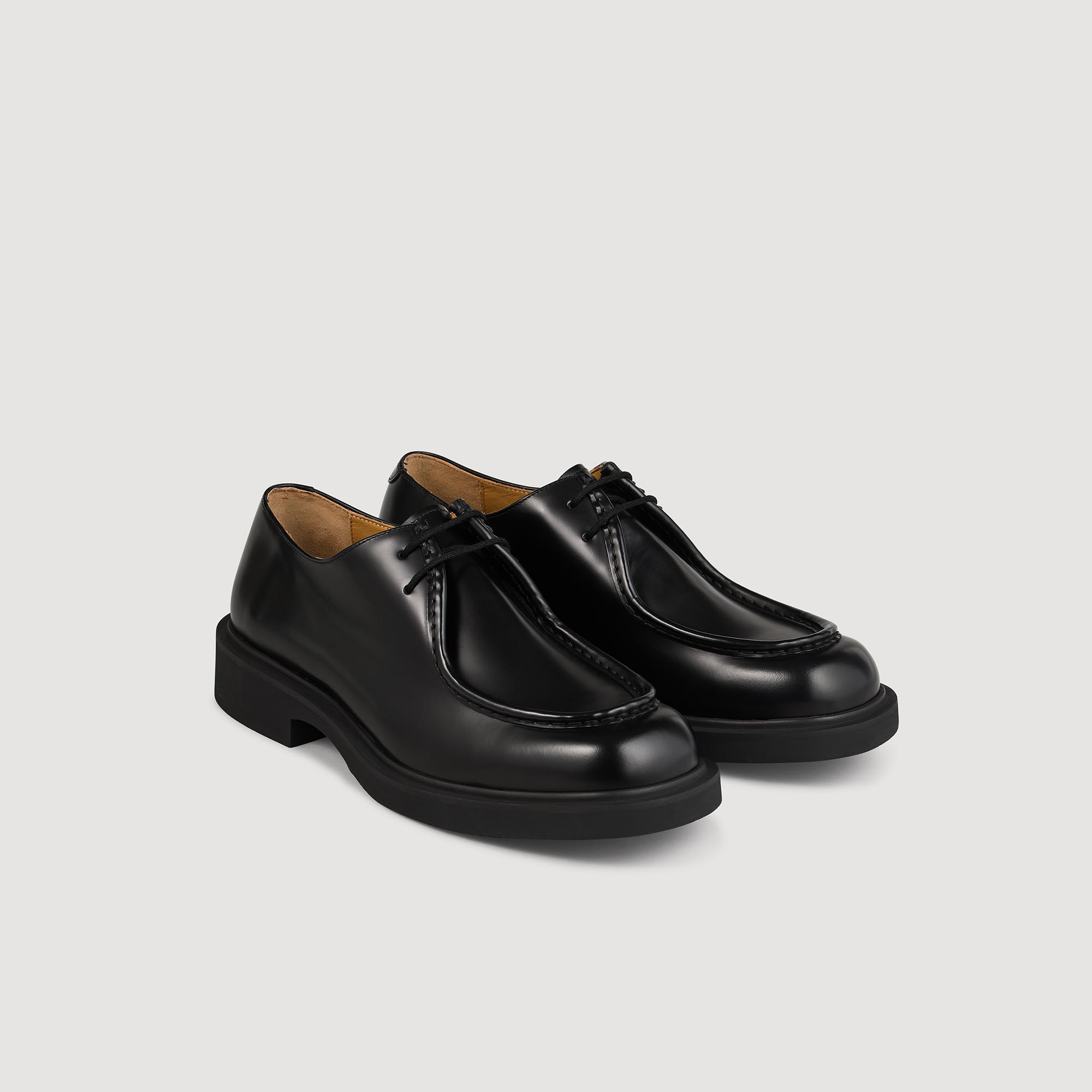 Sandro leather Slightly square-toed patent leather lace-up dress shoes with rubber soles and heels featuring a Sandro logo on the back.