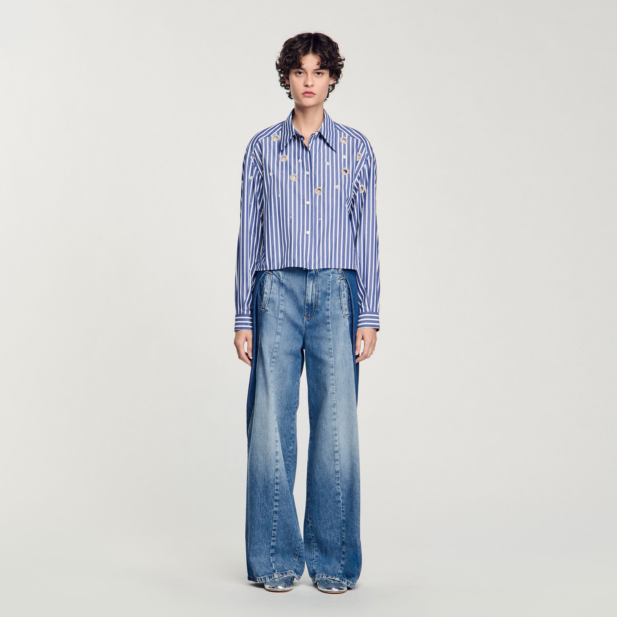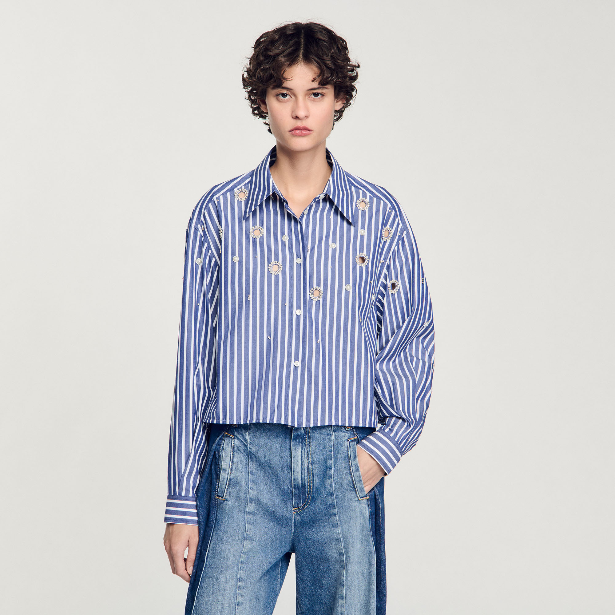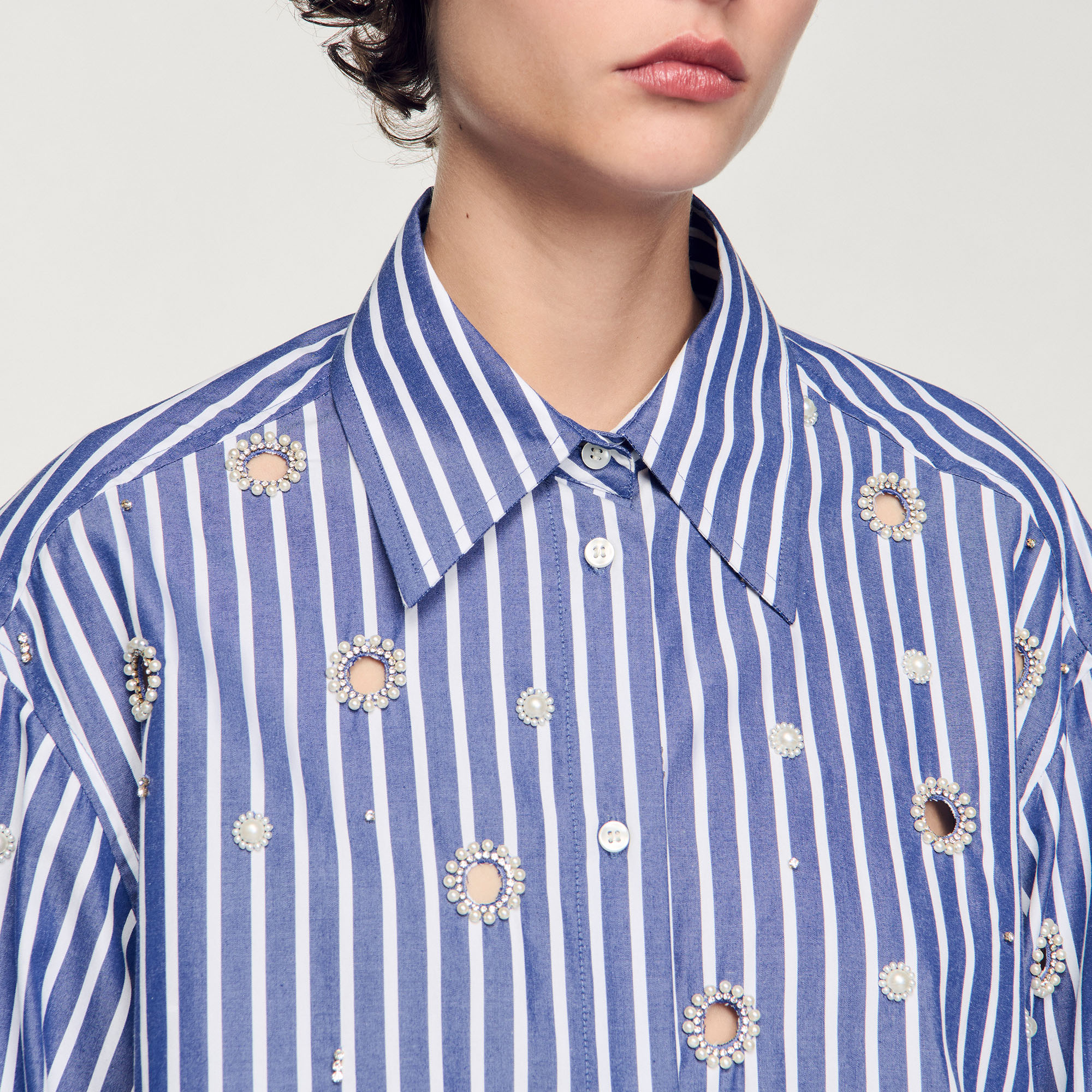 Sandro cotton Striped shirt with classic collar, long sleeves with buttoned cuffs, button placket and featuring circular cutouts with pearl bead and rhinestone edging.