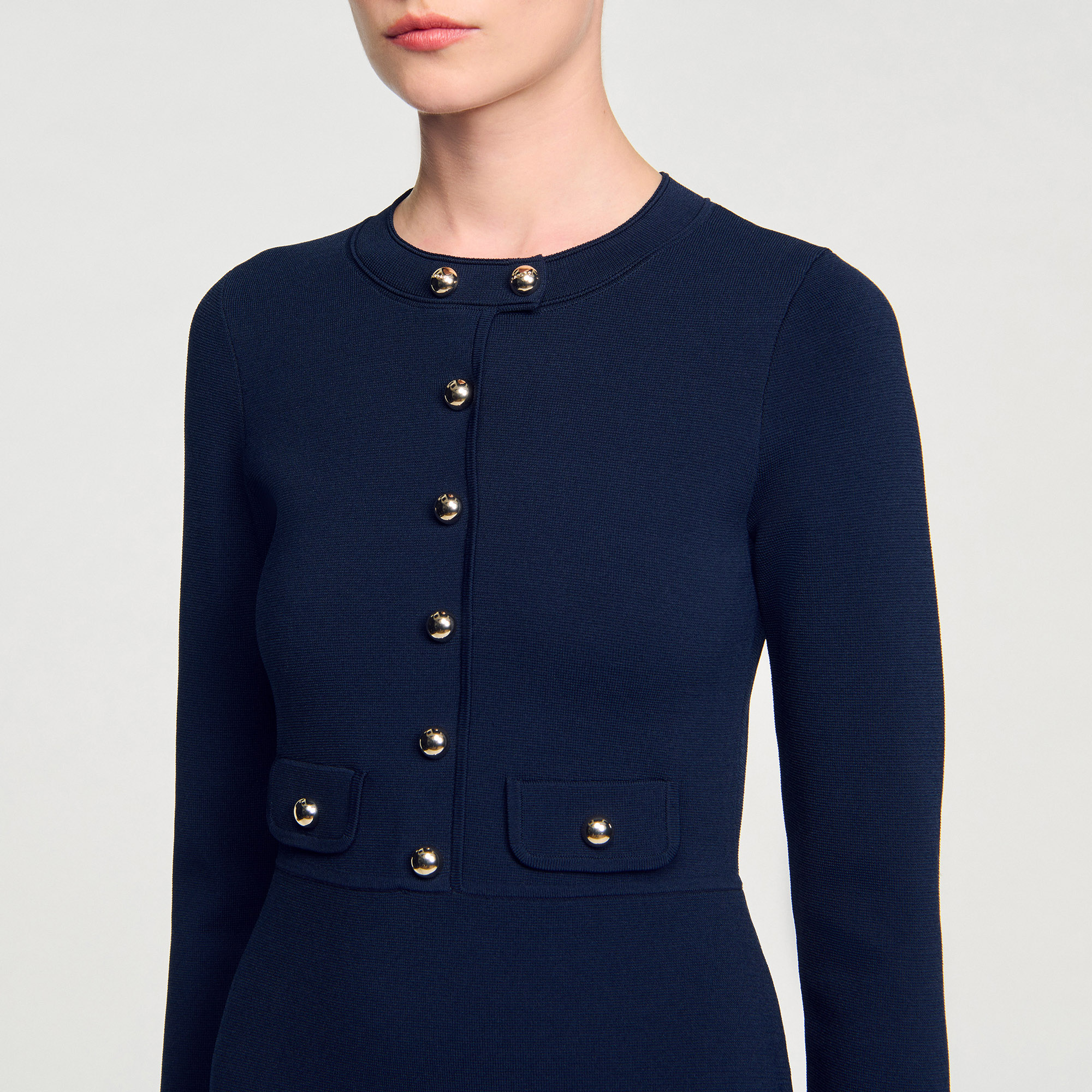Sandro viscose Mini knit dress with round neck, long sleeves, button placket and flap pockets.