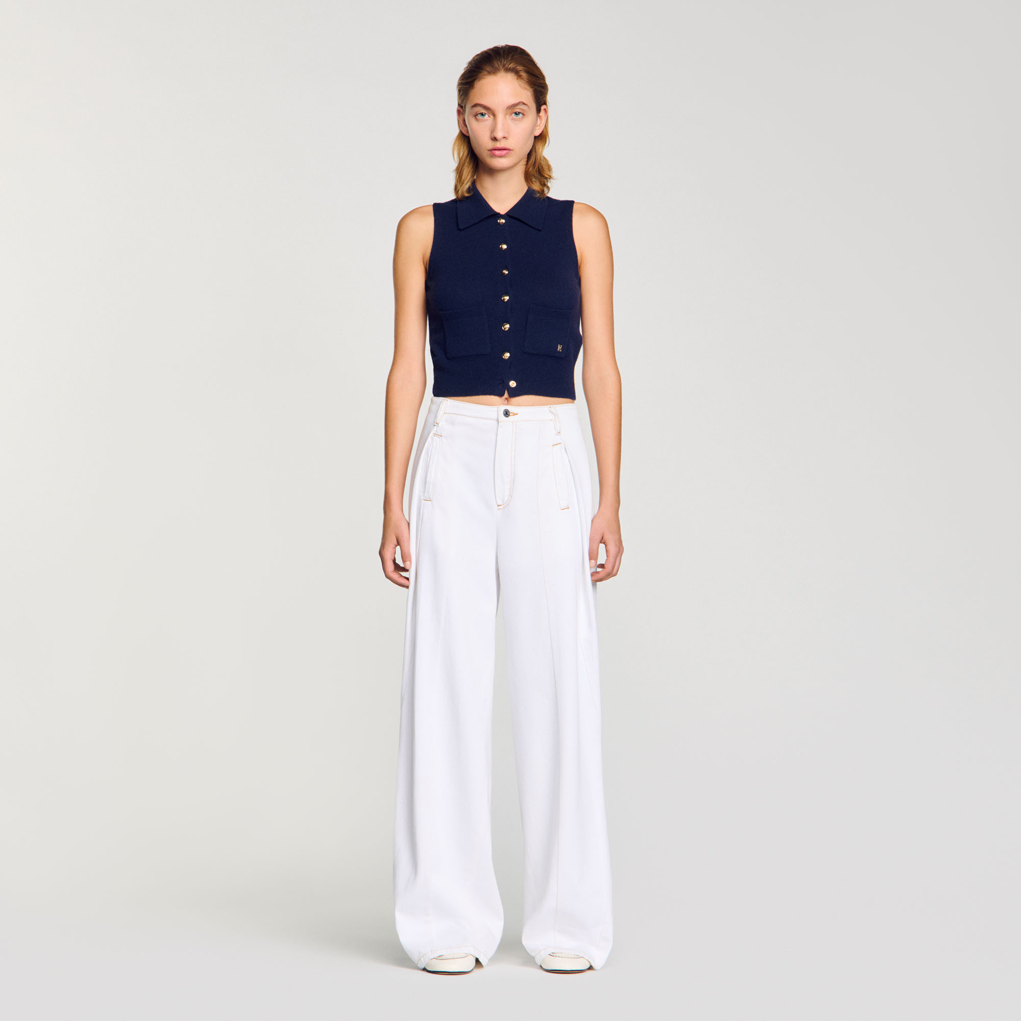 Sandro cotton Wide-leg jeans with pleats and topstitched details, with front and back pockets.