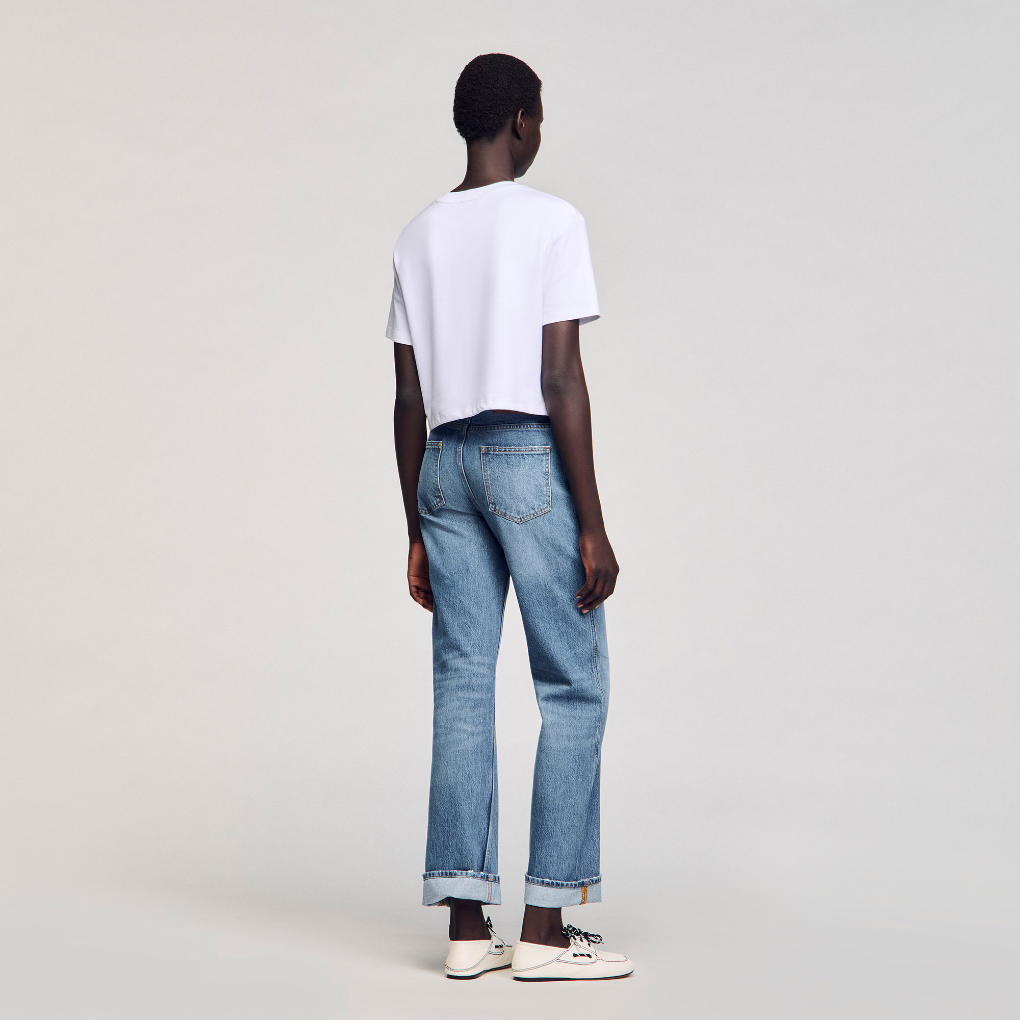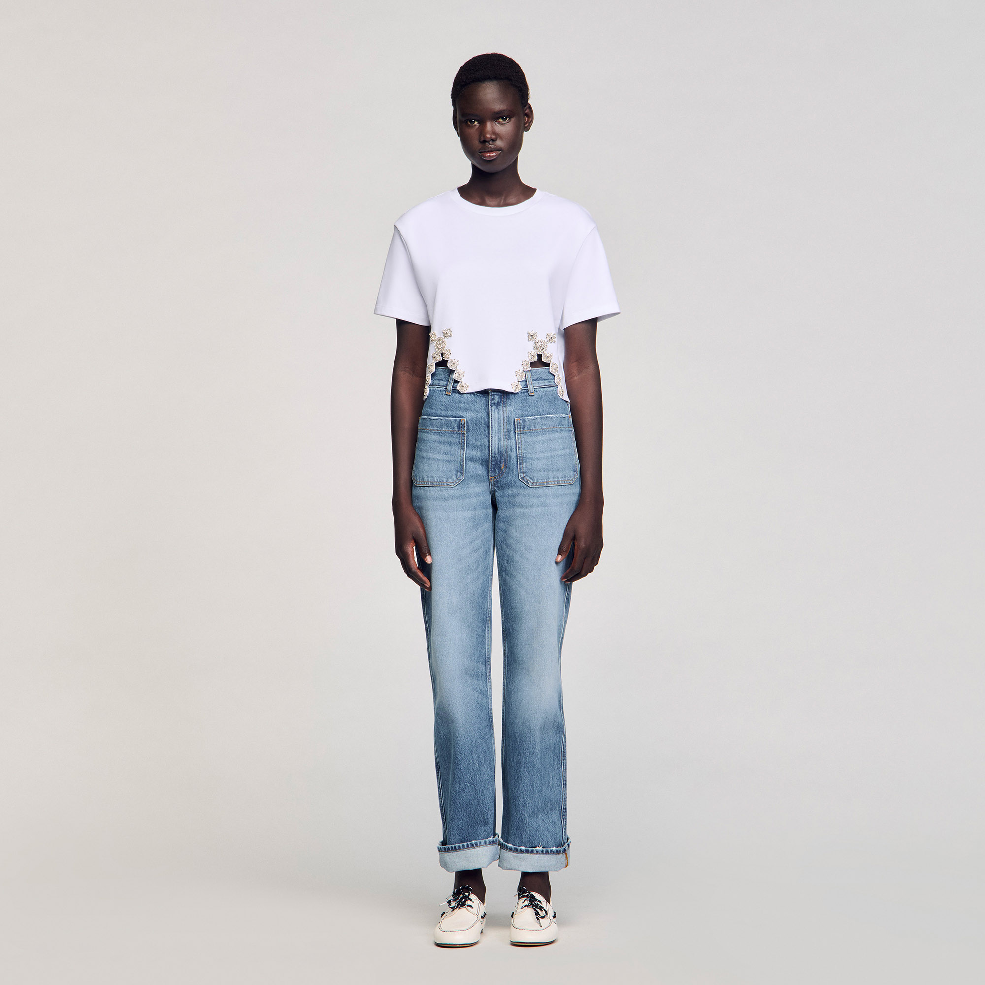 Sandro Women's cropped T-shirt Round neck Short sleeves Front slits Crystal embroidery Cropped fit.