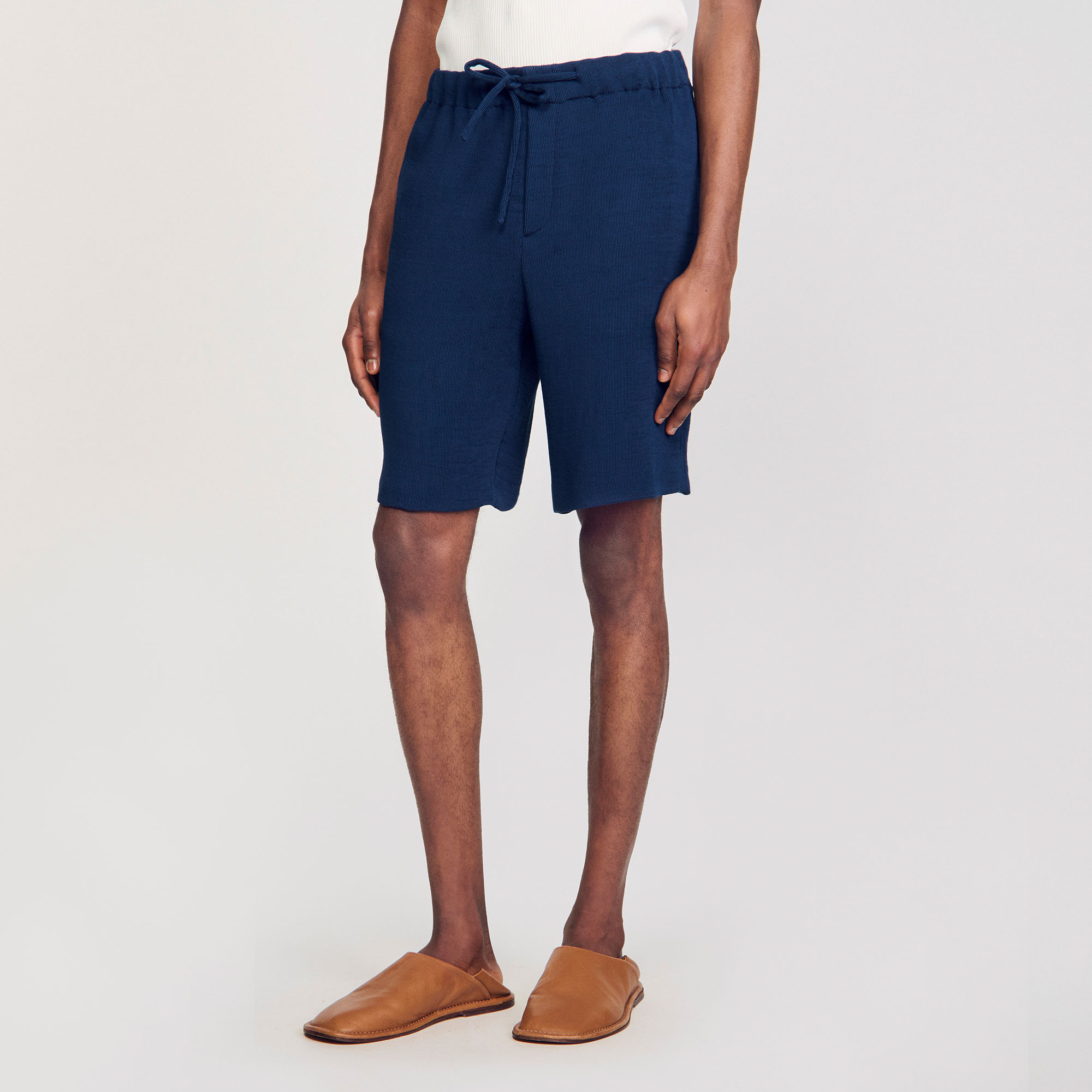Sandro Men's pleated Bermuda shorts Elasticated waist and drawstring Fly 2 pockets Welt pockets on back Designed for a loose fit.