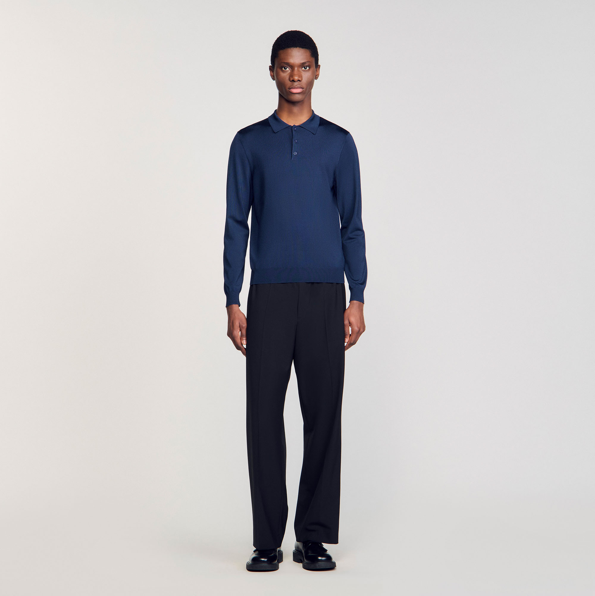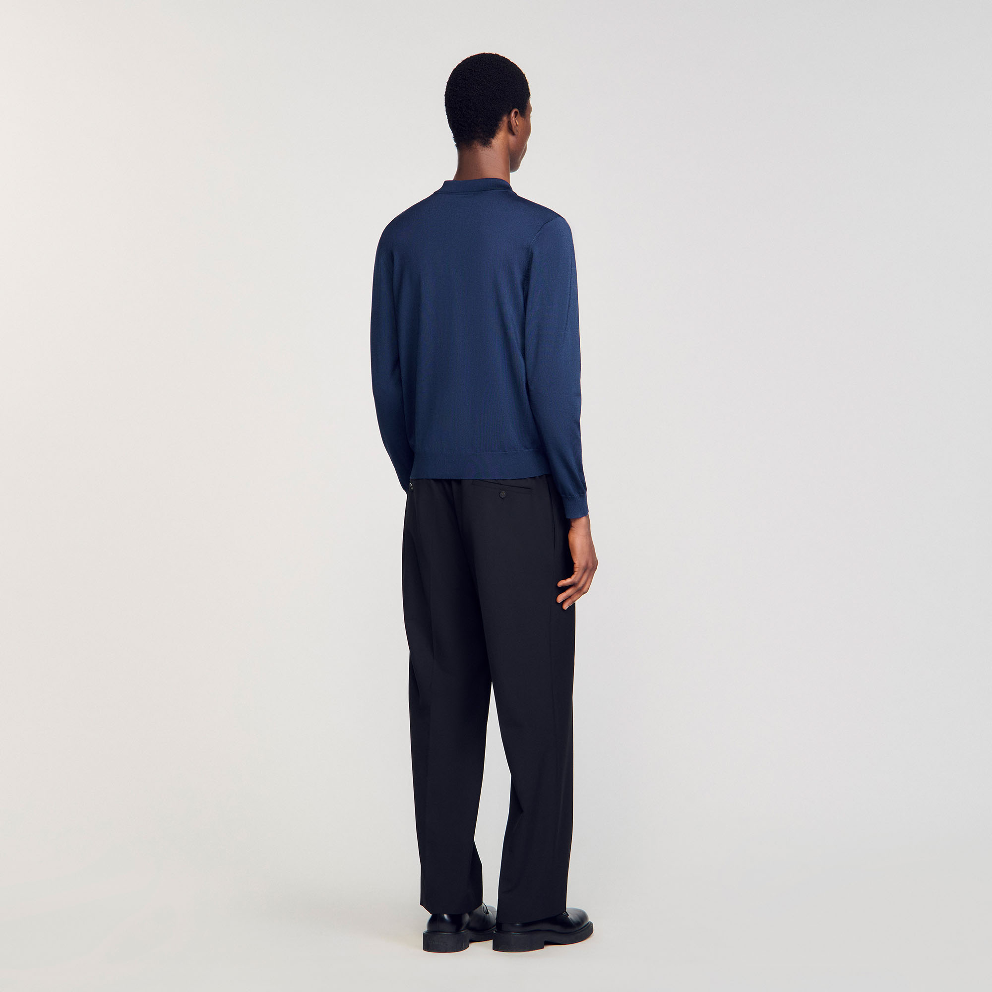 Sandro acetate Long-sleeved rib knit polo shirt with button-down collar.
