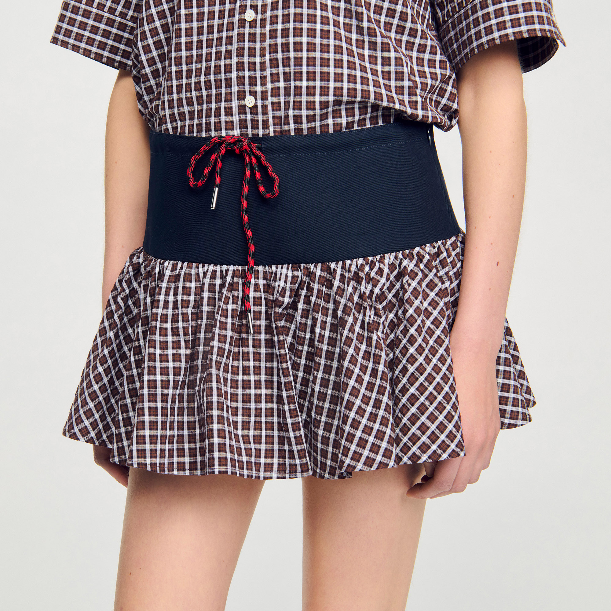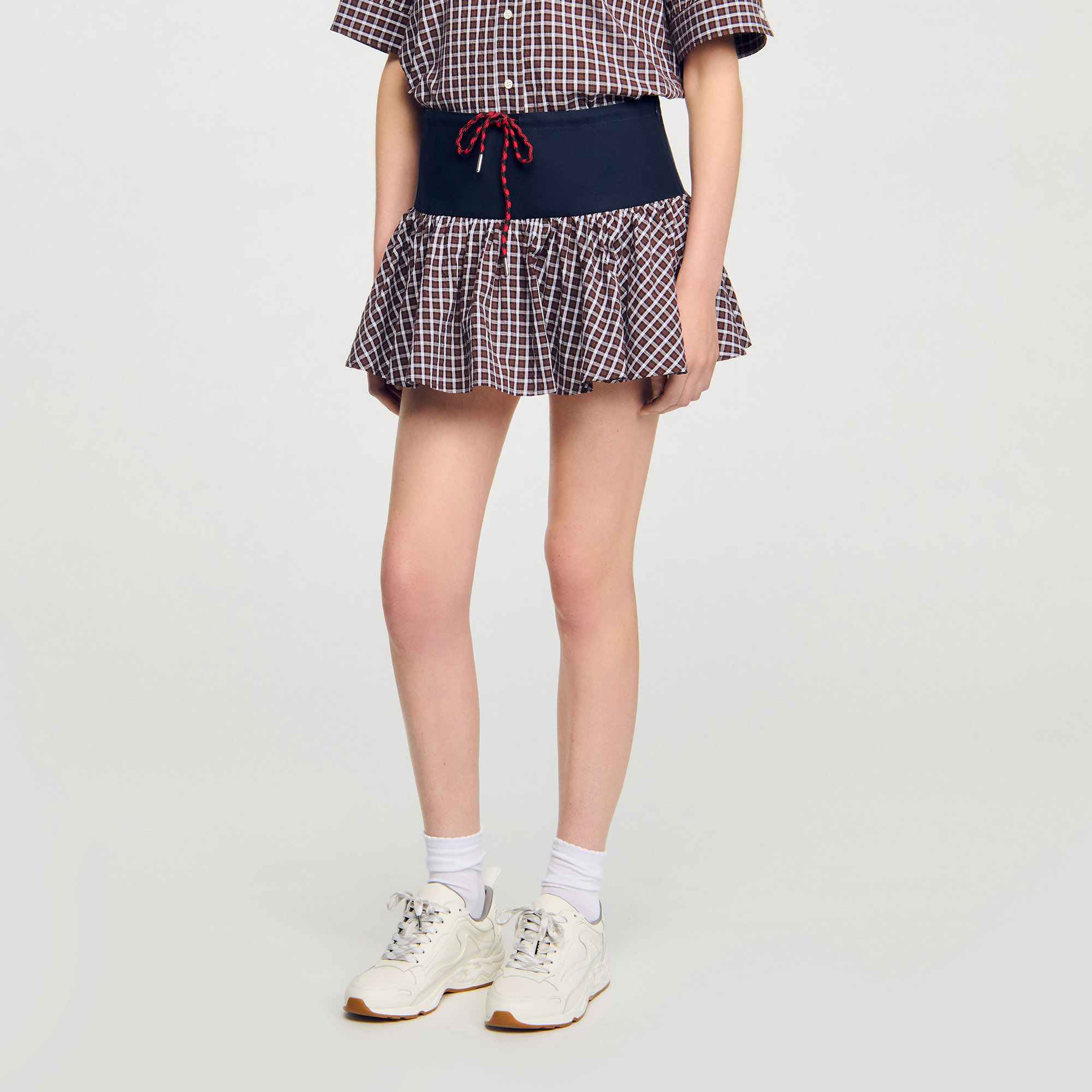 Sandro cotton Skort with a plain band and drawstring waist, featuring a small check ruffle at the hem.