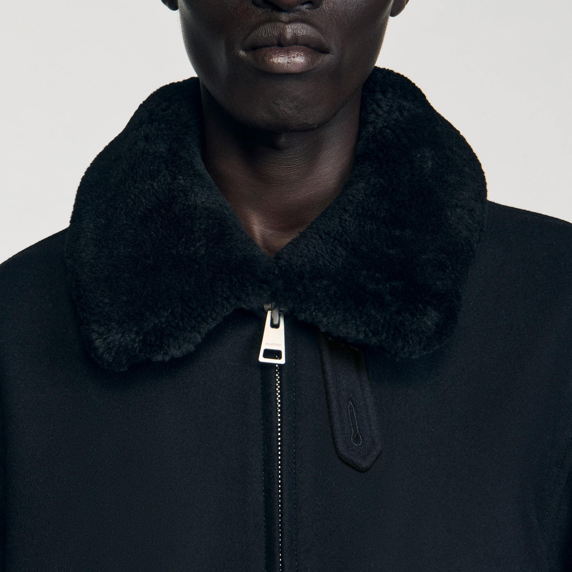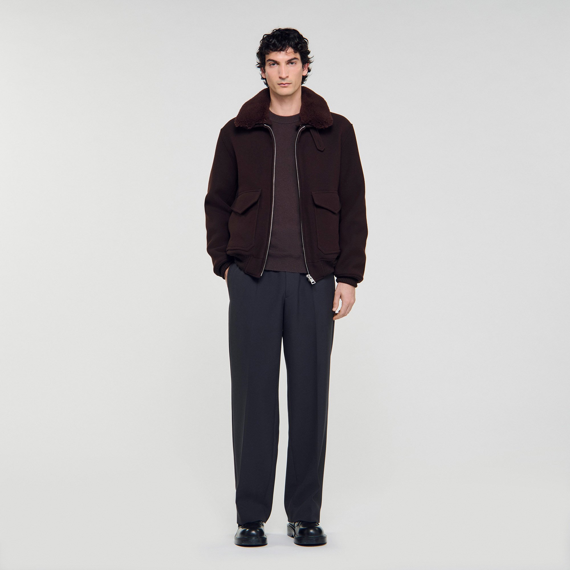 Sandro wool Italian wool broadcloth aviator jacket with removable shearling collar, zip fastening and flap pockets.