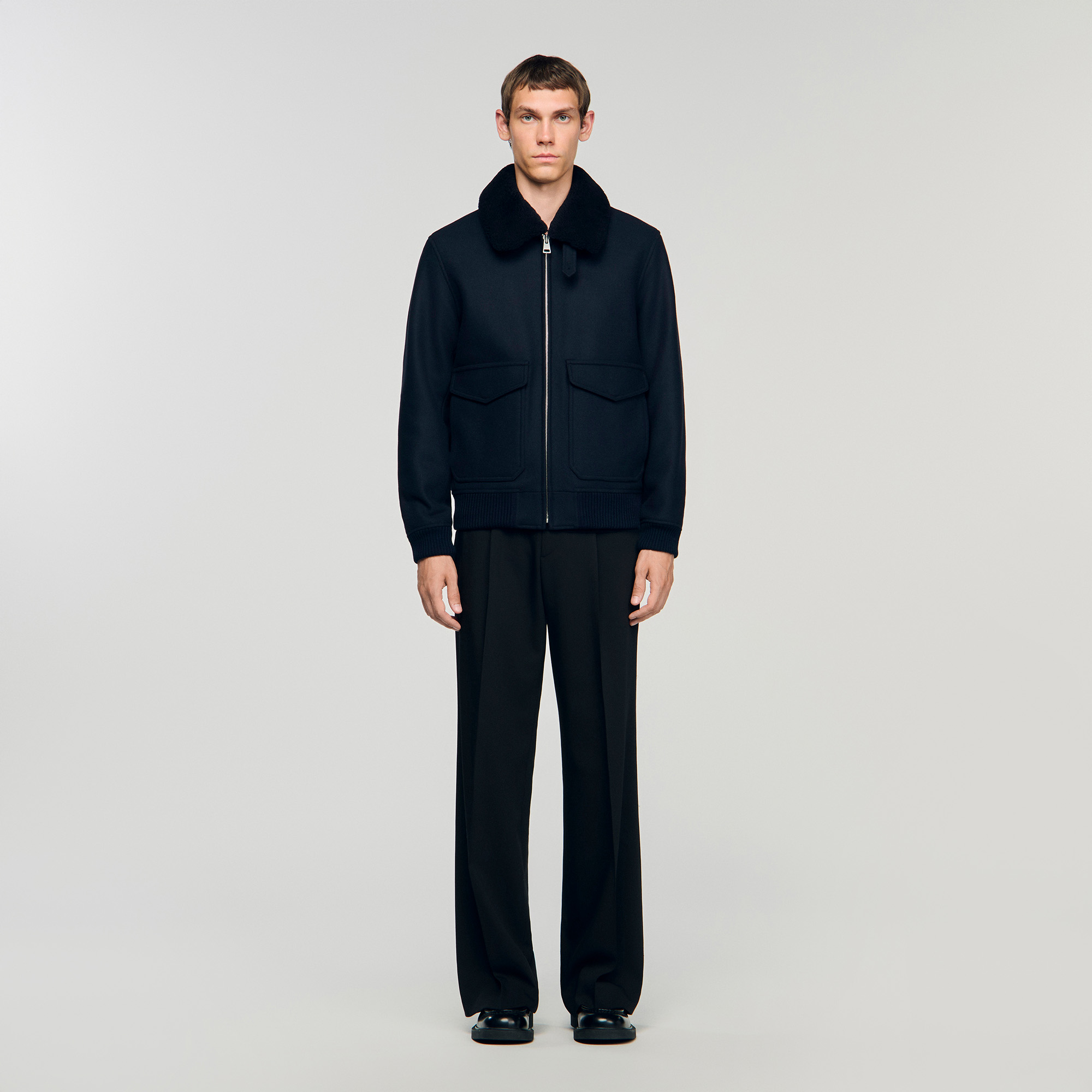 Sandro wool Italian wool broadcloth aviator jacket with removable shearling collar, zip fastening and flap pockets.