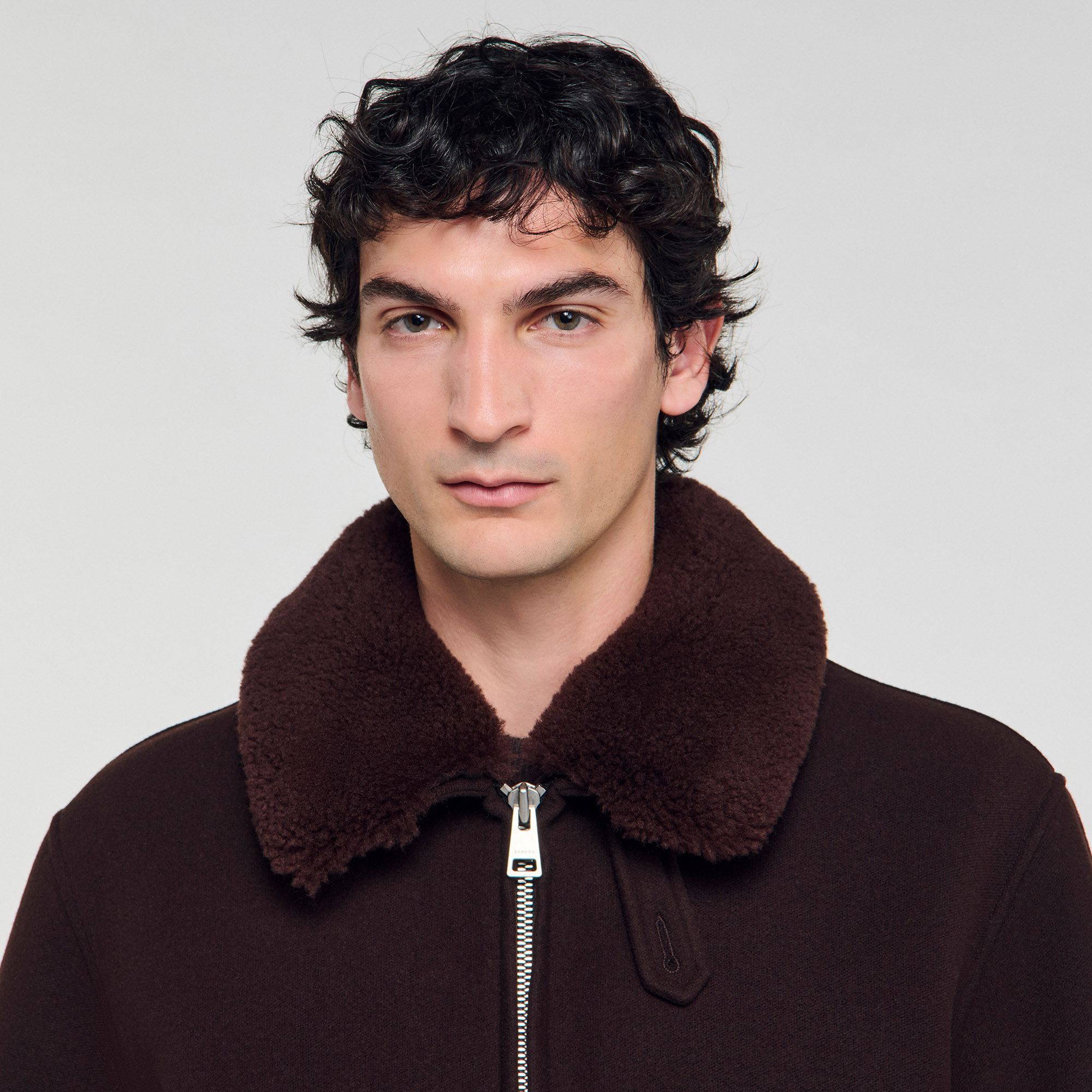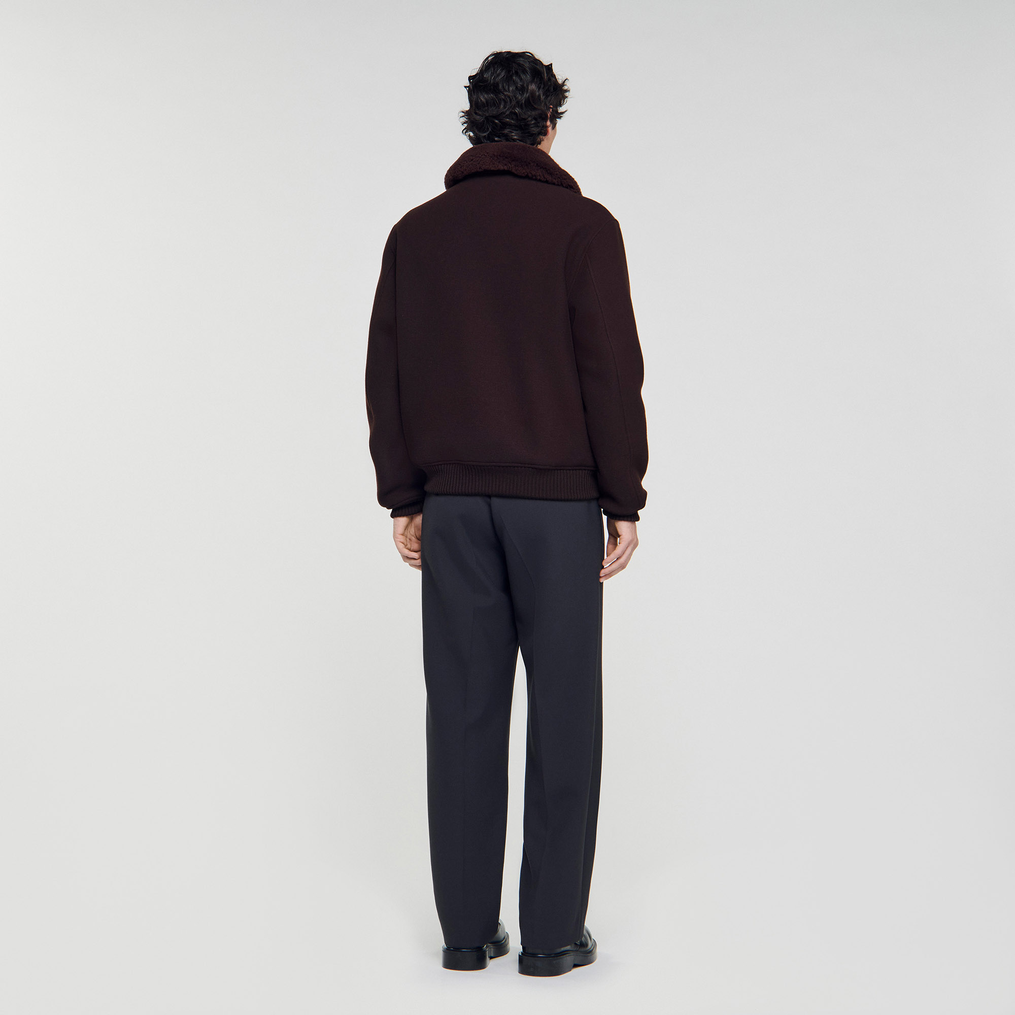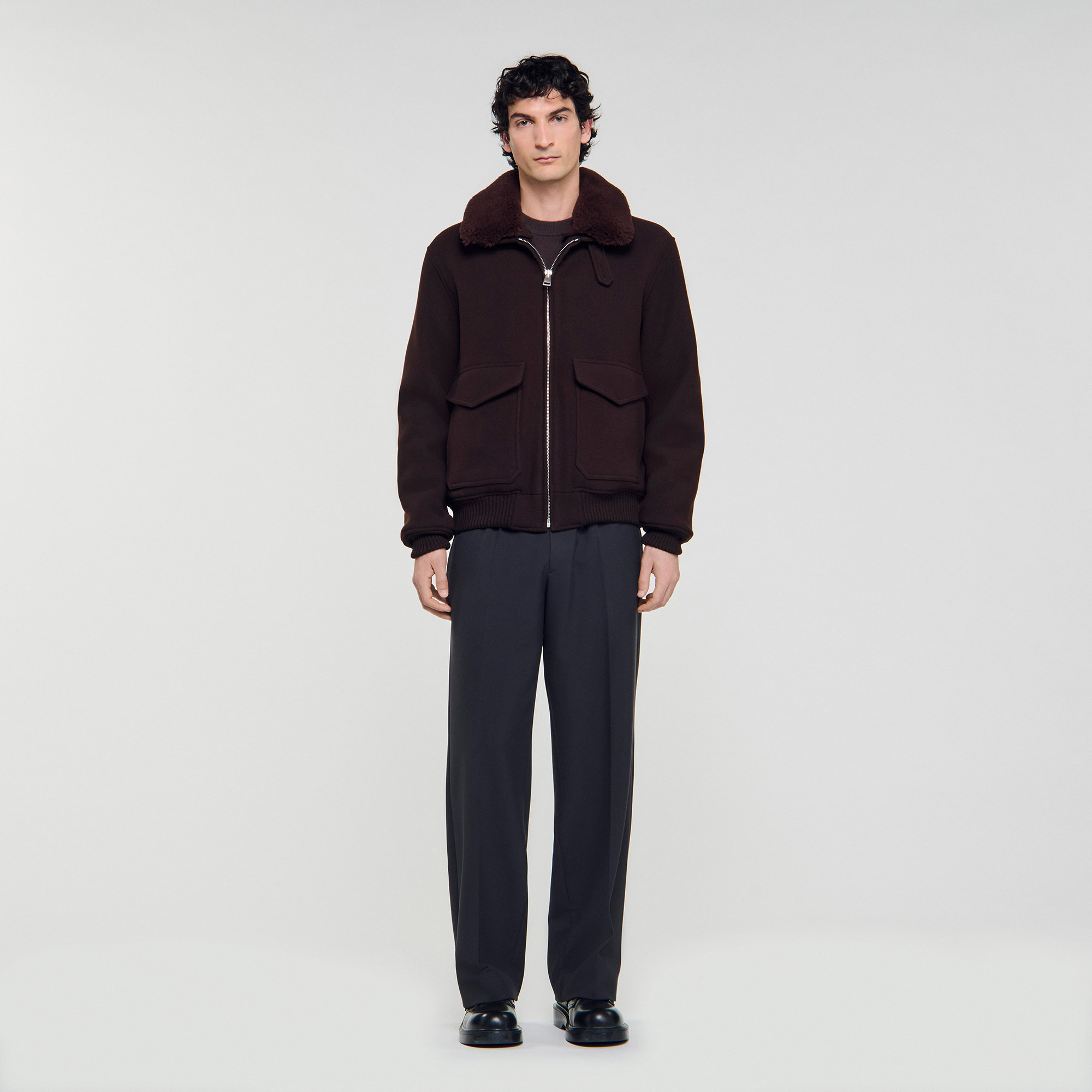 Sandro wool Italian wool broadcloth aviator jacket with removable shearling collar, zip fastening and flap pockets.