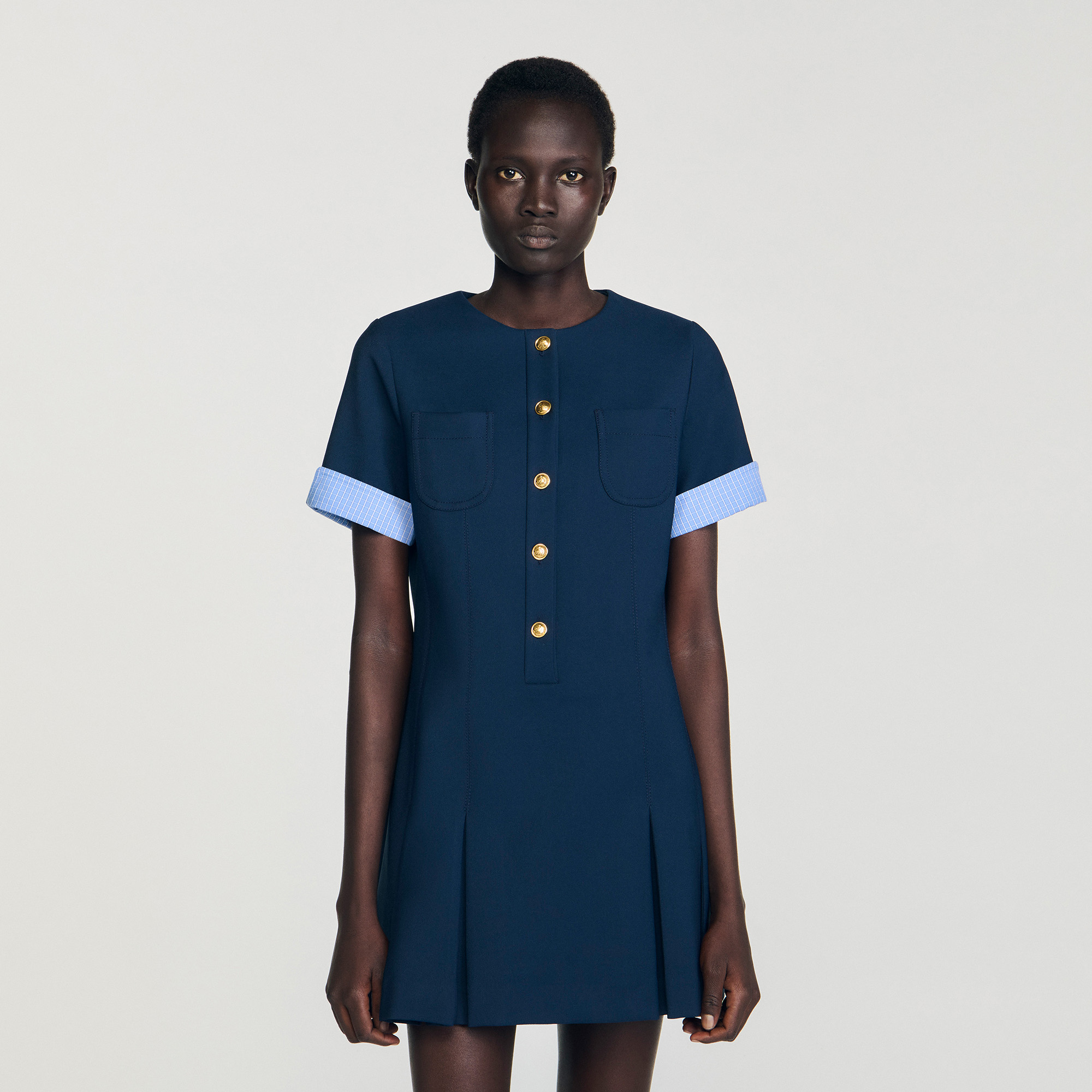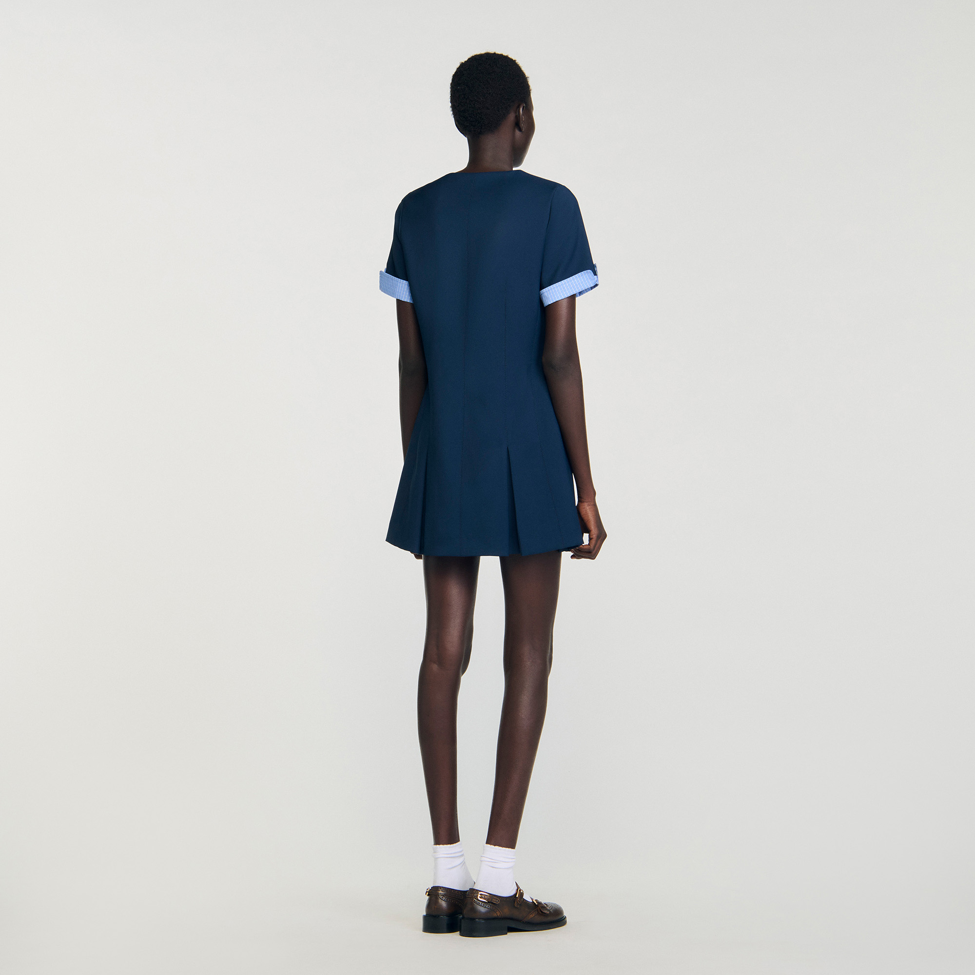 Sandro polyester Mini pleated dress with a round neck, short sleeves with a checkered cuff and a button placket.