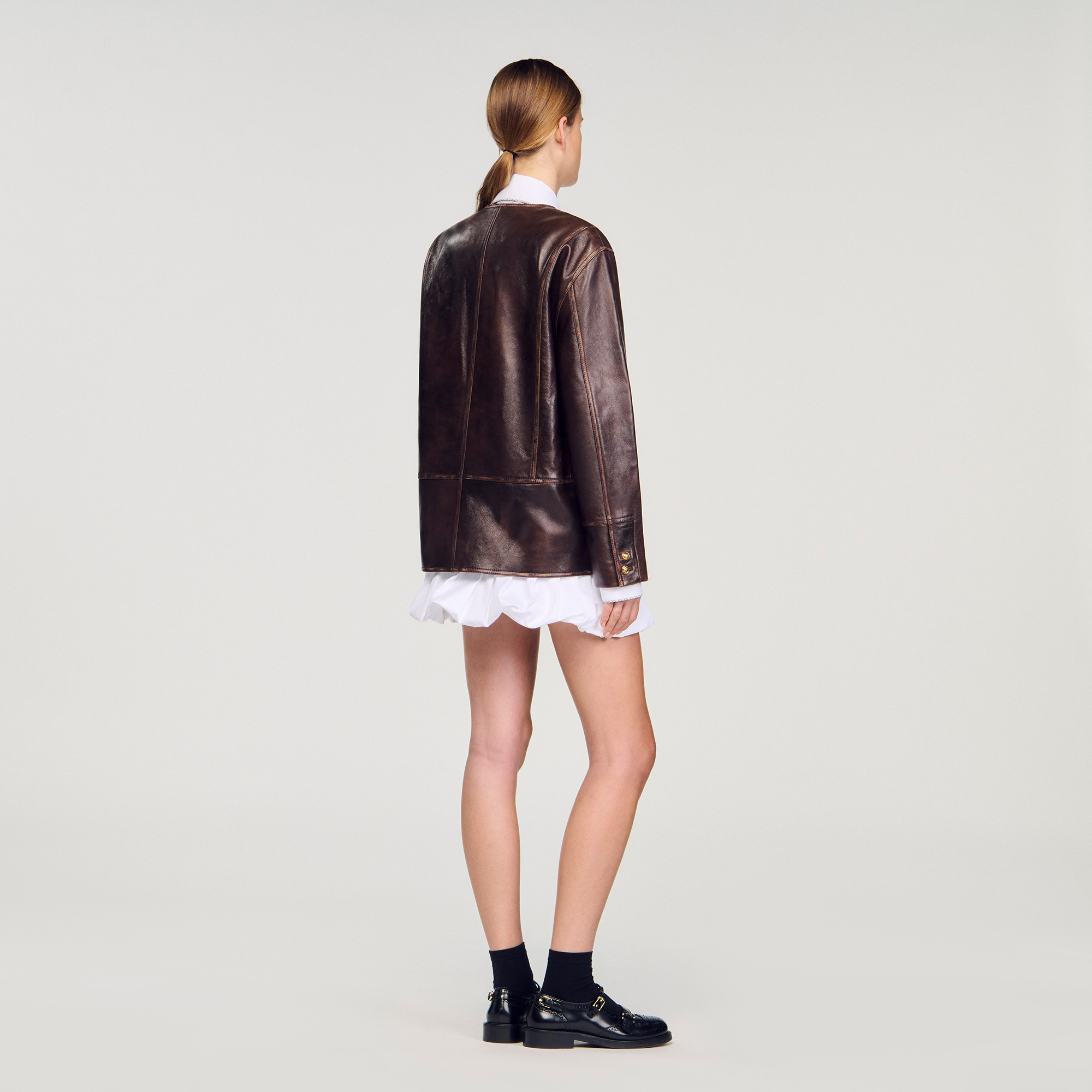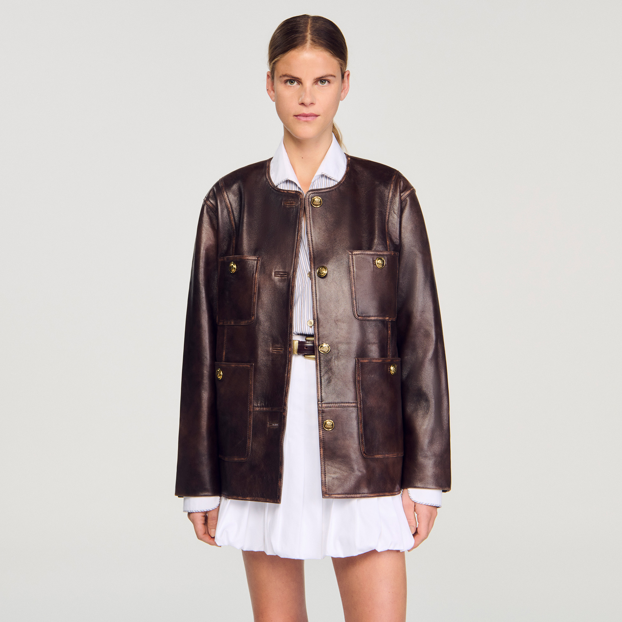 Sandro leather Long jacket-style distressed leather jacket with a round collar, long sleeves, buttoned patch pockets on the chest and hips, and embellished with decorative metal buttons.