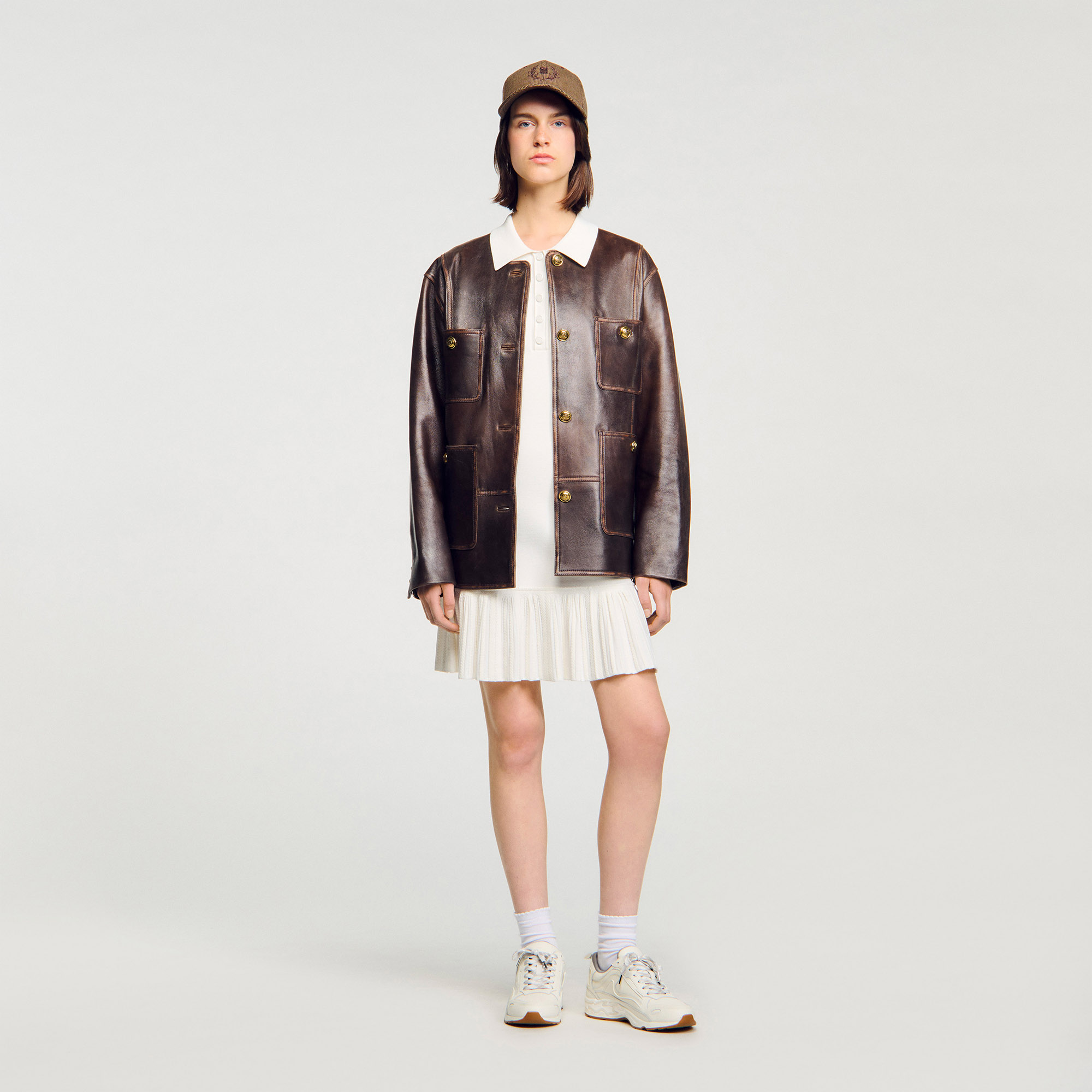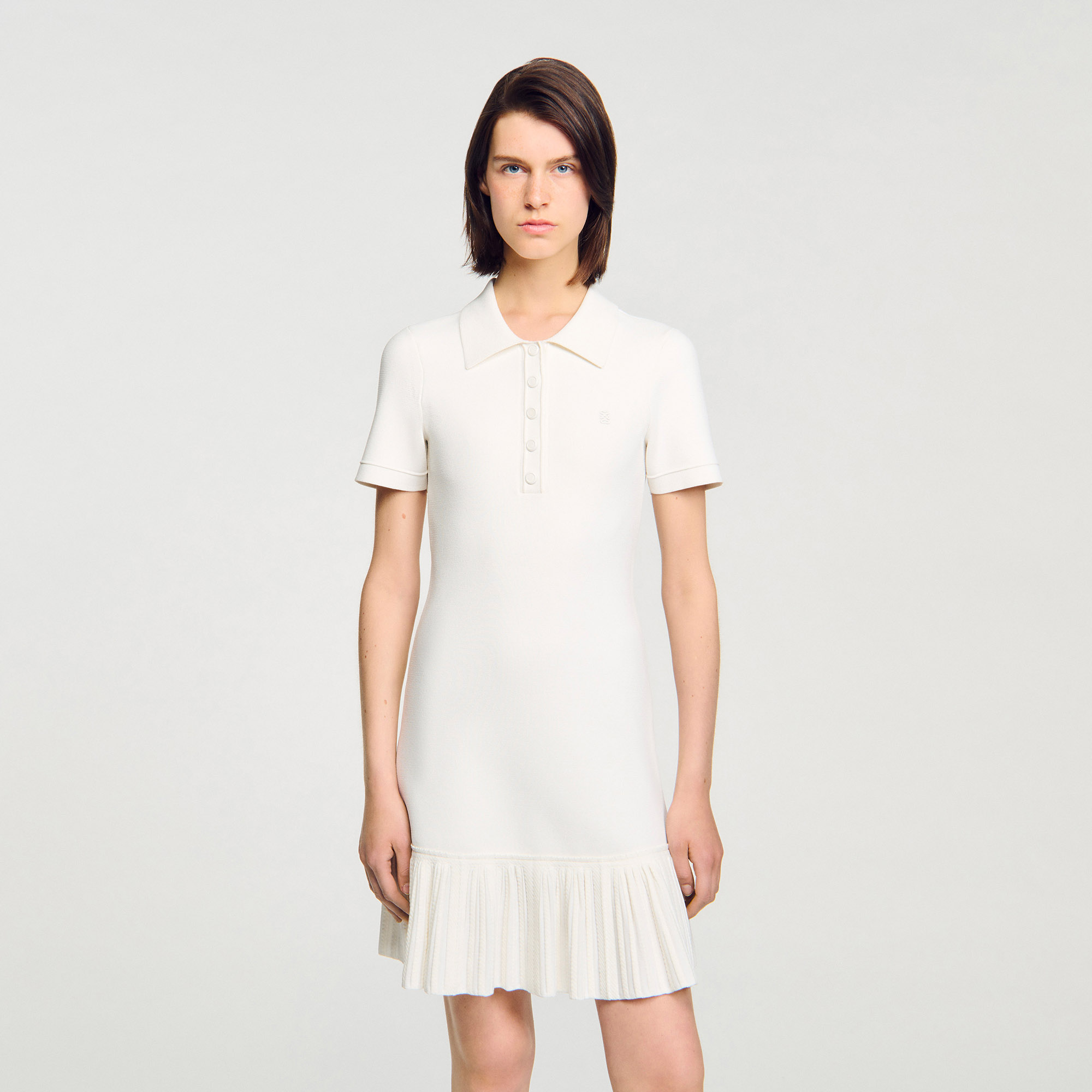 Sandro viscose Mini knit dress with short sleeves, buttoned polo collar, and pleated skirt.
