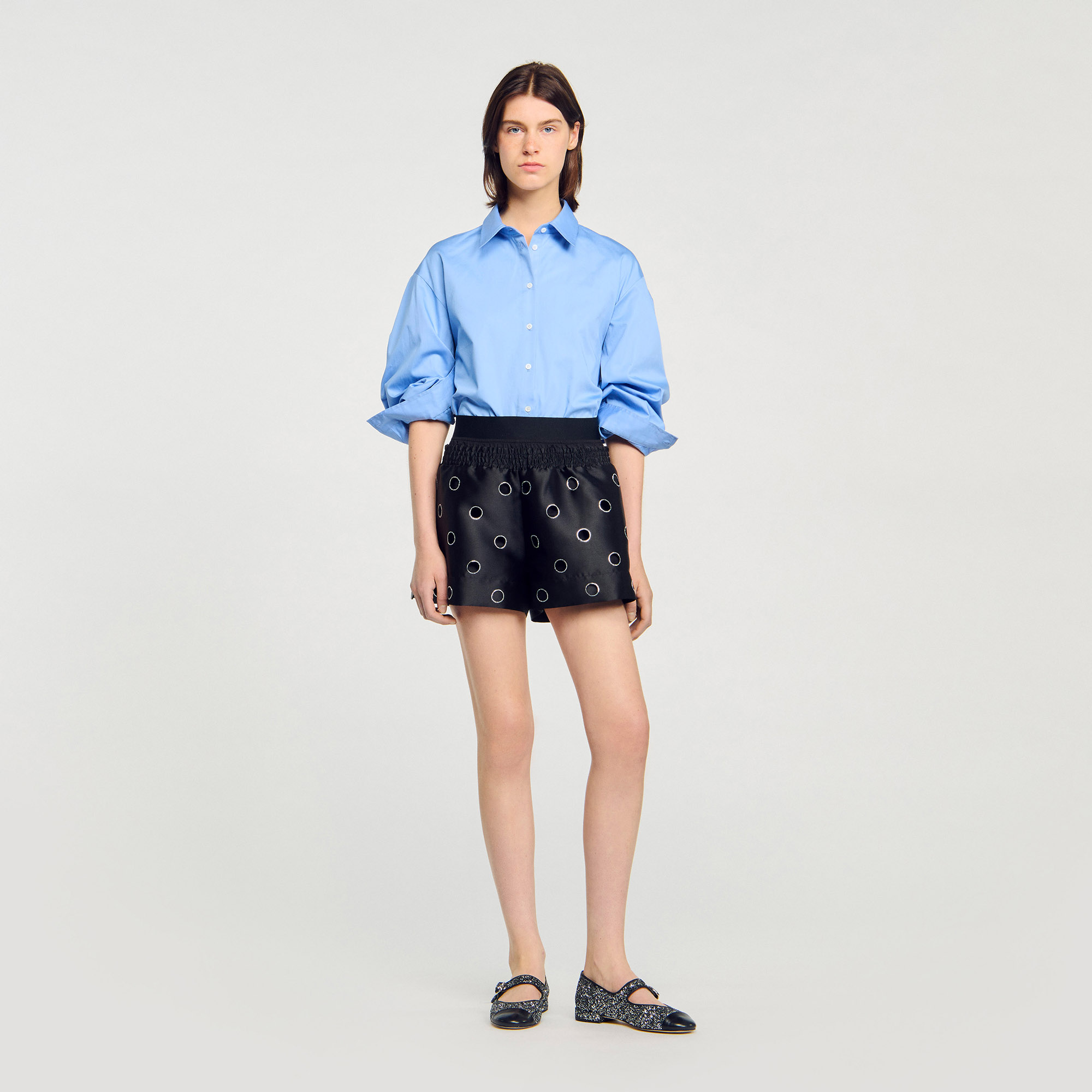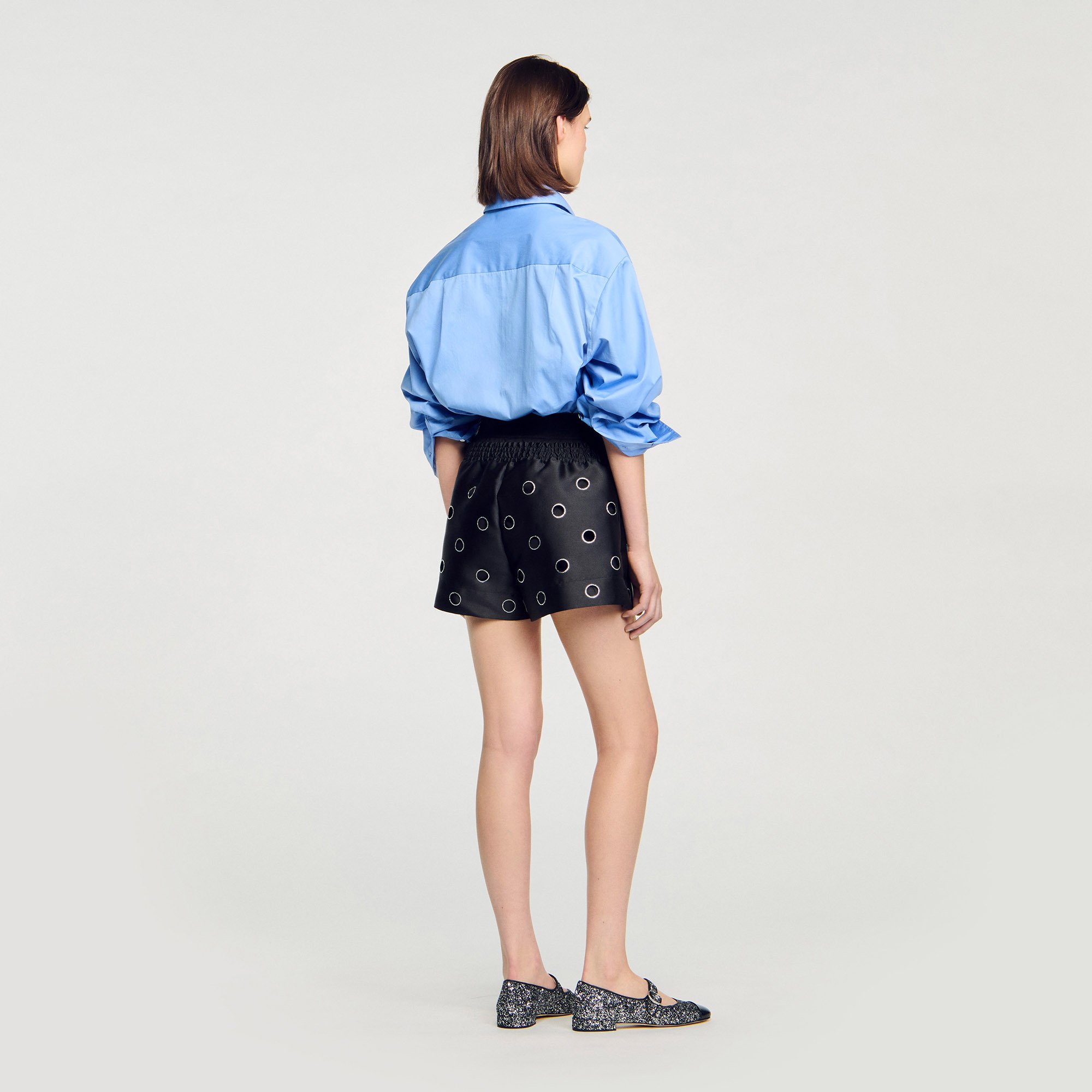 Sandro Women's wide-leg plain satin shorts Openwork rhinestone circles High waist Elasticated smocked waistband Designed for a boxy fit.