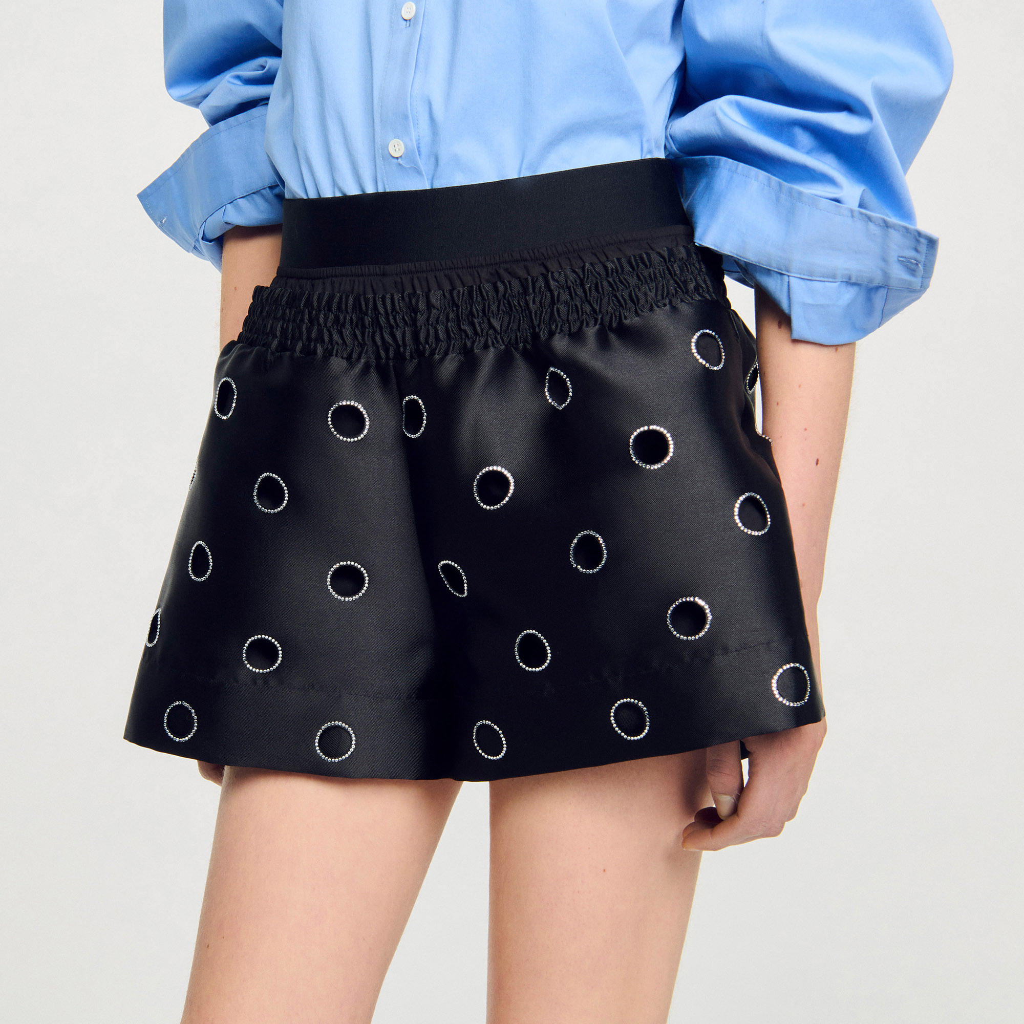 Sandro polyester Wide-leg satin shorts adorned with openwork rhinestone circles, featuring a high waist and an elasticated smocked waistband.