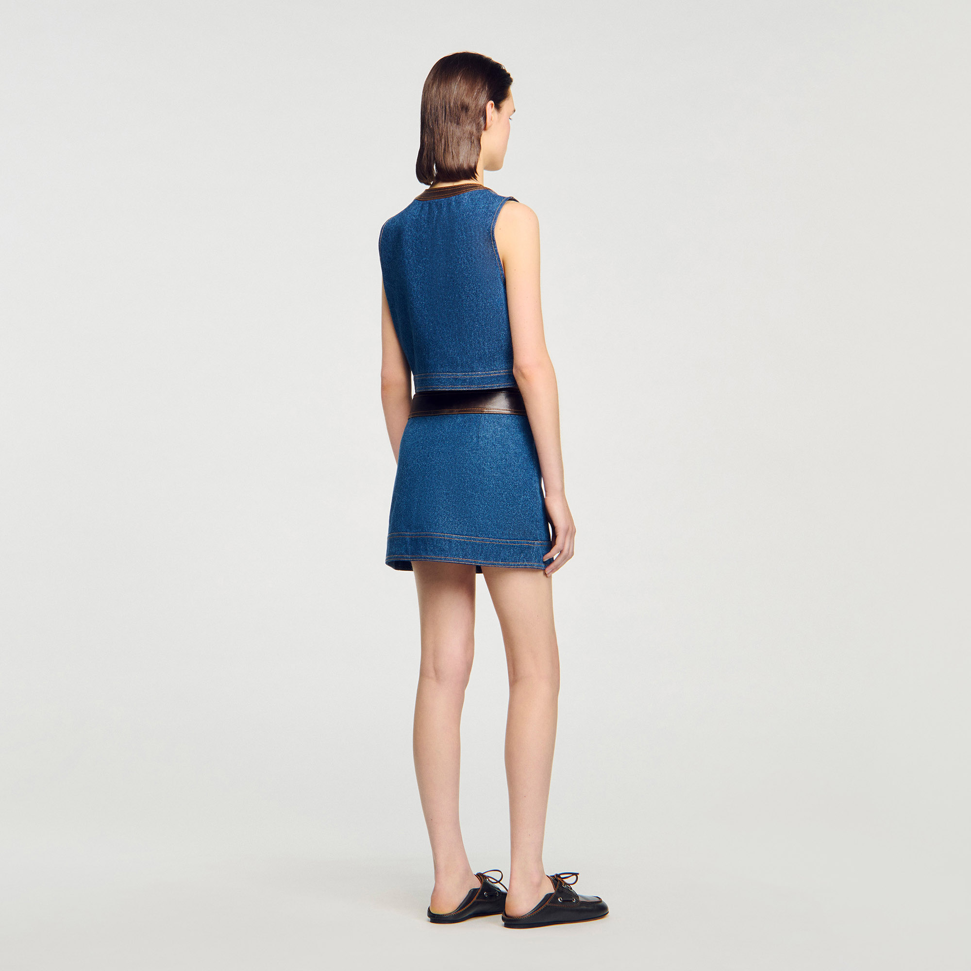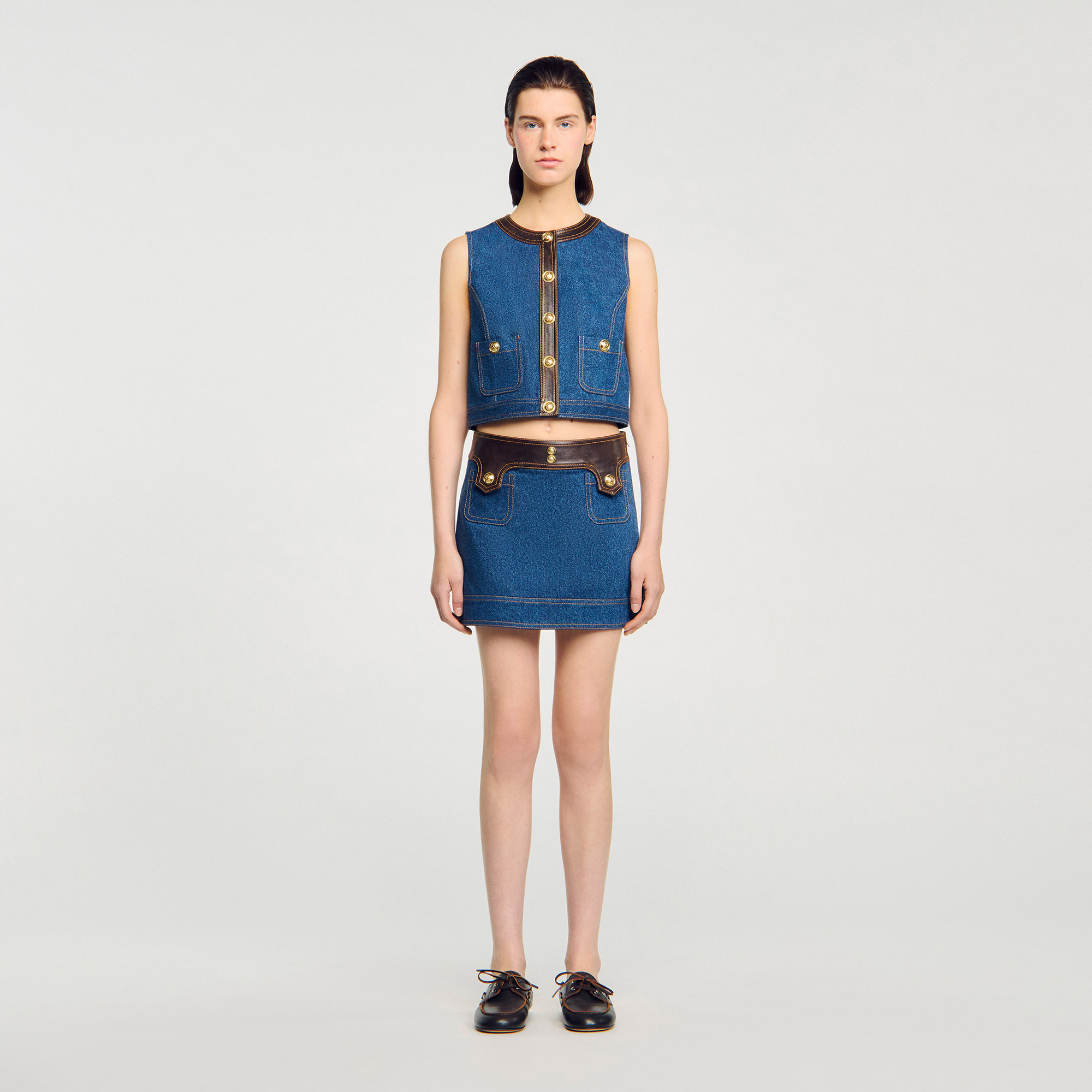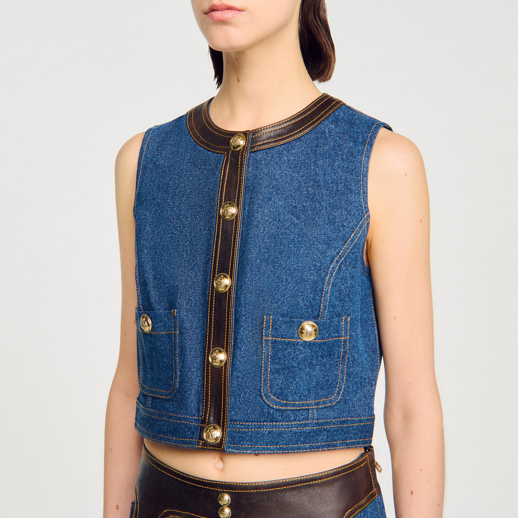 Sandro Women's cropped denim and leather top Sleeveless Button fastening Buttoned patch pockets Round neck Washed denim Designed for a cropped fit.