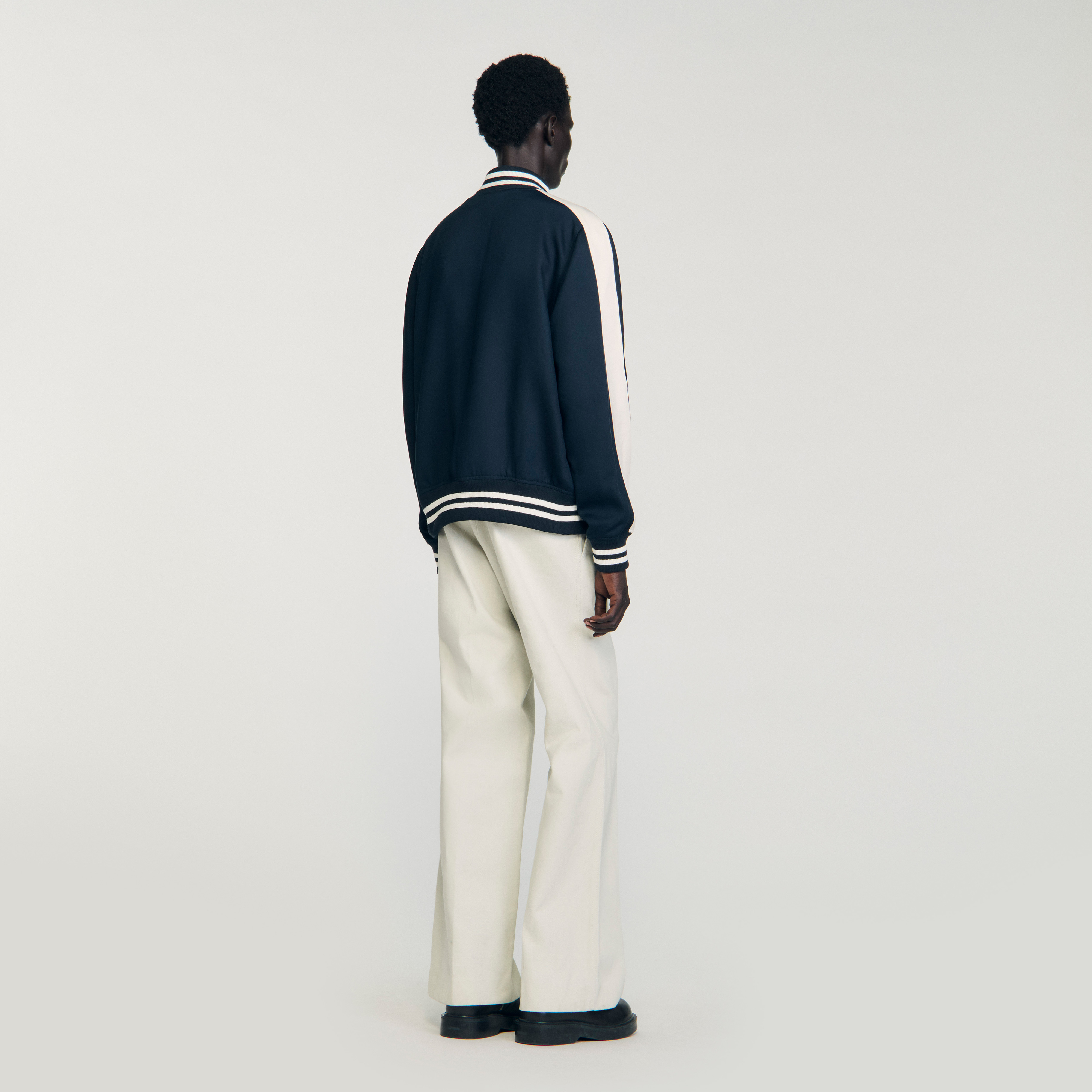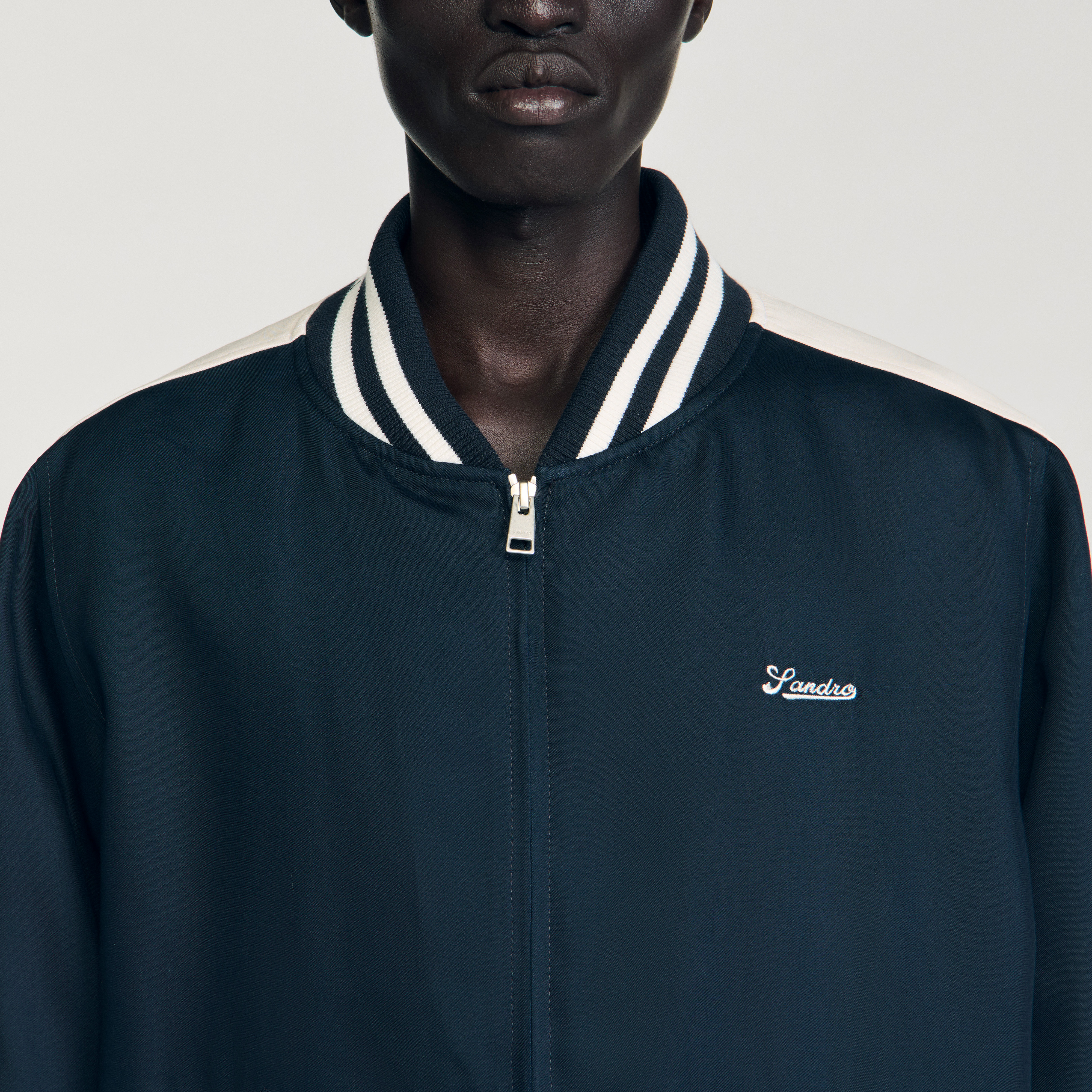 Sandro Men's varsity jacket Teddy collar Long sleeves Zip fastening Front welt pockets Ribbed trims at collar, cuffs and hem Sandro embroidery on the chest Designed for a loose fit.