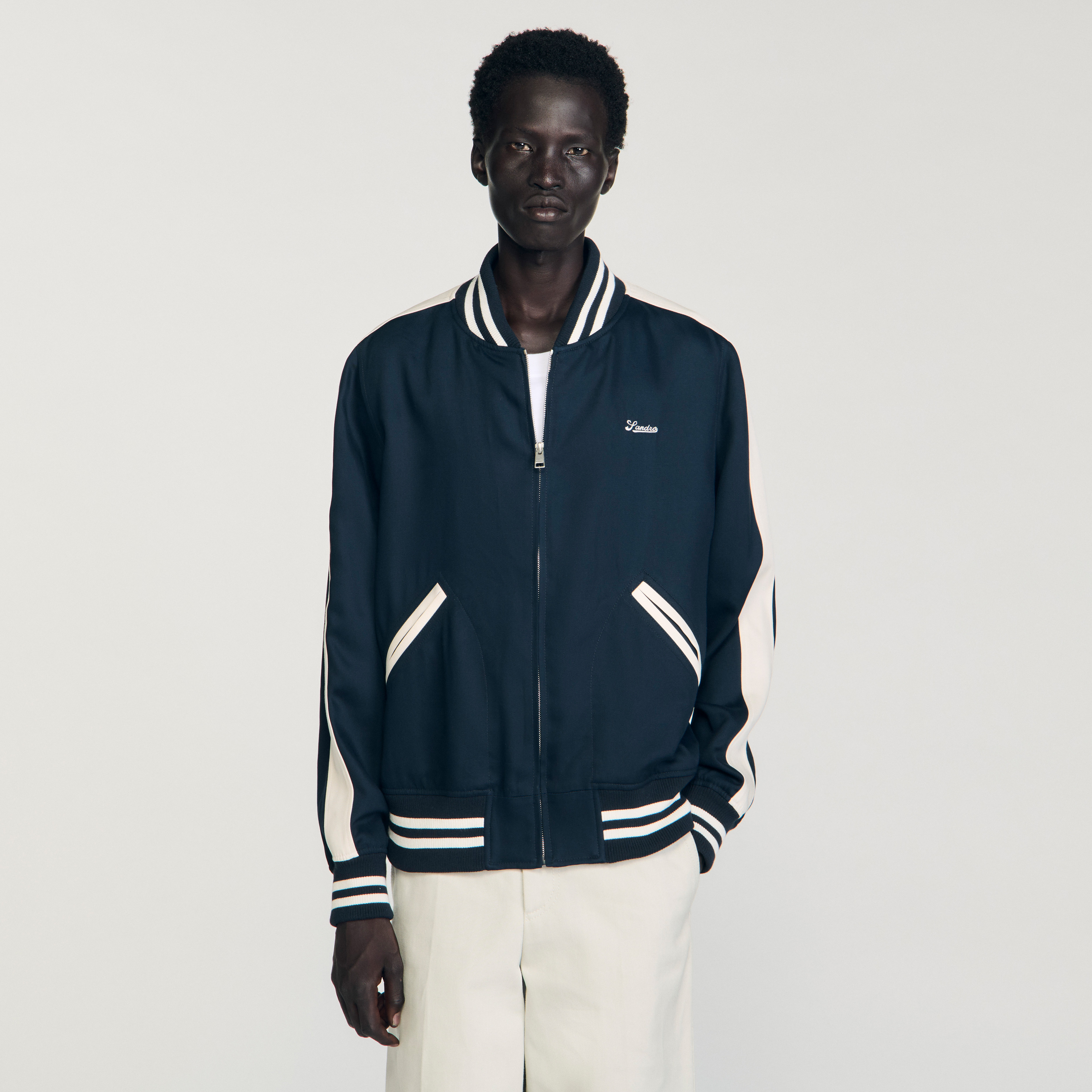 Sandro lyocell College-style varsity jacket with contrast stripes, zip fastening, long sleeves and signature embroidery on the chest.