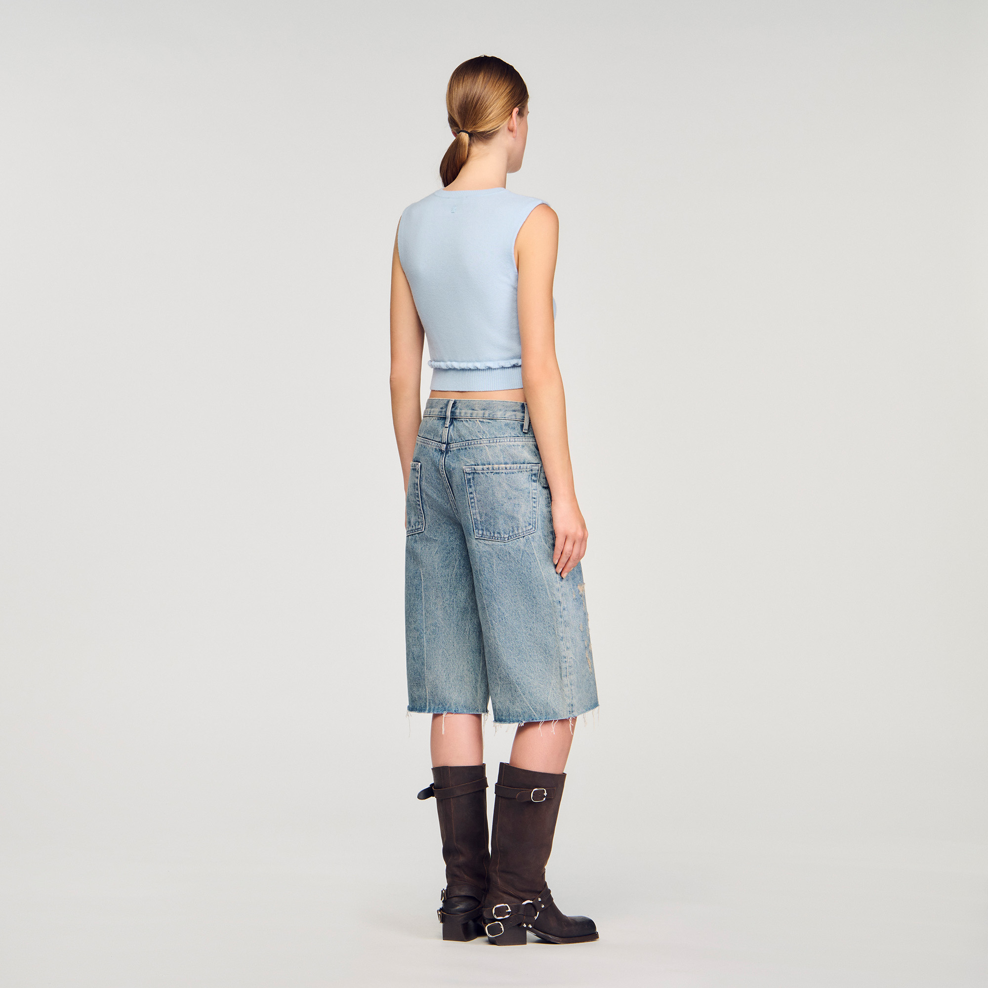 Sandro wool Sleeveless wool and cashmere cropped sweater with ruffle detail at the bottom and a Sandro tag on the chest.