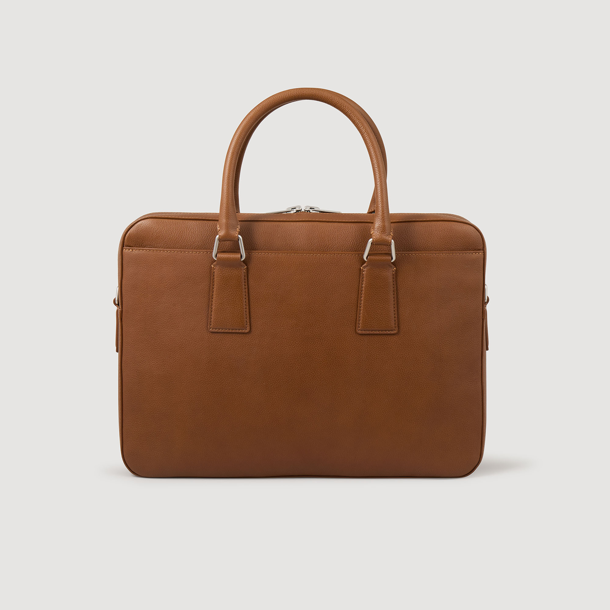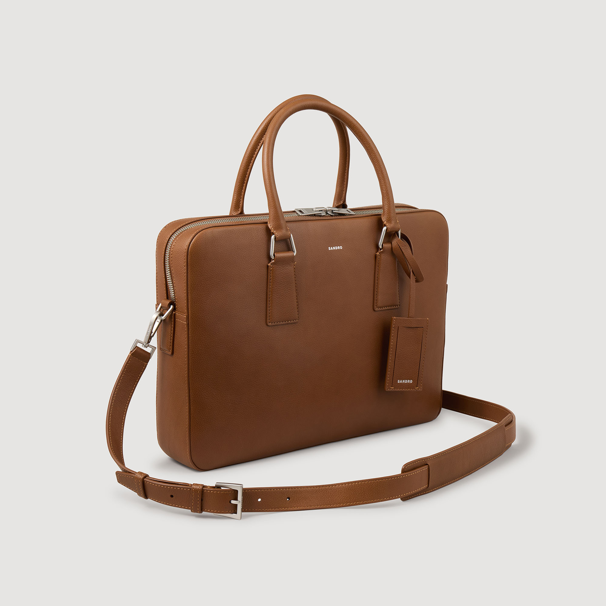 Sandro Men's large grained leather briefcase Sandro embossed pull tab Adjustable, removable shoulder strap Grained leather label holder Silver debossed Sandro logo Inner storage pocket Technical fabric inner lining 38 x 28 x 7 cm.
