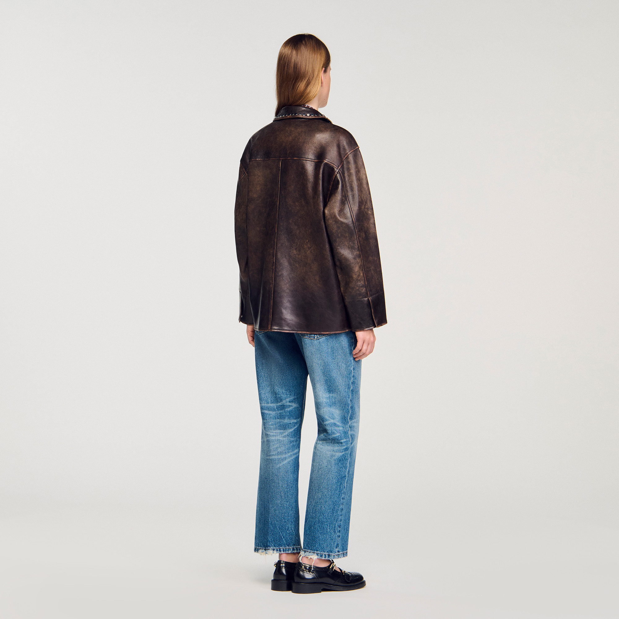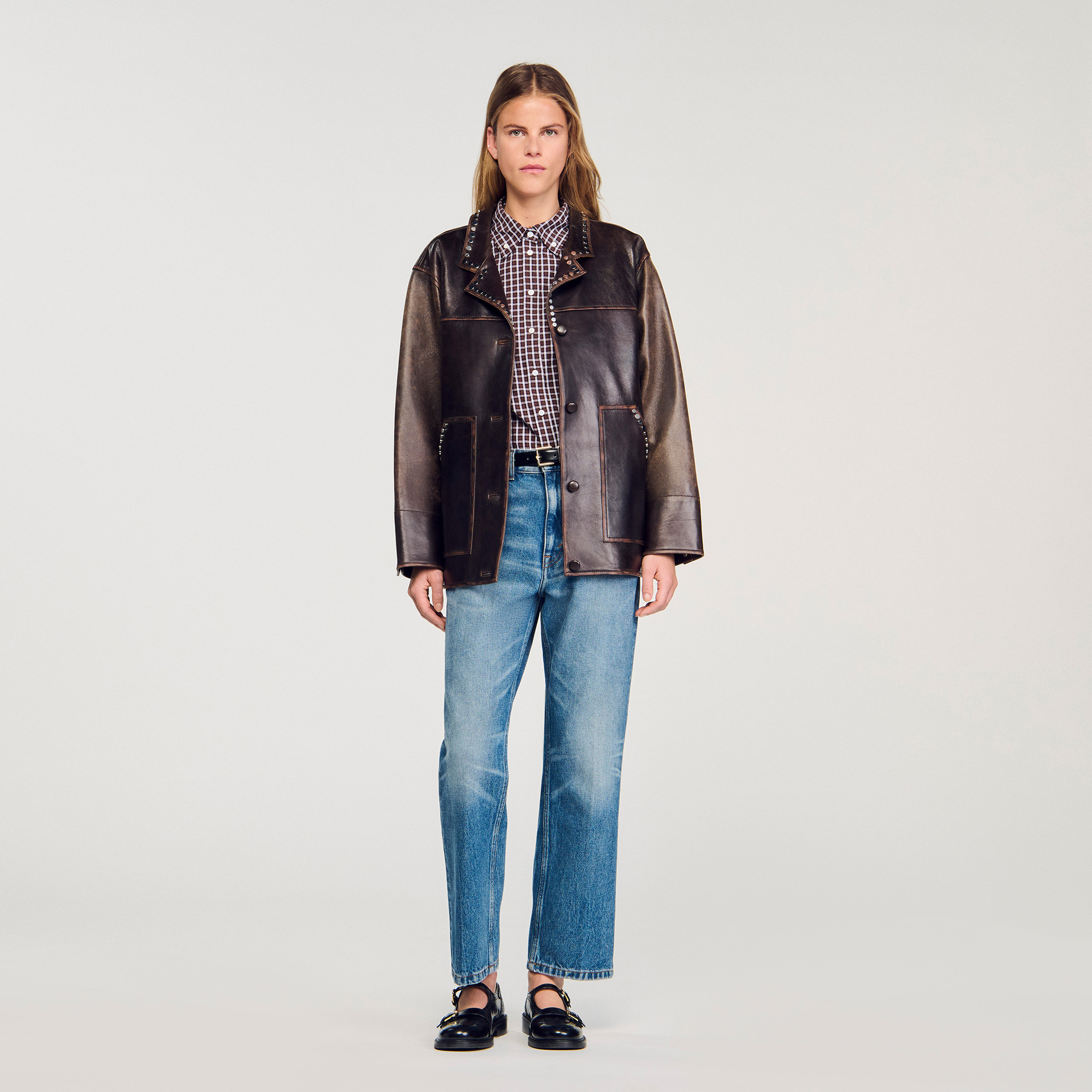 Sandro leather Oversized distressed leather jacket with lapel collar, embellished with studs on the collar edge and pocket openings, featuring a button placket fastening.