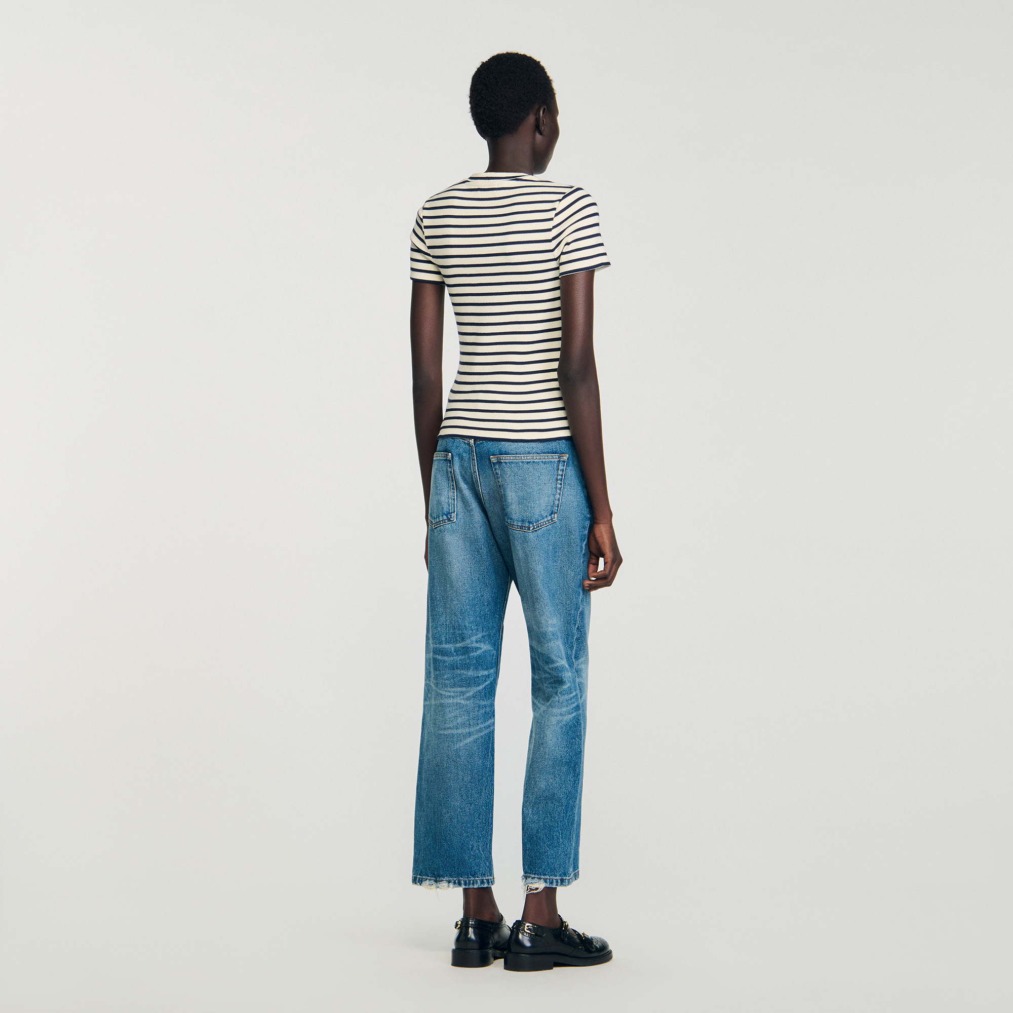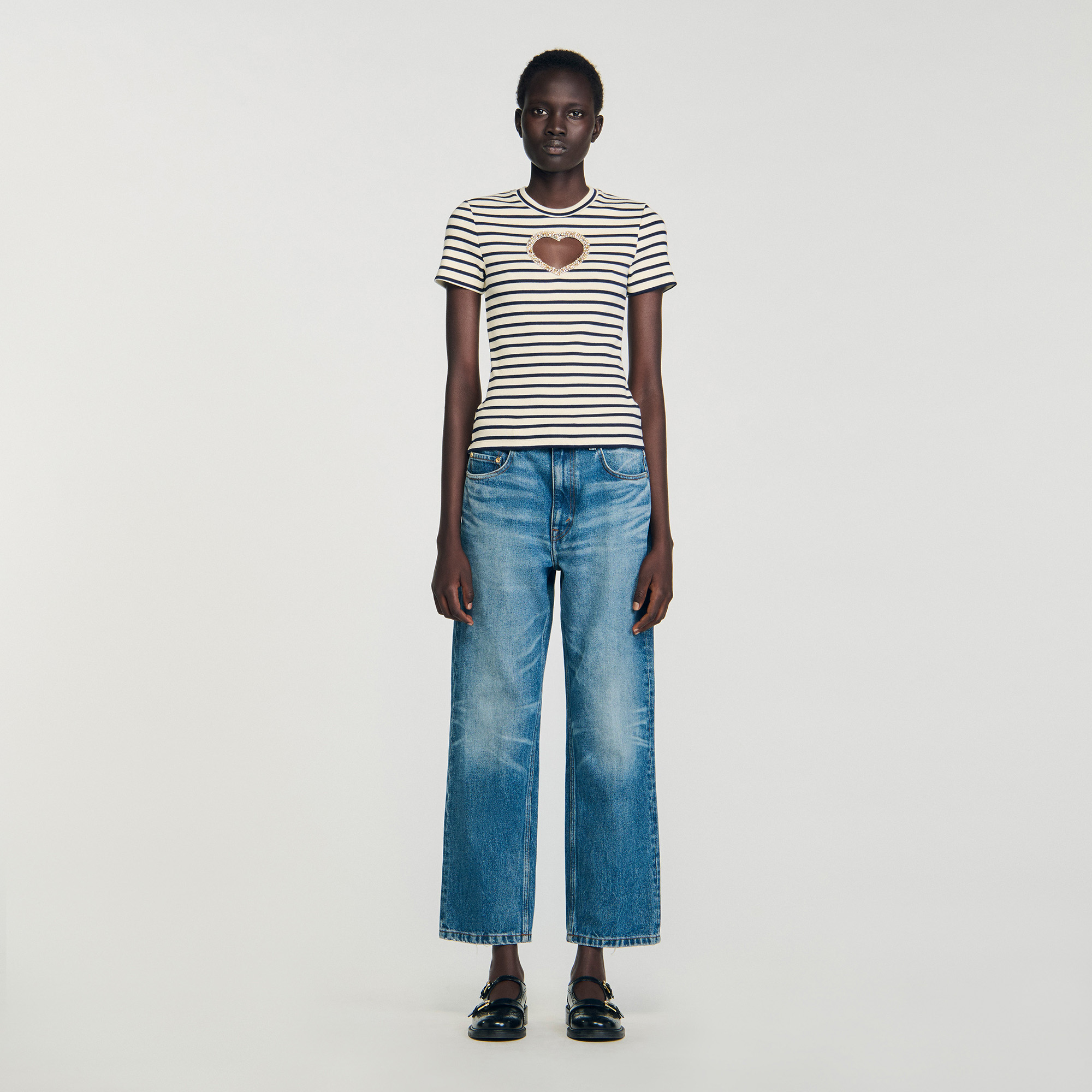 Sandro cotton Striped T-shirt with round neck and short sleeves, featuring an openwork heart with rhinestones Sandro Women's striped T-shirt Round neck Short sleeves Openwork heart with rhinestones.