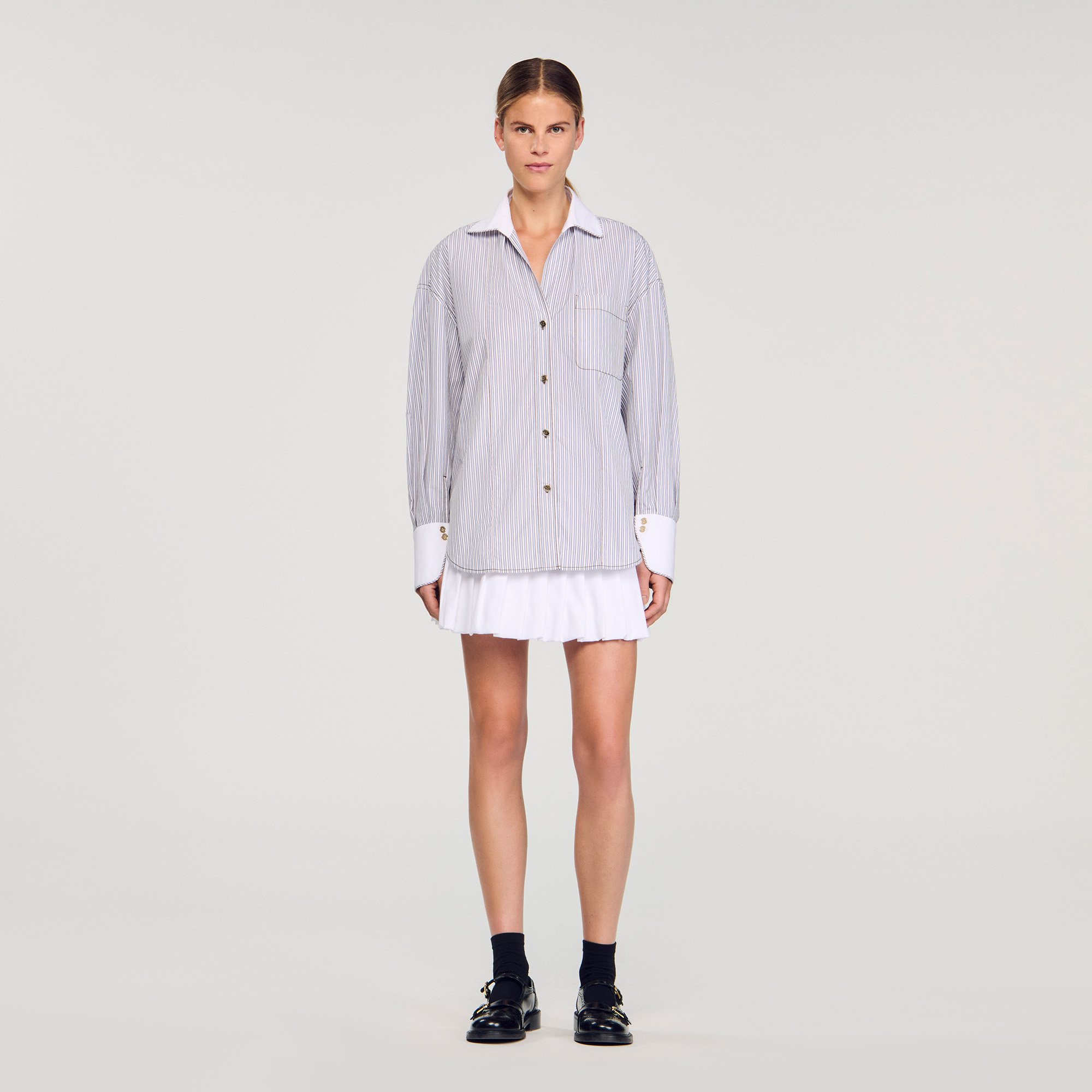 Sandro Women's striped shirt Contrasting V-neck collar Long sleeves with contrasting buttoned cuffs Button fastening Chest patch pocket Buttoned triangular tab at the back Designed for an oversized fit.