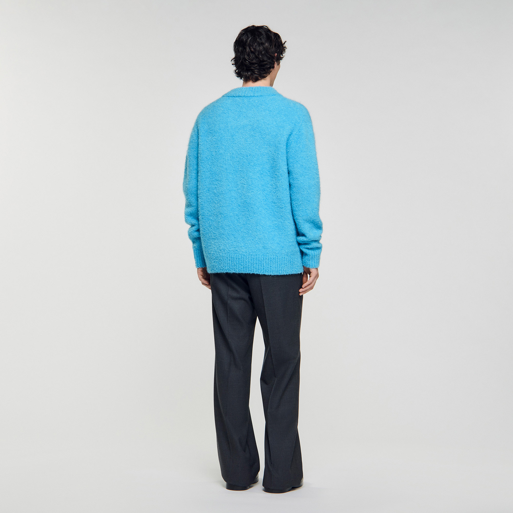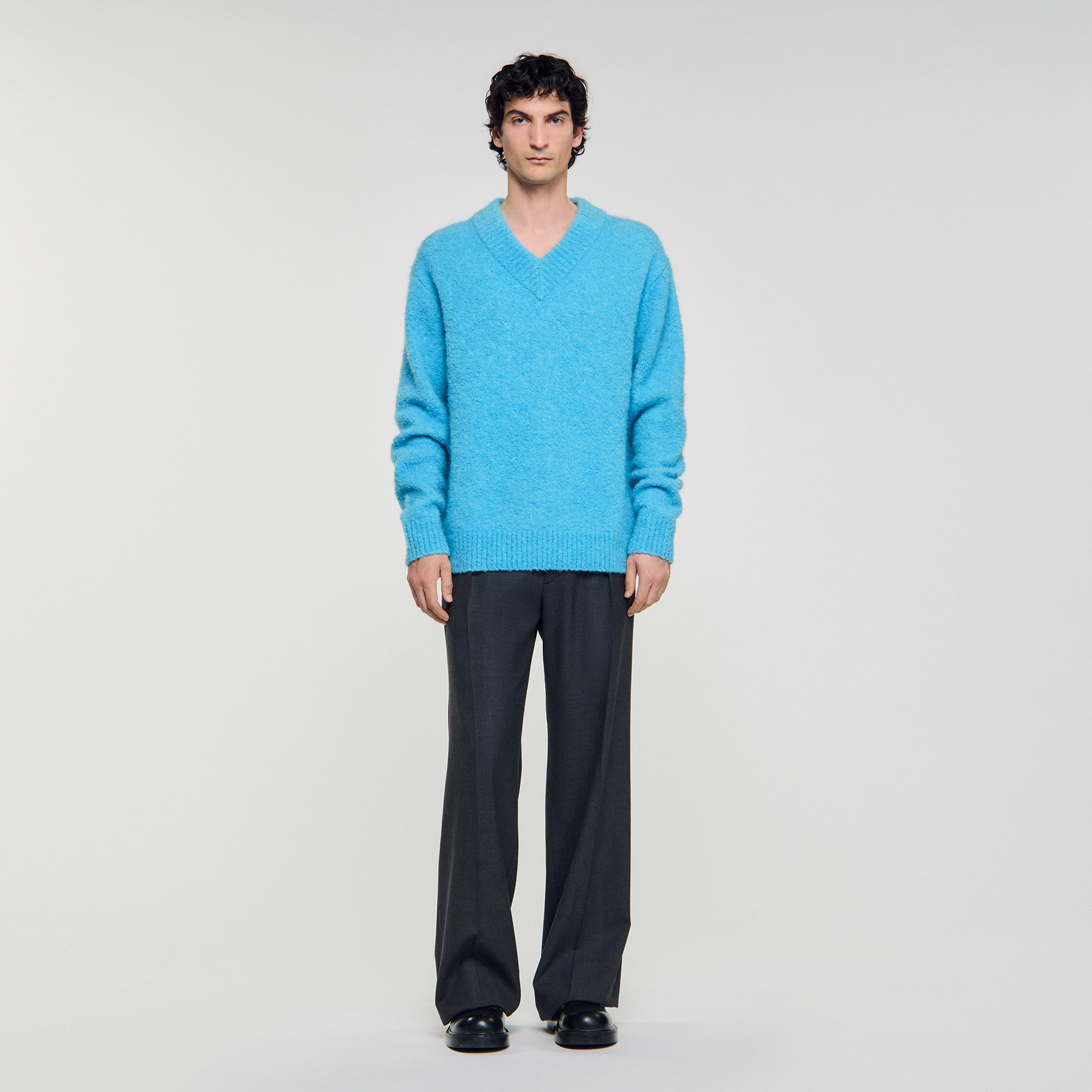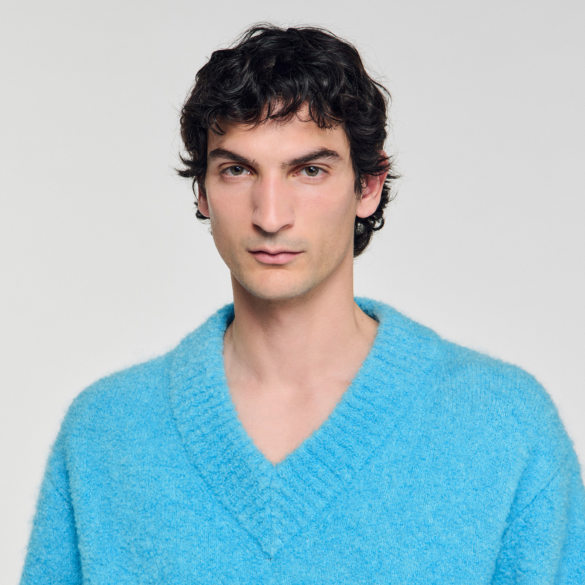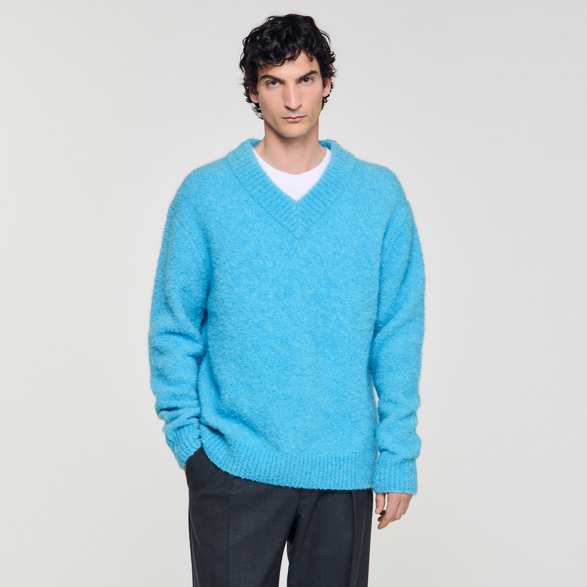Sandro Men's terry knit sweater Contains wool and alpaca V-neck Long sleeves Designed for a boxy, wide fit.