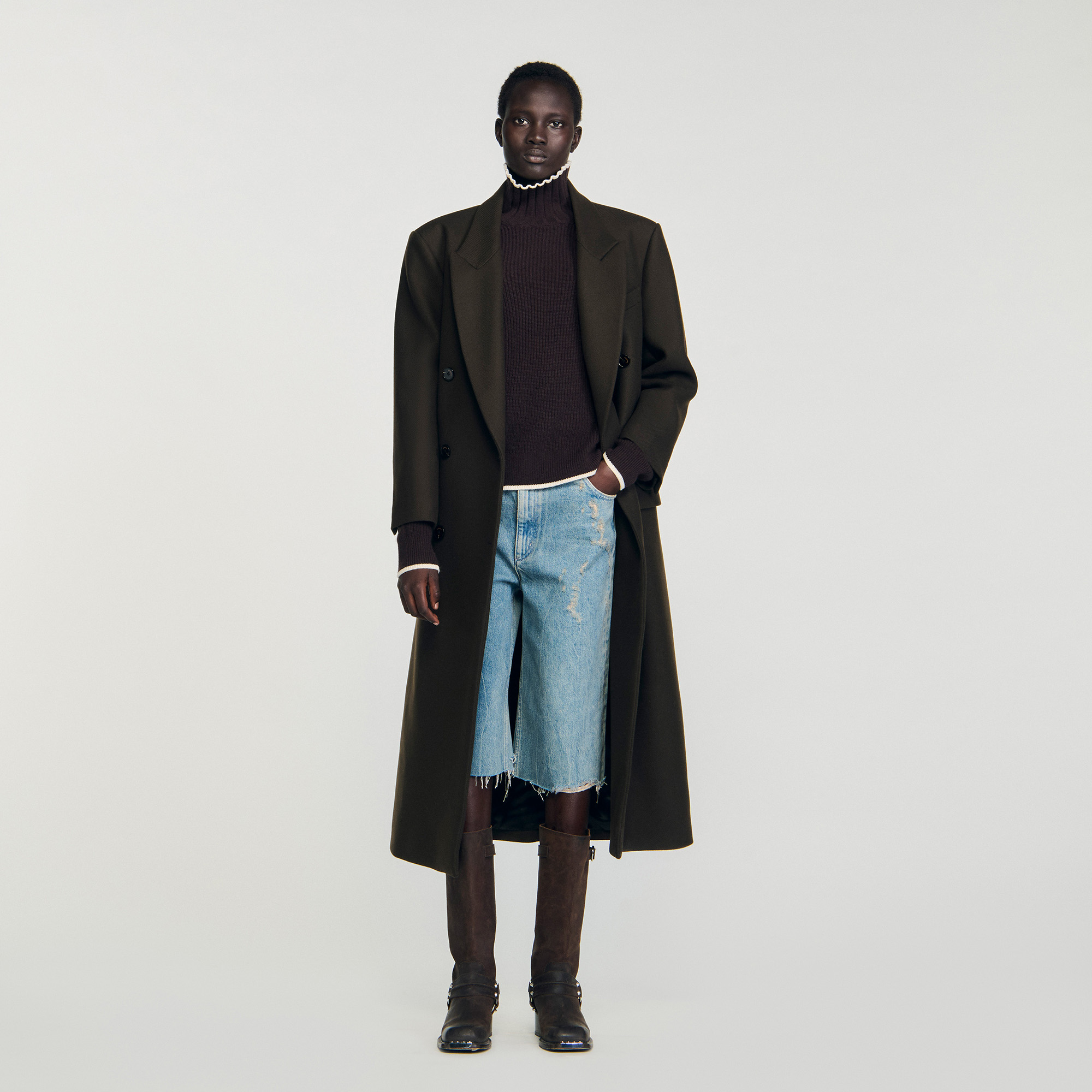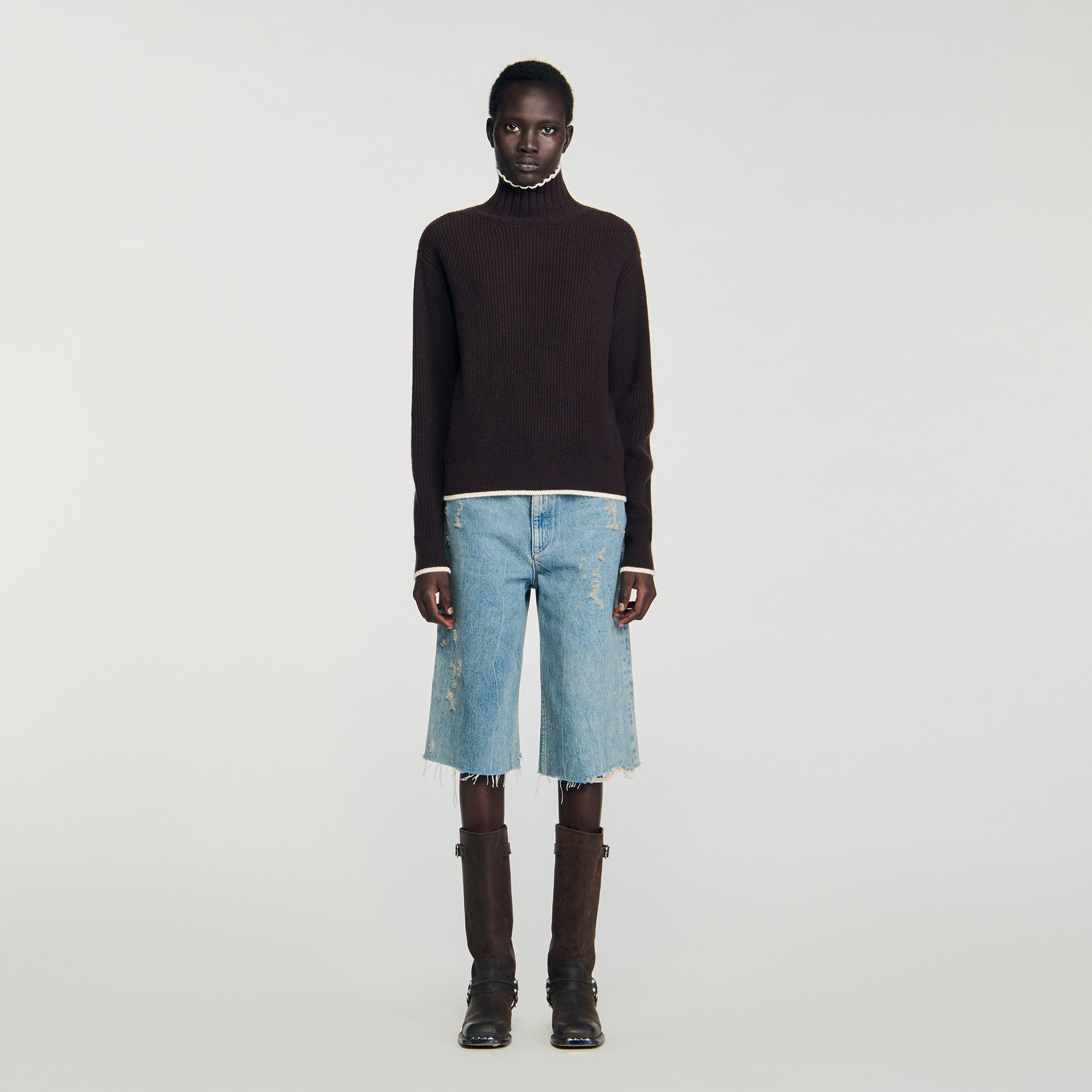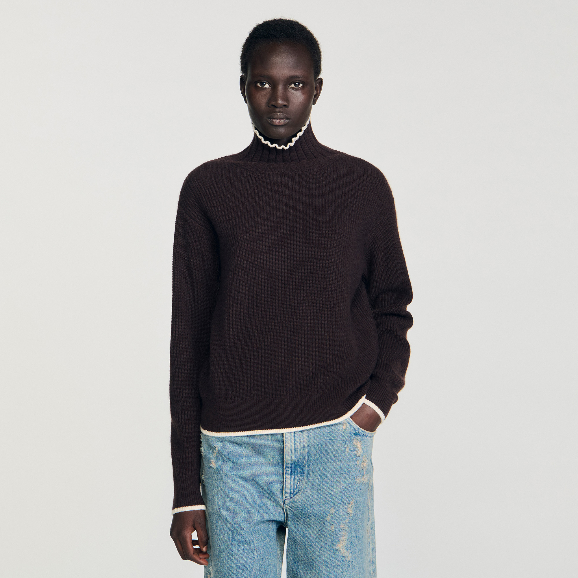 Sandro wool Long-sleeved knit sweater with turtleneck and contrast piping.