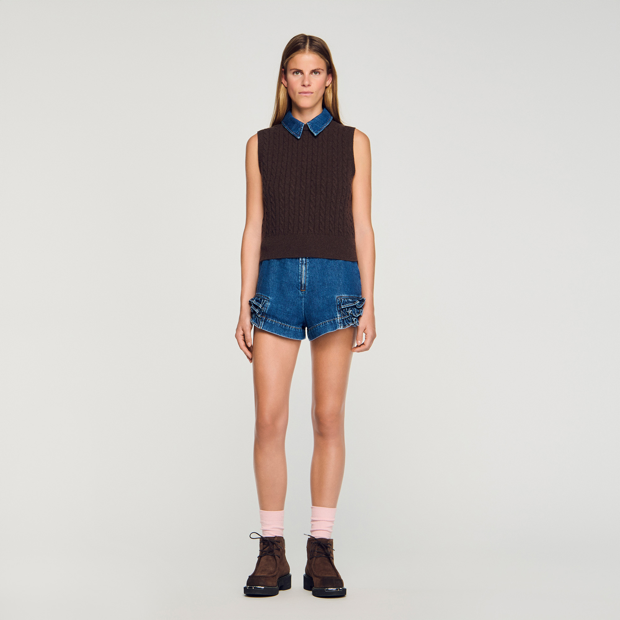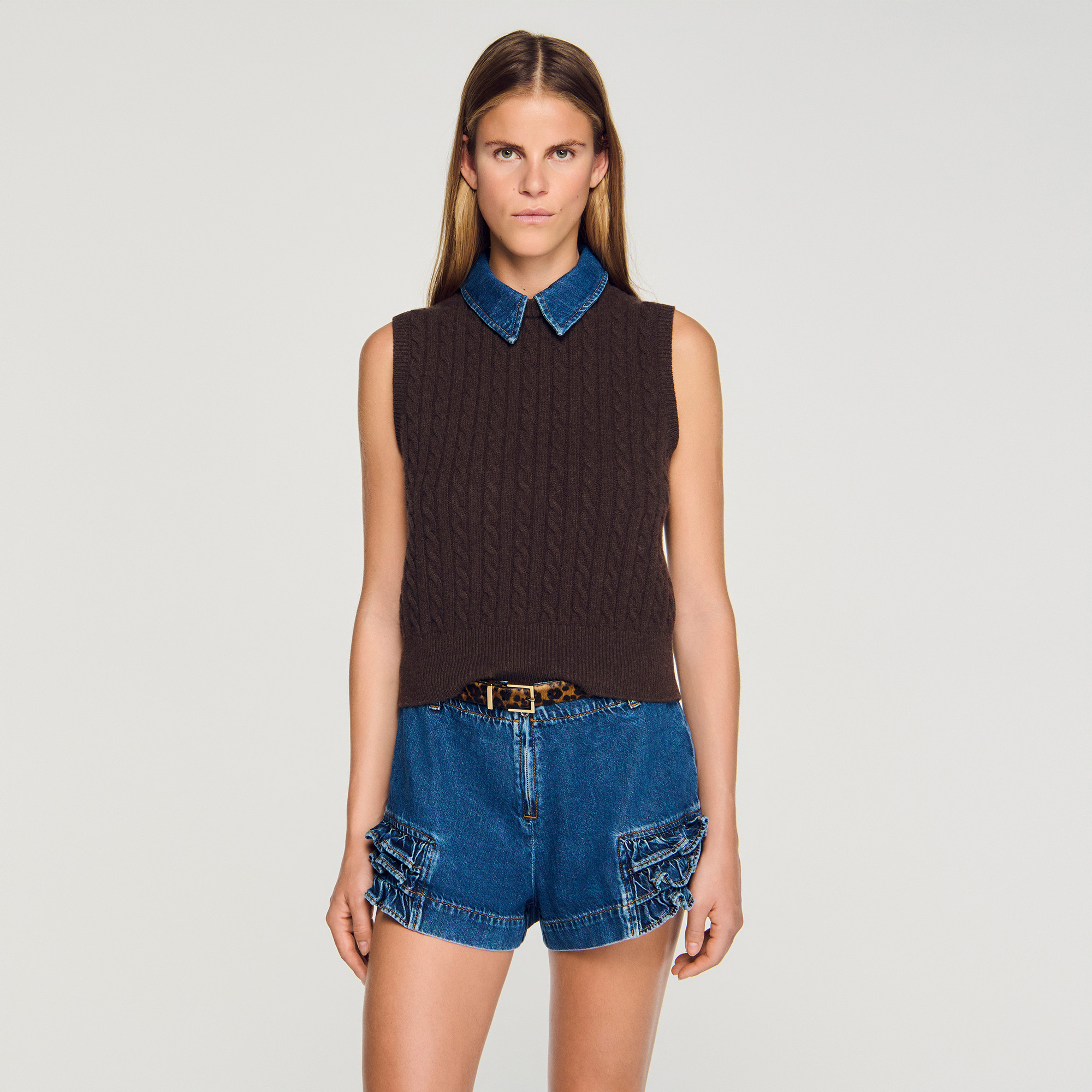 Sandro wool Sleeveless cropped cable knit sweater with a denim collar and contrasting embroidery on the chest.