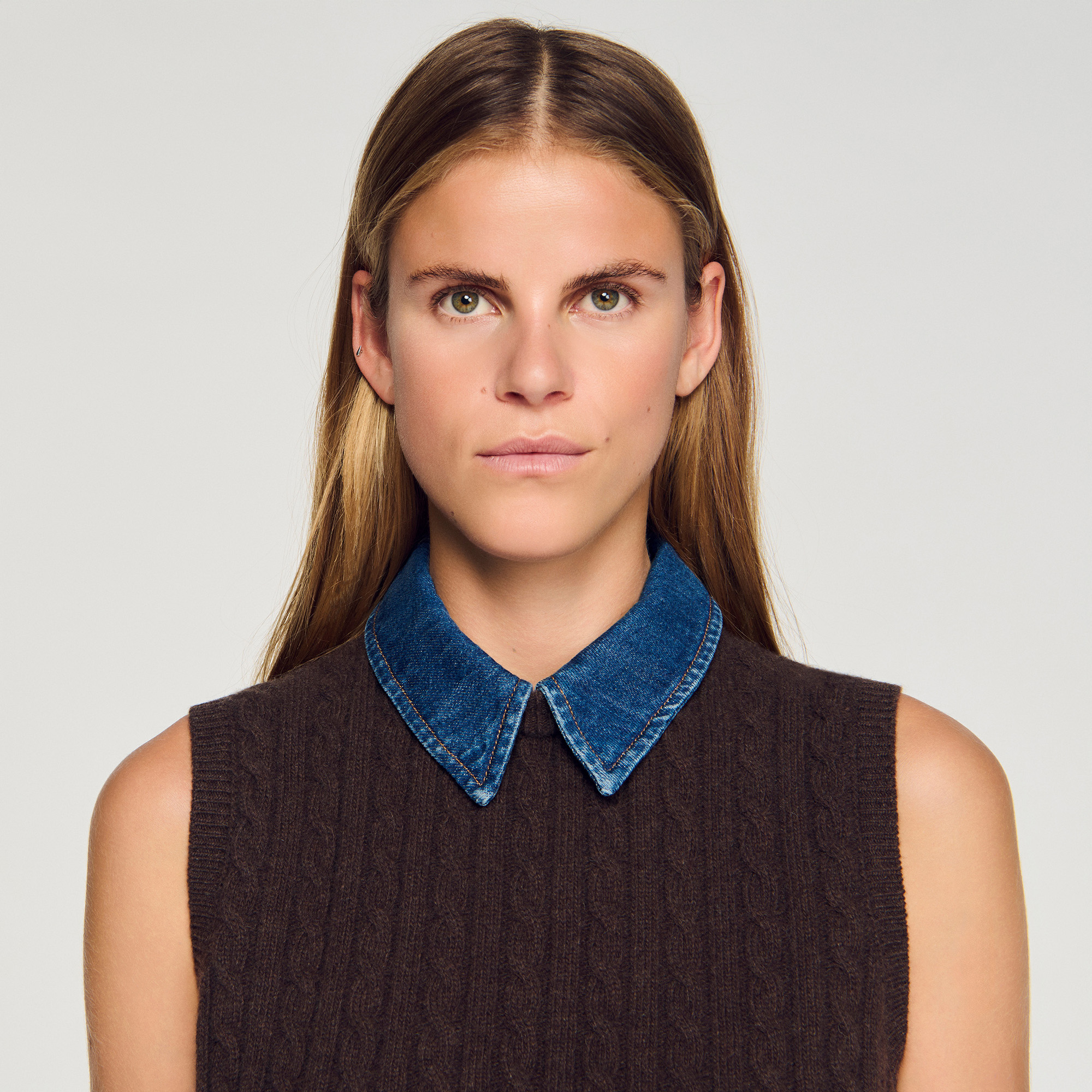 Sandro Women's cable knit sweater Removable shirt collar with denim panels Contrasting chest embroidery Sleeveless True to size.