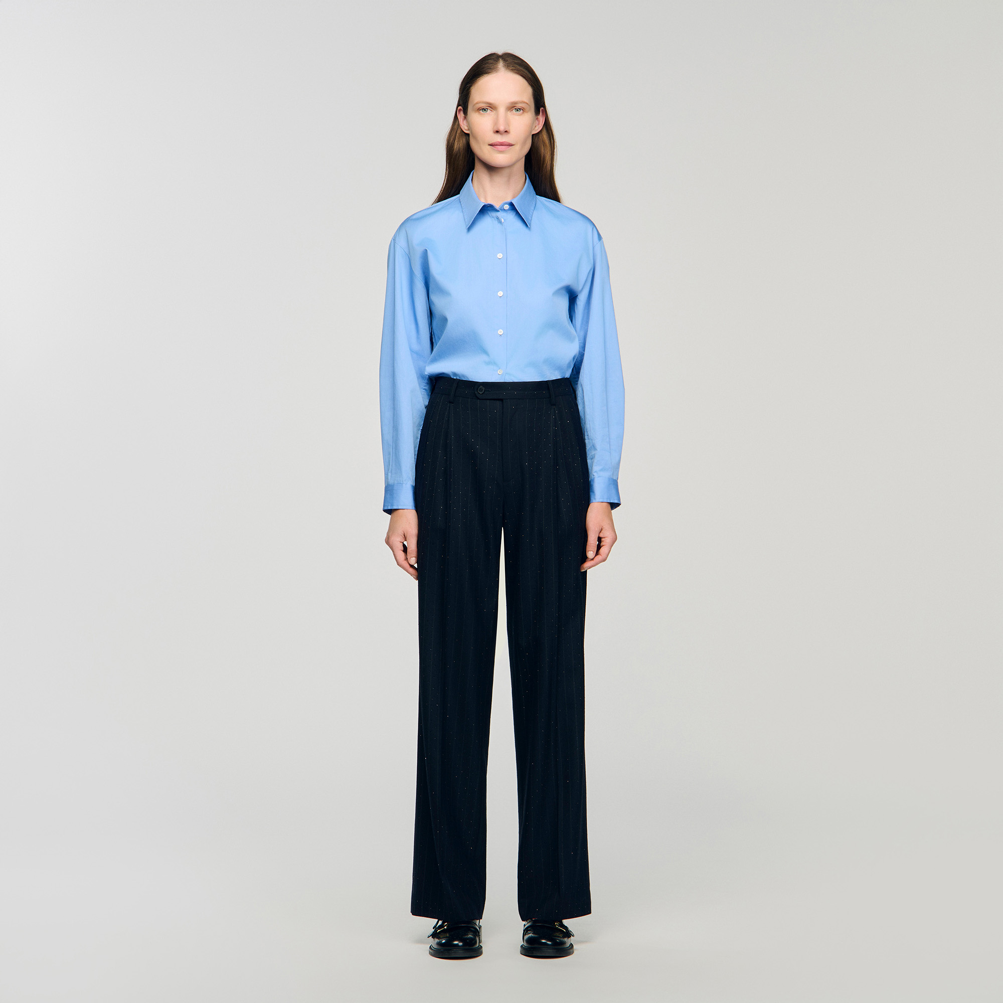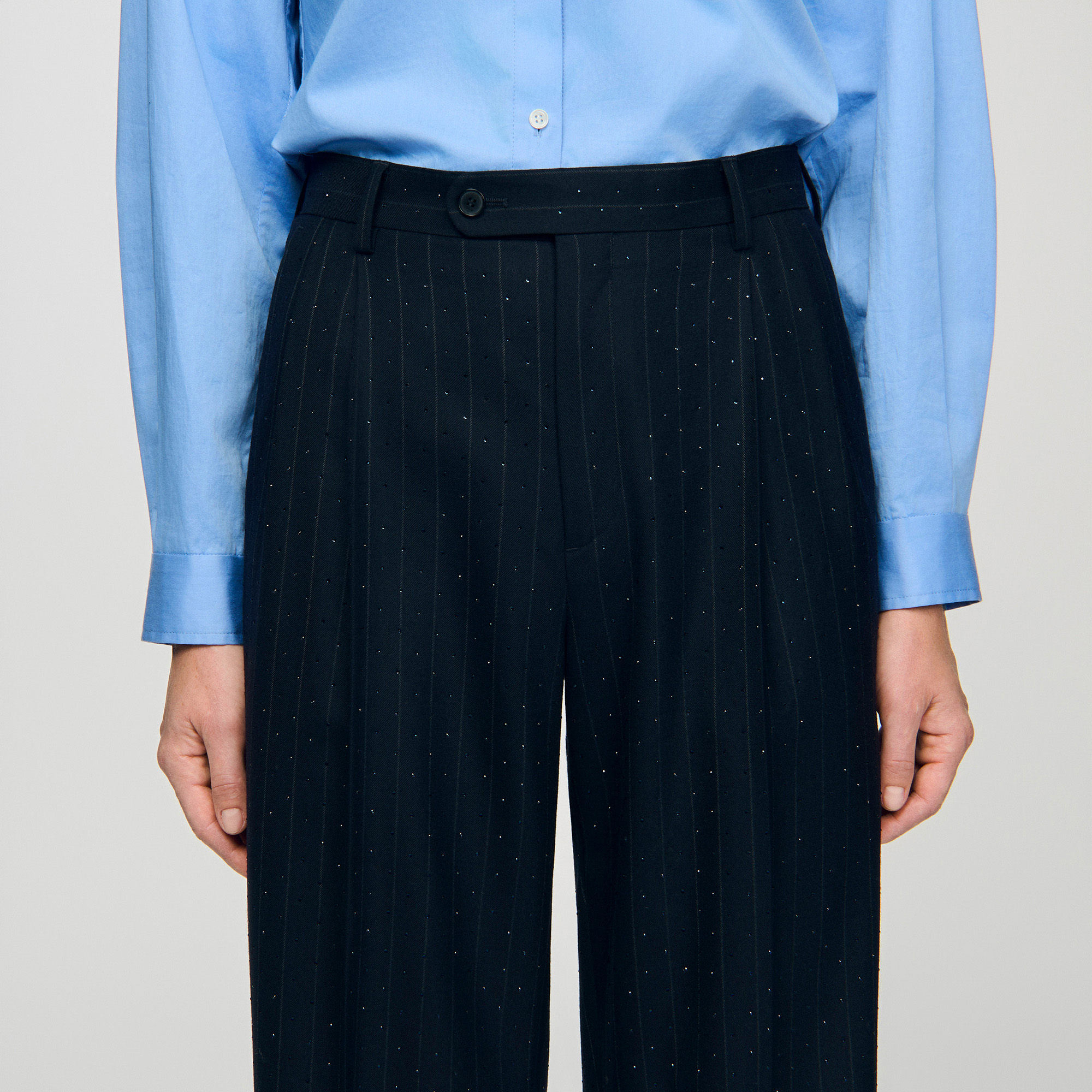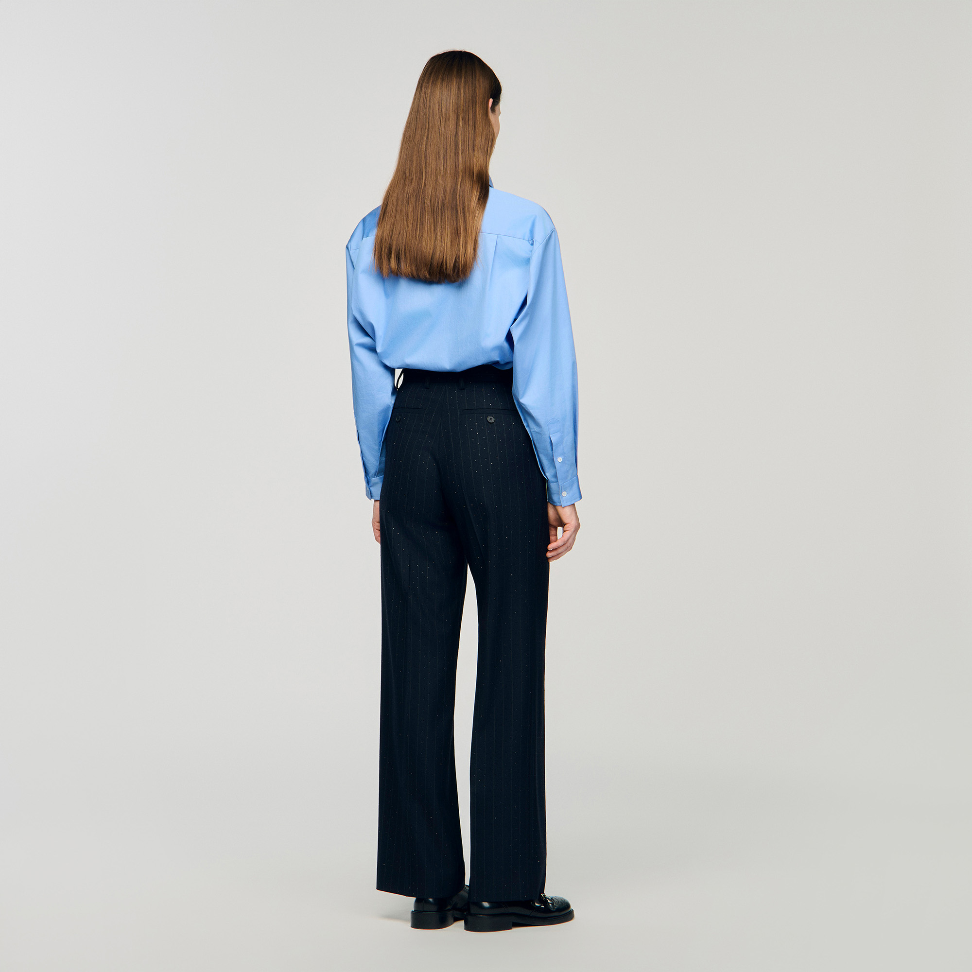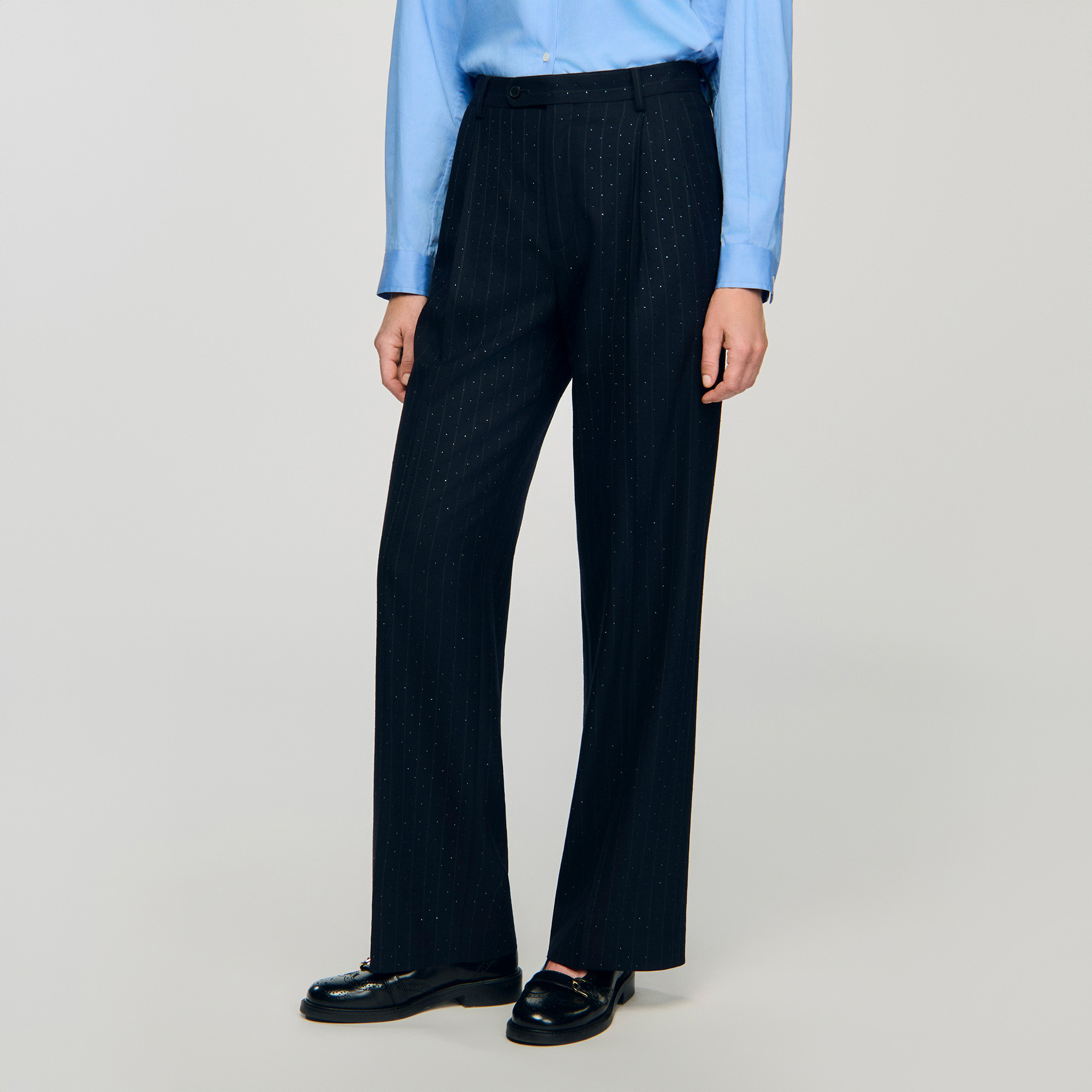 Sandro Women's straight-leg, wide trousers Rhinestone stripes Button placket fastening Slanting pockets at the front Buttoned welt pockets on the back Ironed creases on front and back True to size.