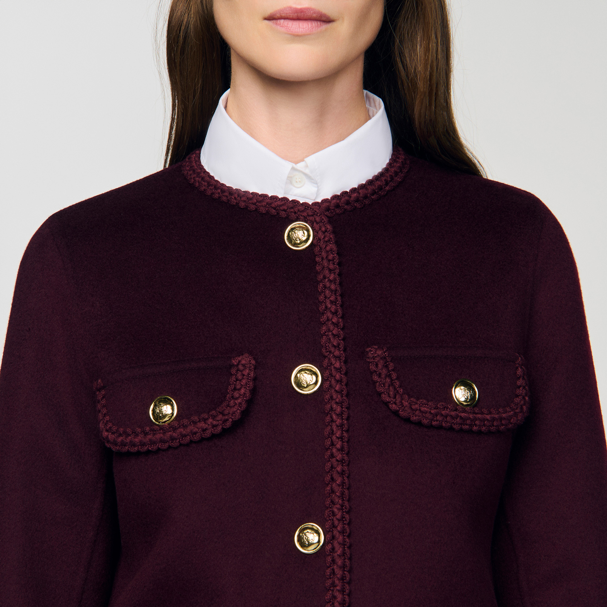 Sandro wool Double-faced jacket with round collar, long sleeves and buttoned flap pockets, featuring contrasting decorative trim.