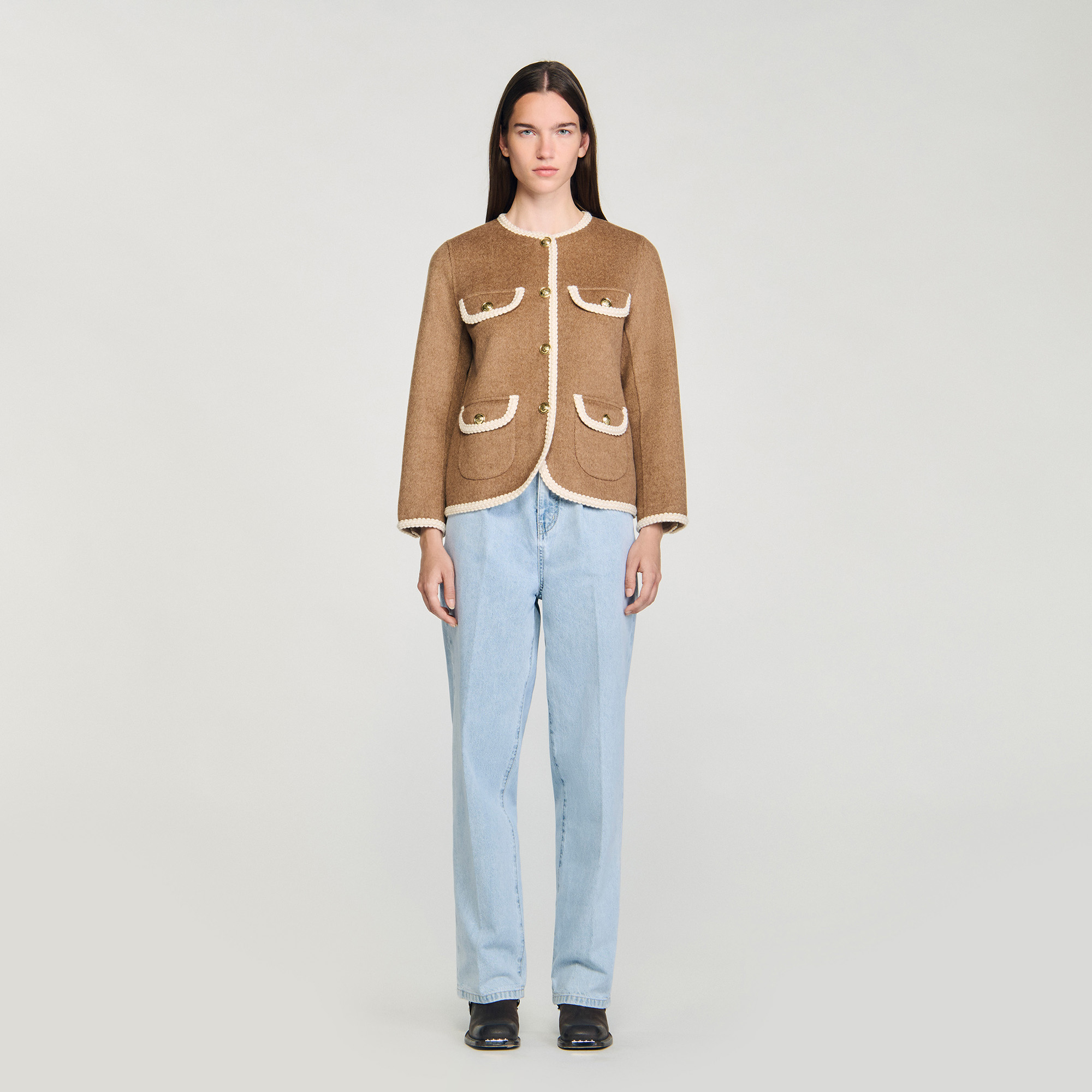 Sandro wool Double-faced jacket with round collar, long sleeves and buttoned flap pockets, featuring contrasting decorative trim.