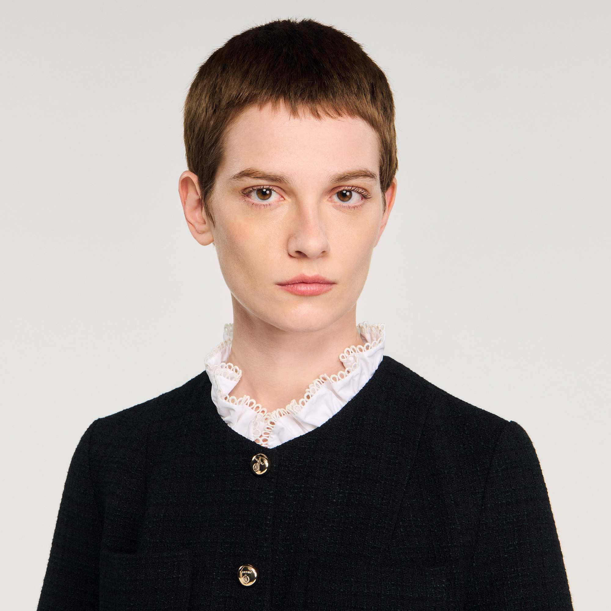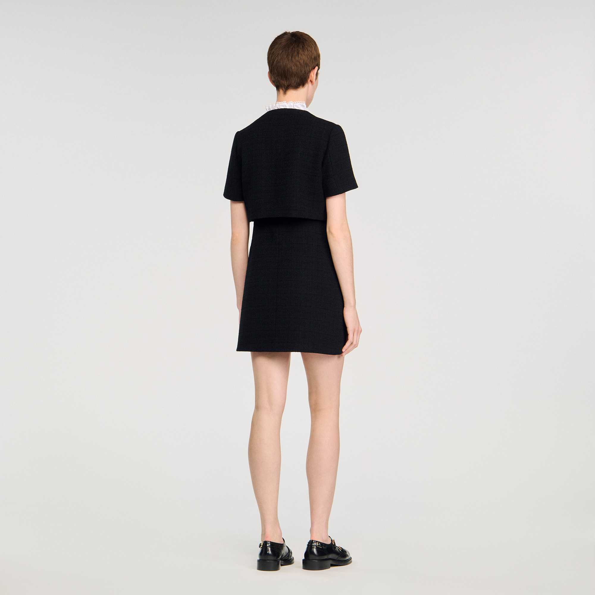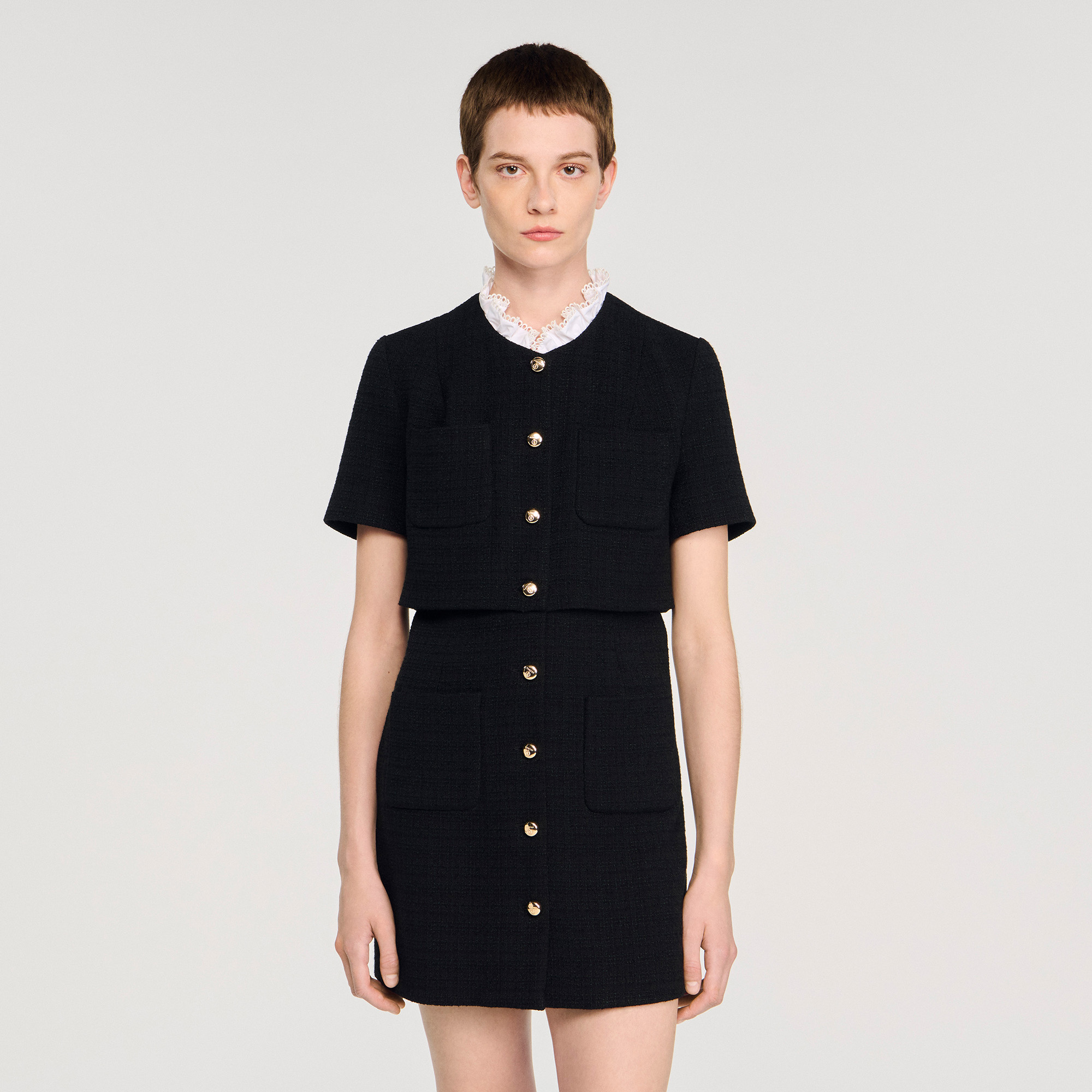 Sandro Women's mini tweed dress Removable ruffled poplin collar Button placket at the front Patch pockets on chest and skirt Designed for a cinched fit.
