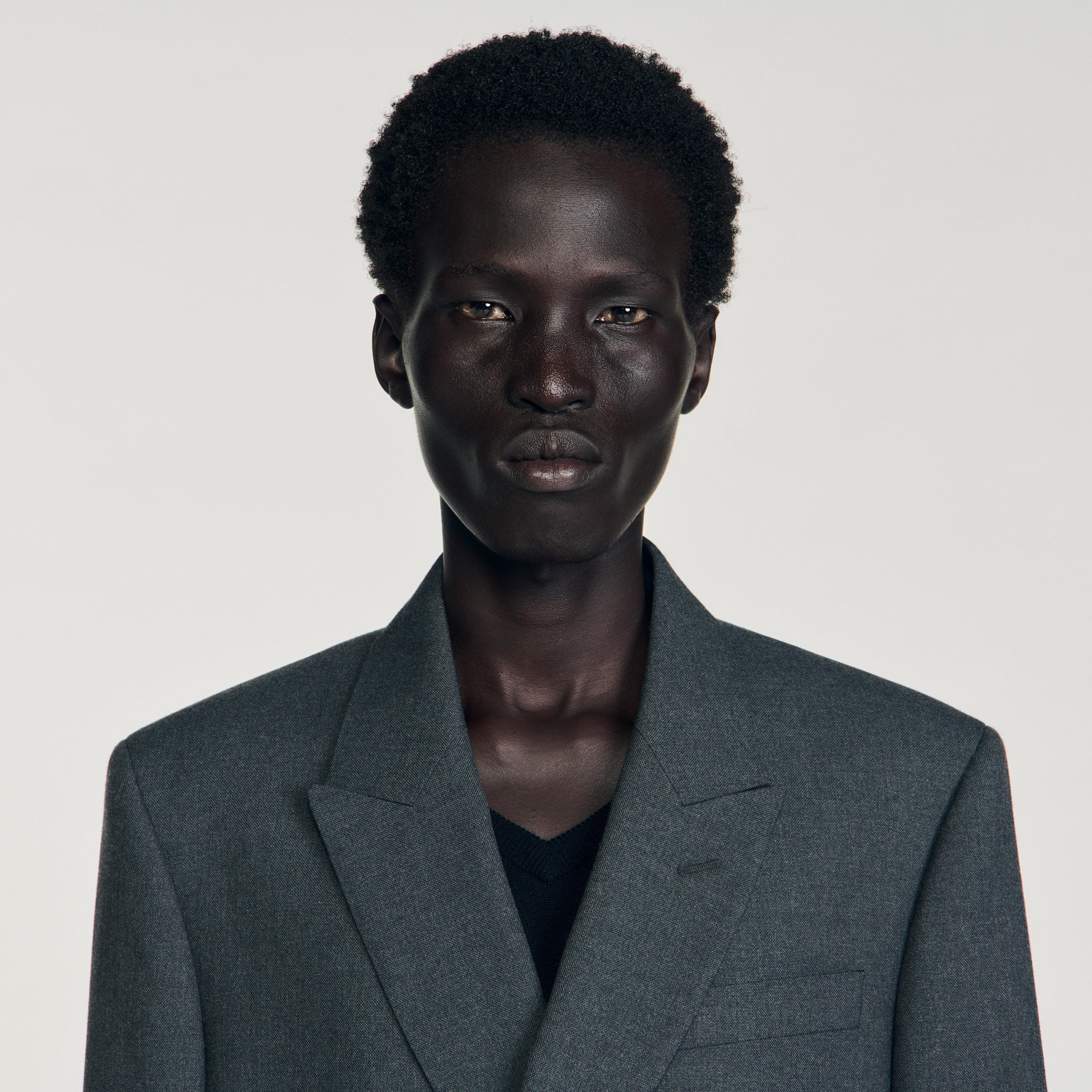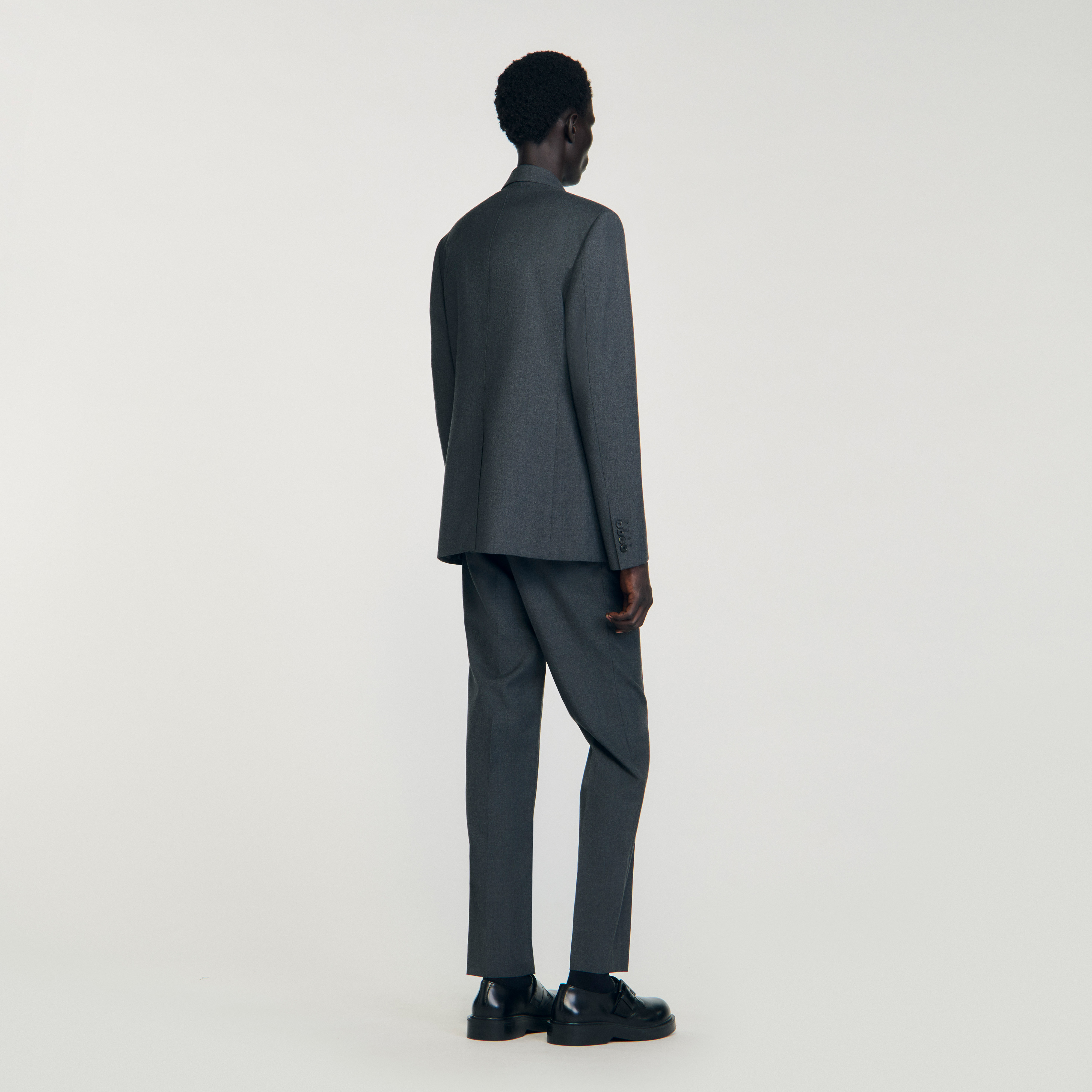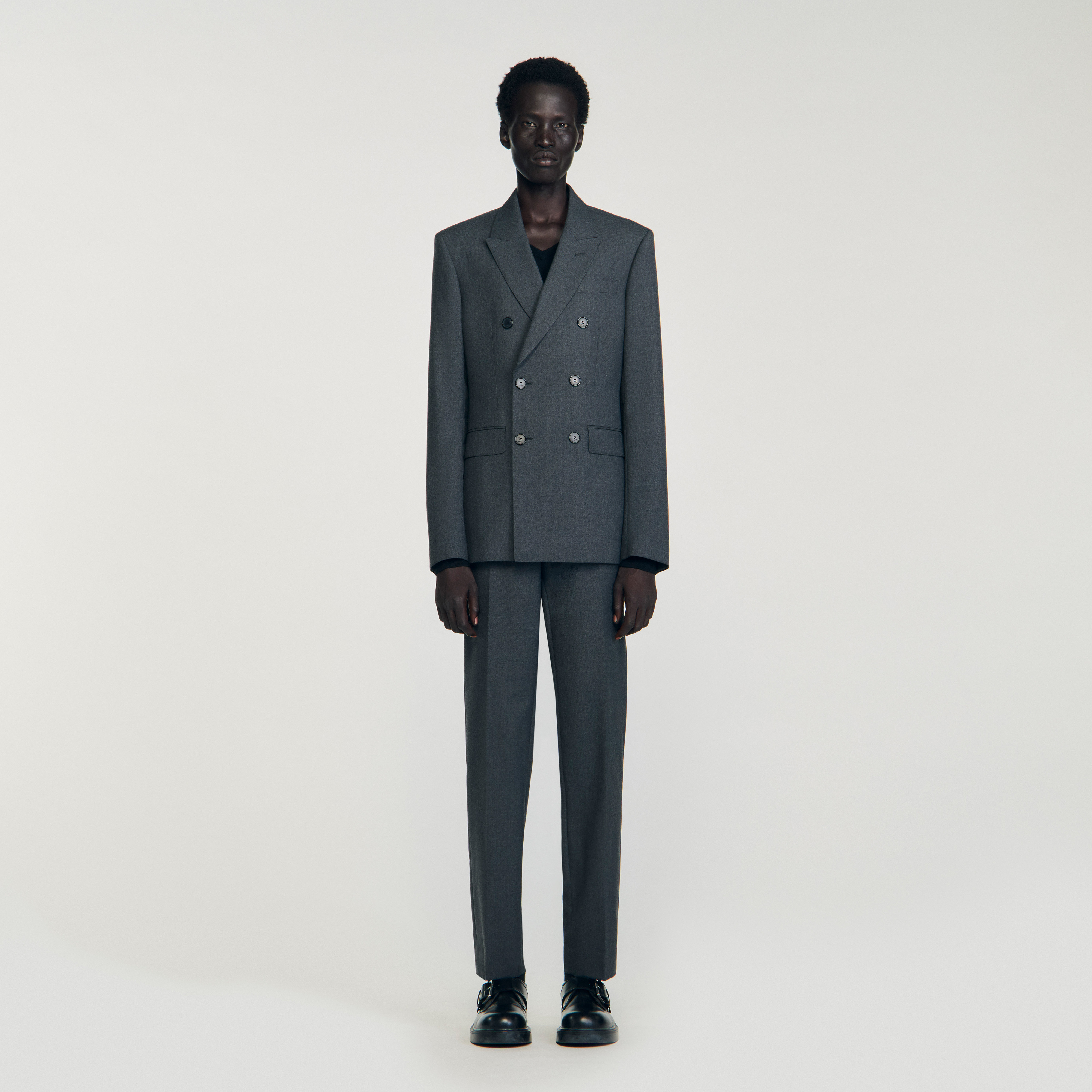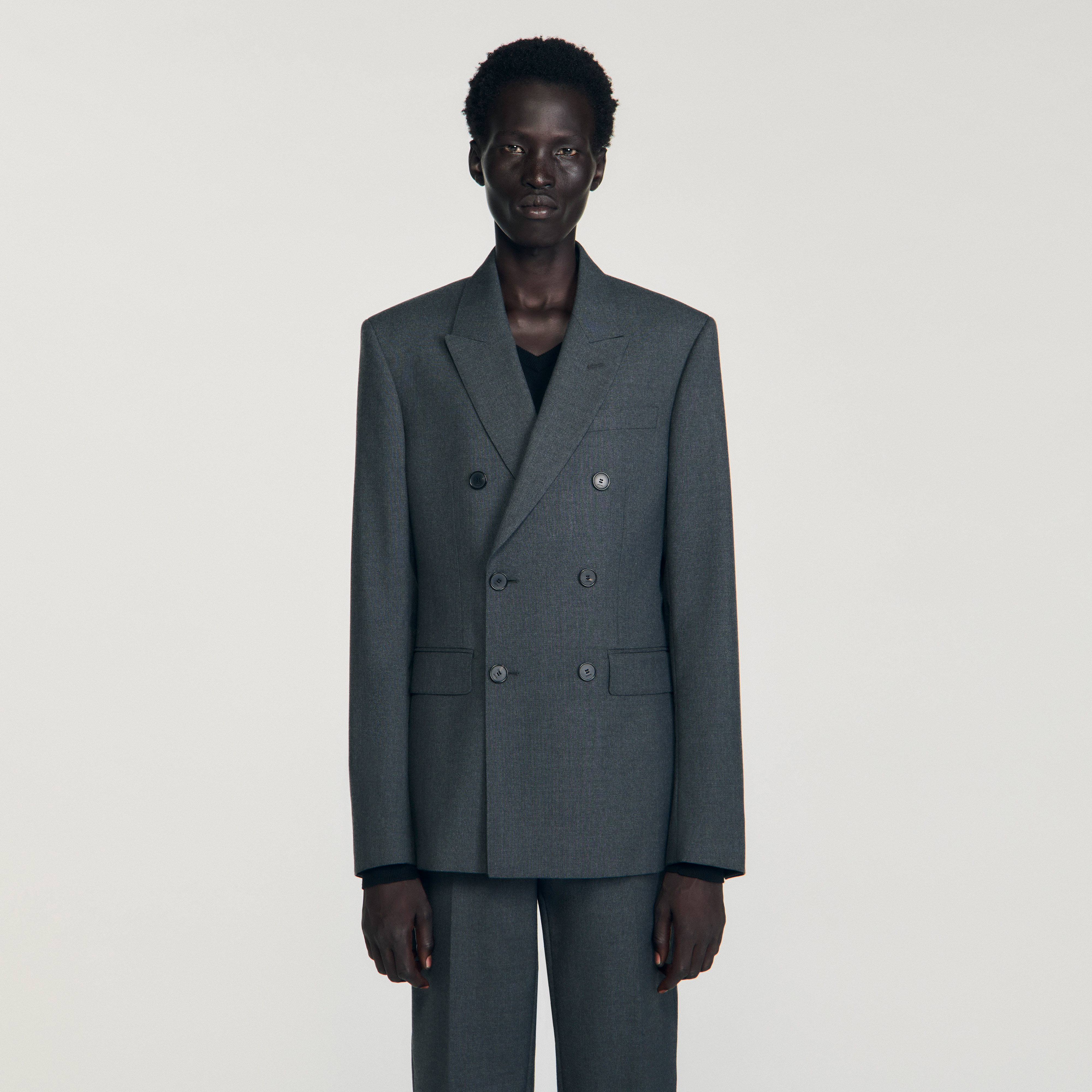Sandro virgin Virgin wool suit jacket with a classic cut, featuring a tailored collar, long sleeves, double-breasted with 6 buttons and flap pockets.