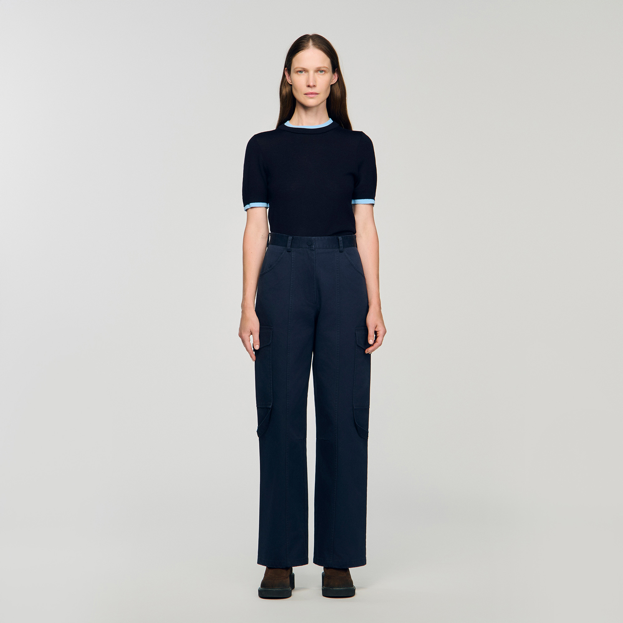 Sandro Women's cargo trousers Large pockets Side straps Exposed topstitching Belt loops Designed for a boxy fit.