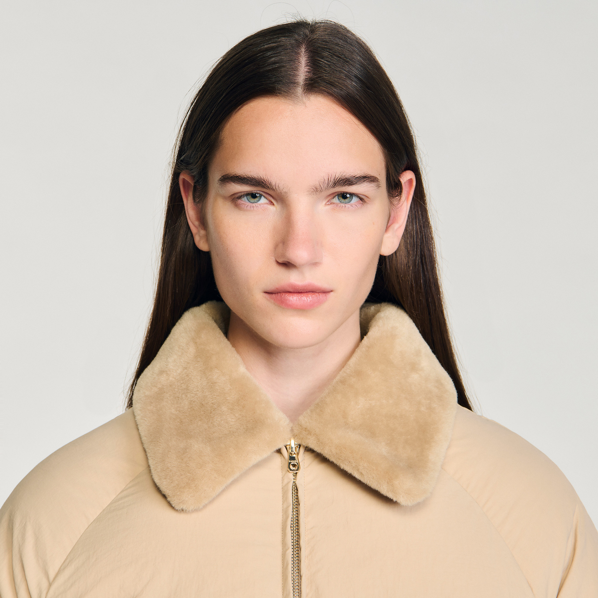 Sandro polyamide Padded puffer jacket with faux shearling collar, raglan sleeves and zip fastening.