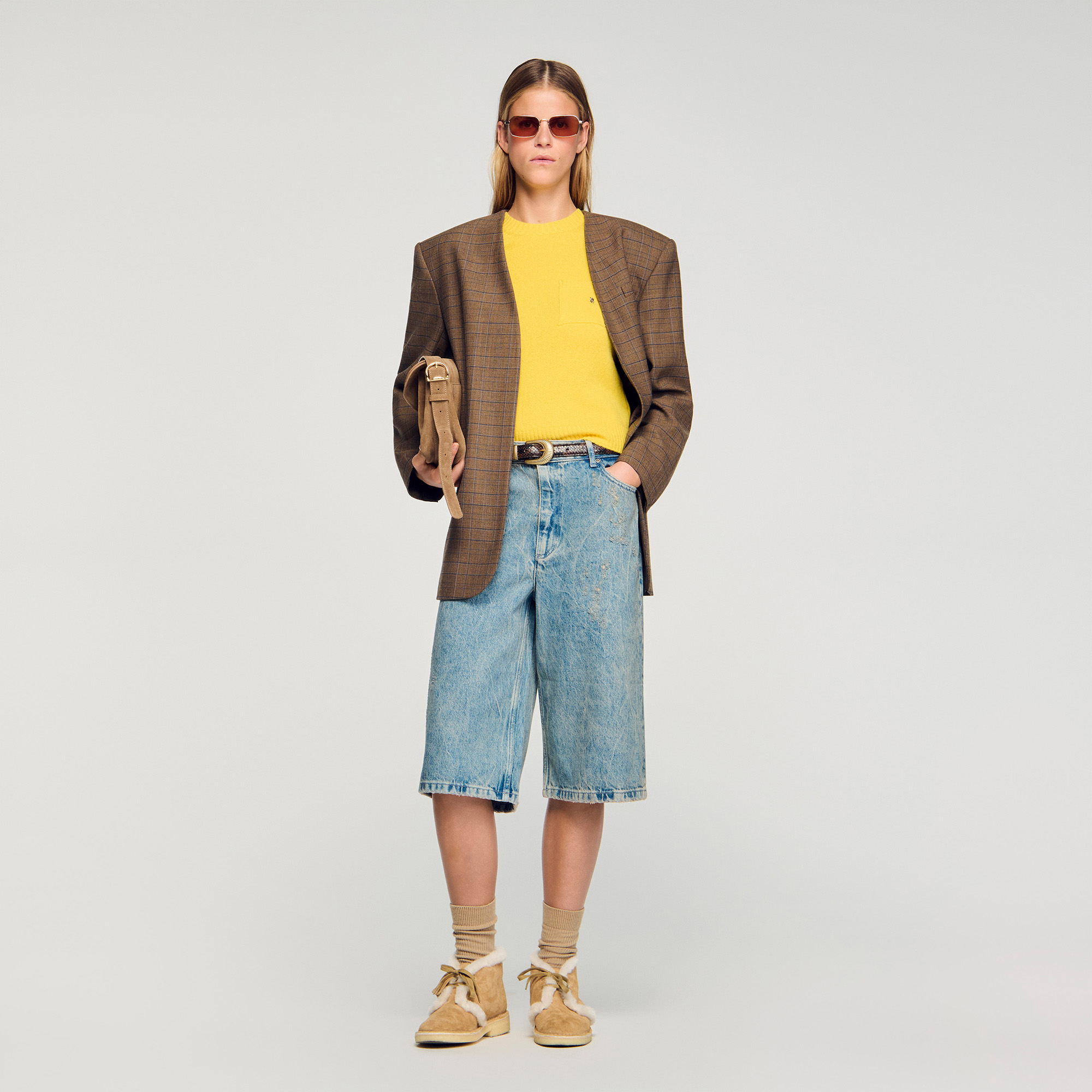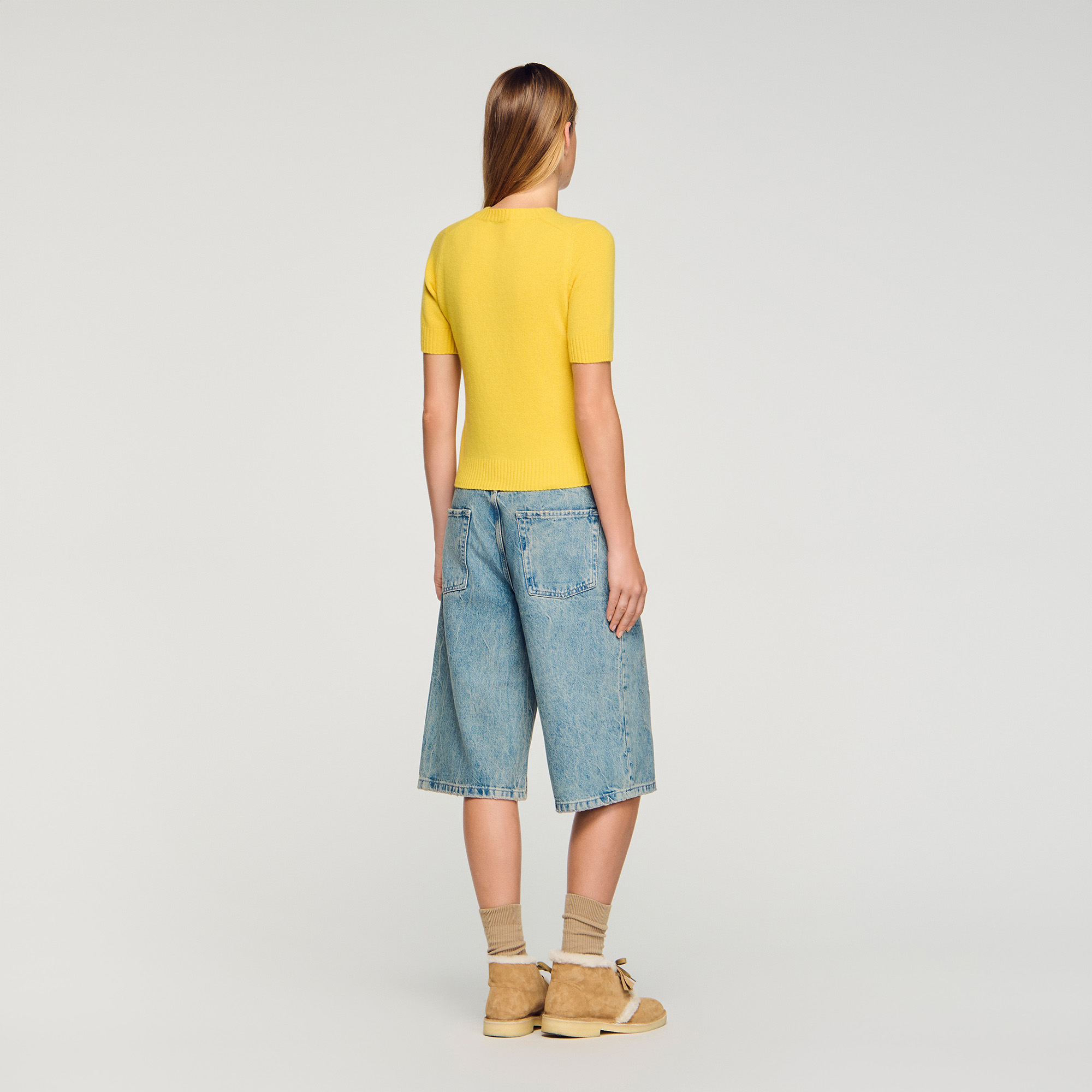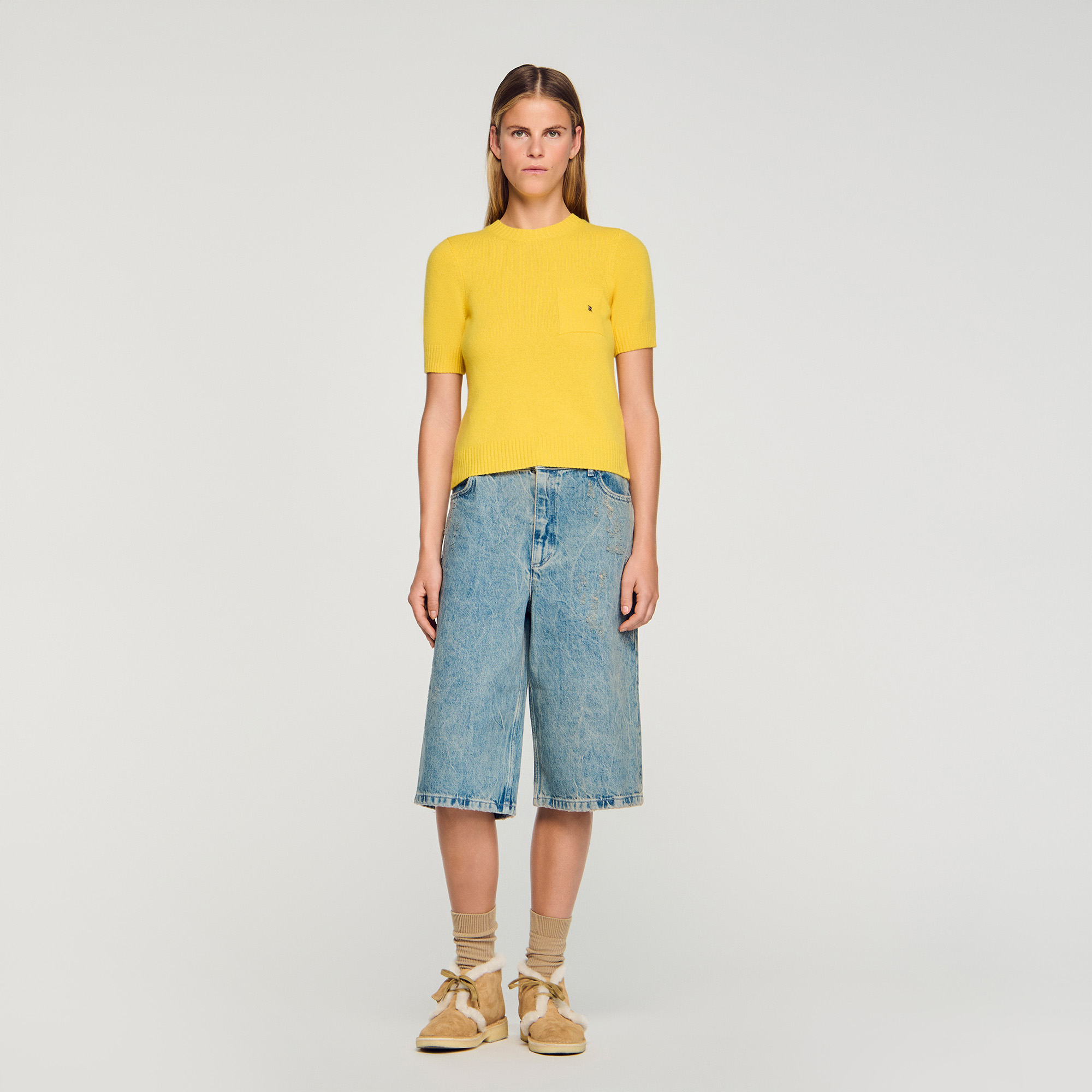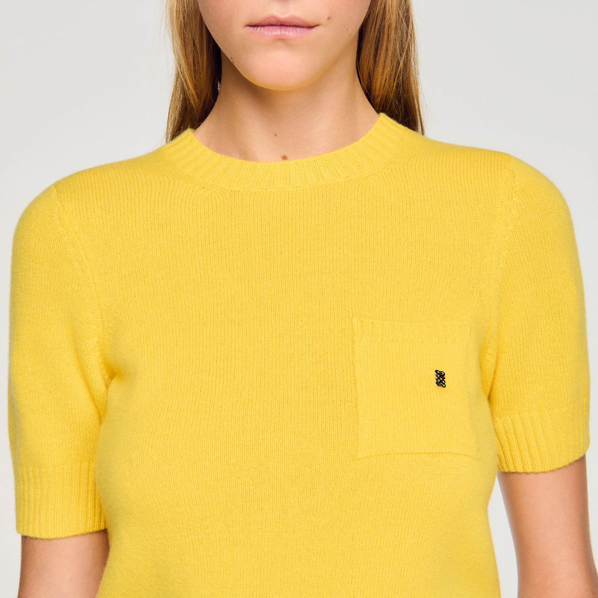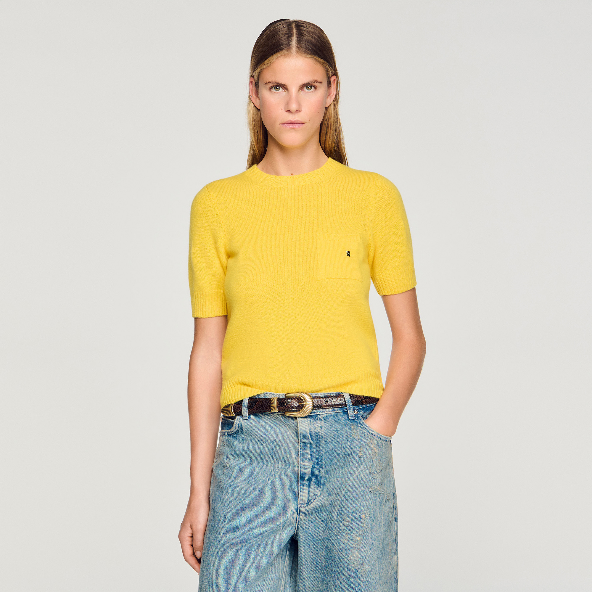 Sandro wool Fine knit short-sleeved sweater with small braid details and a chest patch pocket adorned with a signature tag.