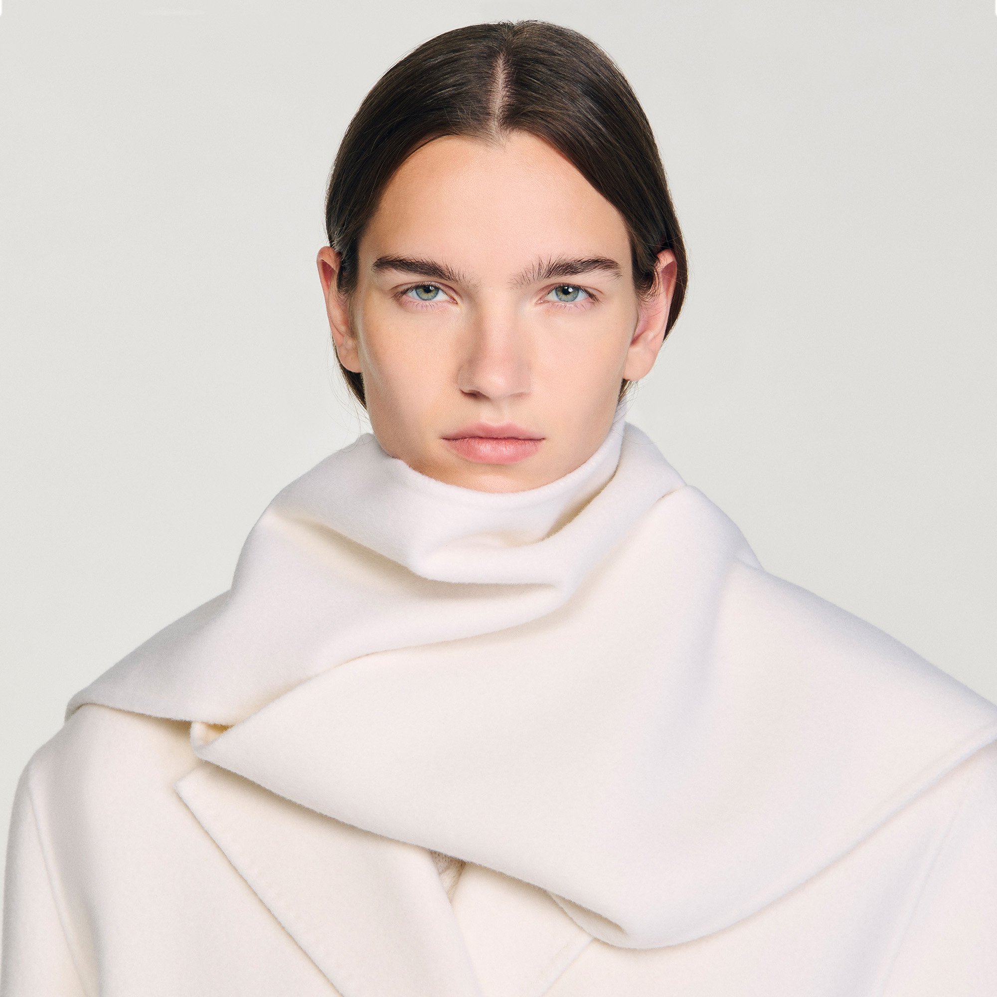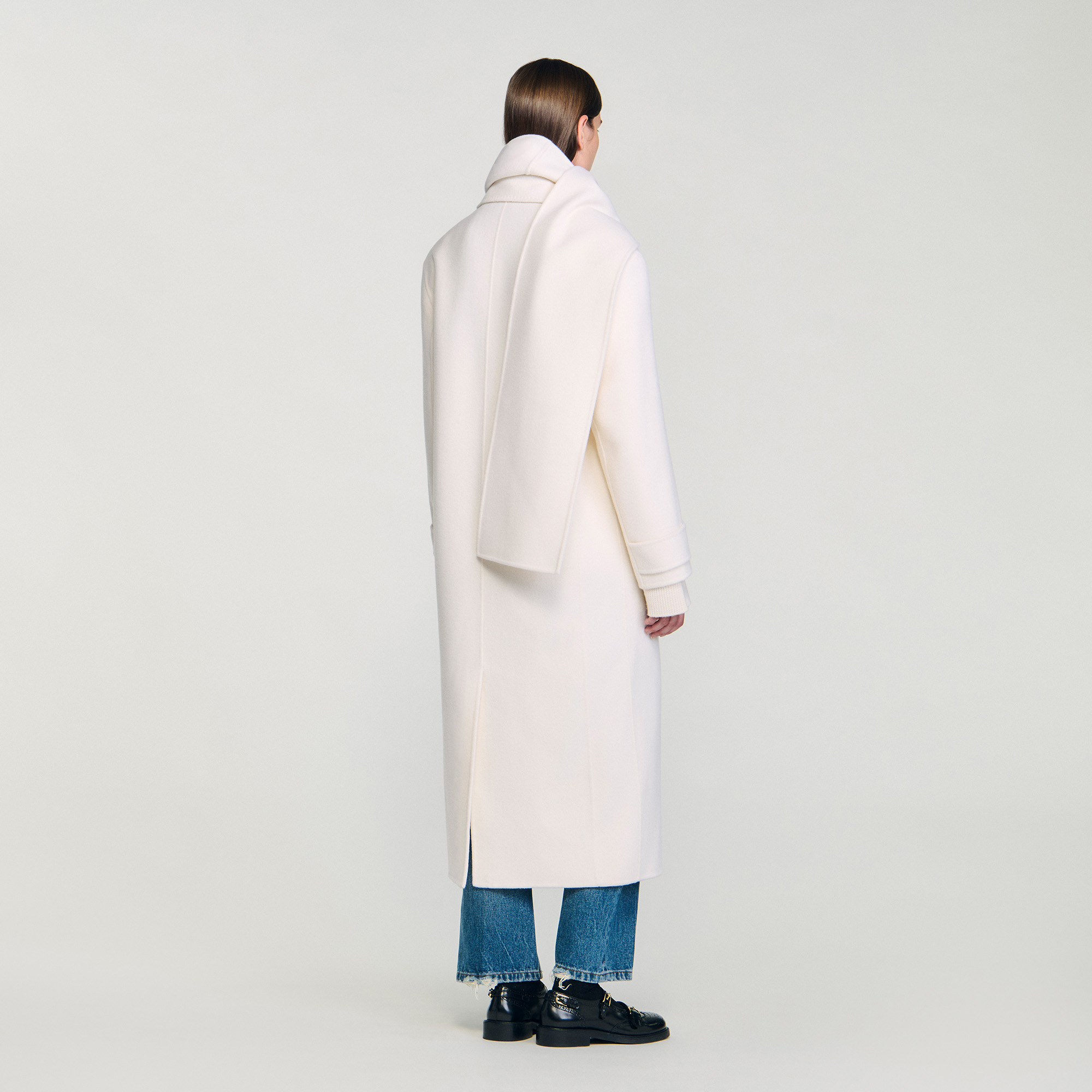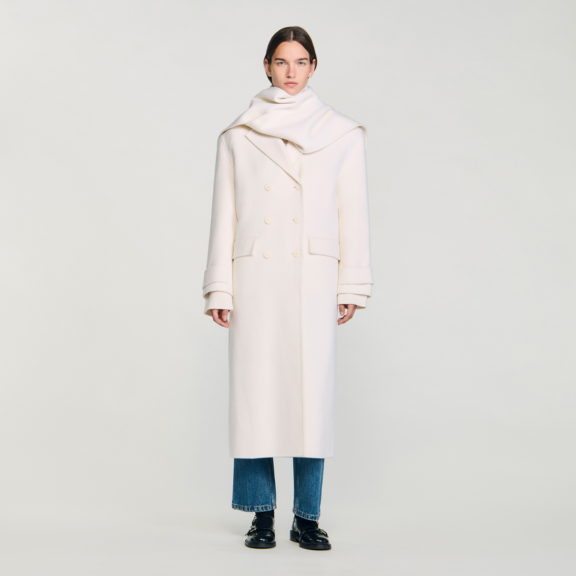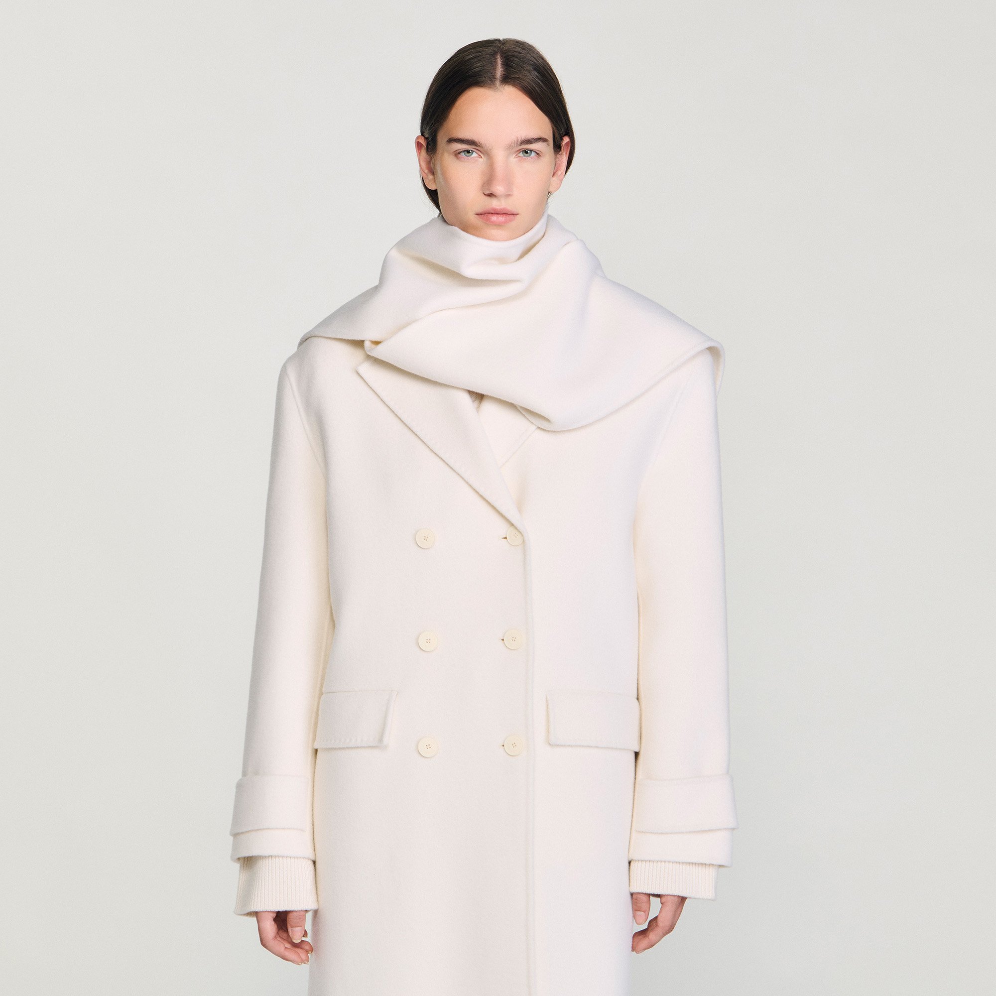 Sandro wool Oversized double-faced wool coat with removable built-in scarf, double-breasted design, hip flap pockets and back slit.