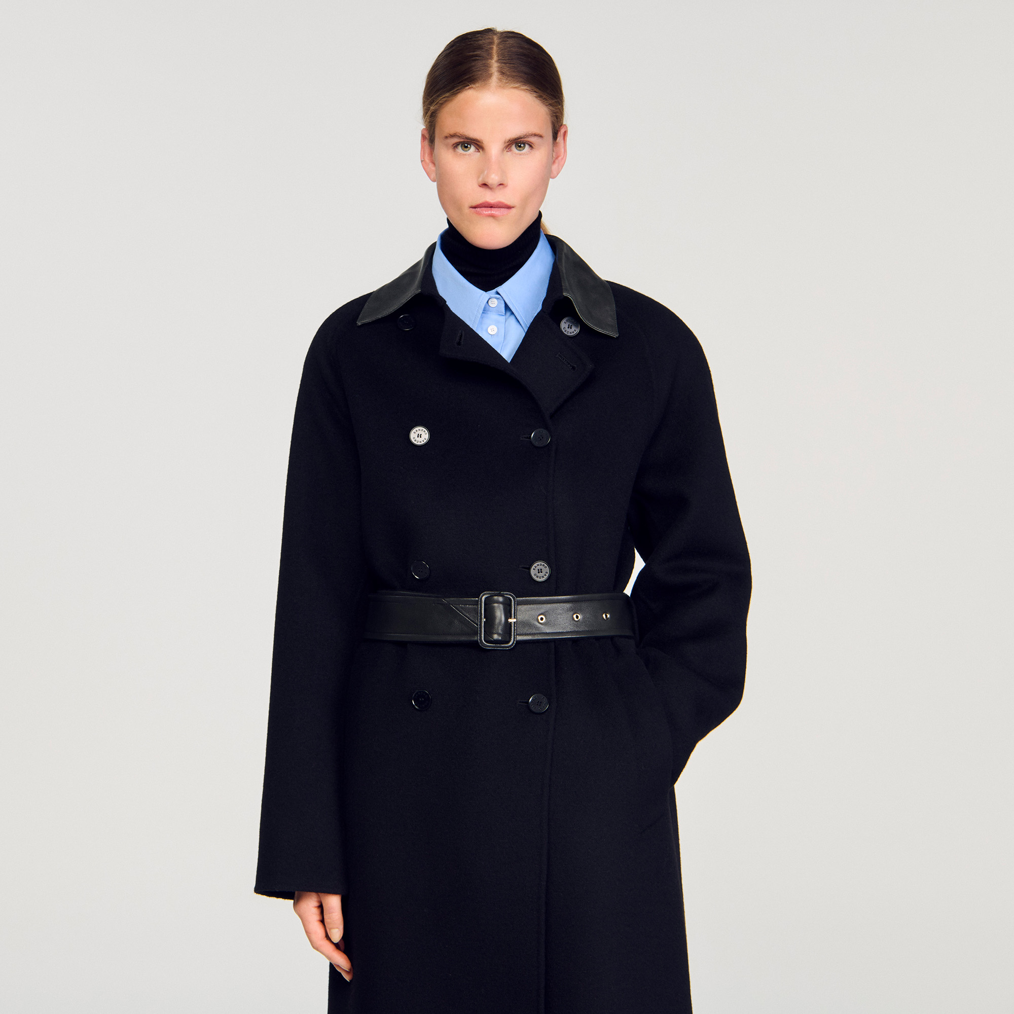 Sandro wool Long trench-style wool coat with lamb leather collar, long sleeves, double-breasted design and removable belt.