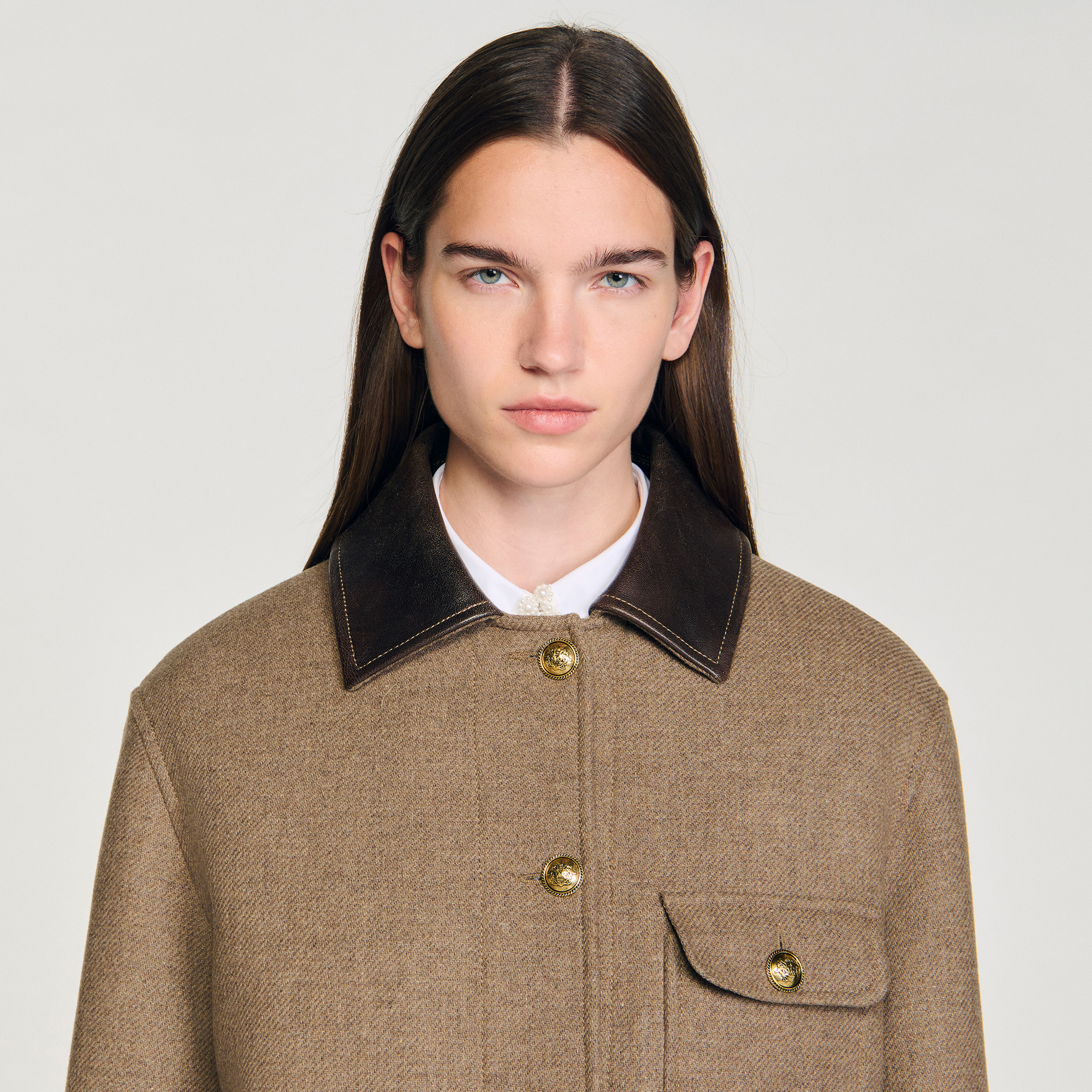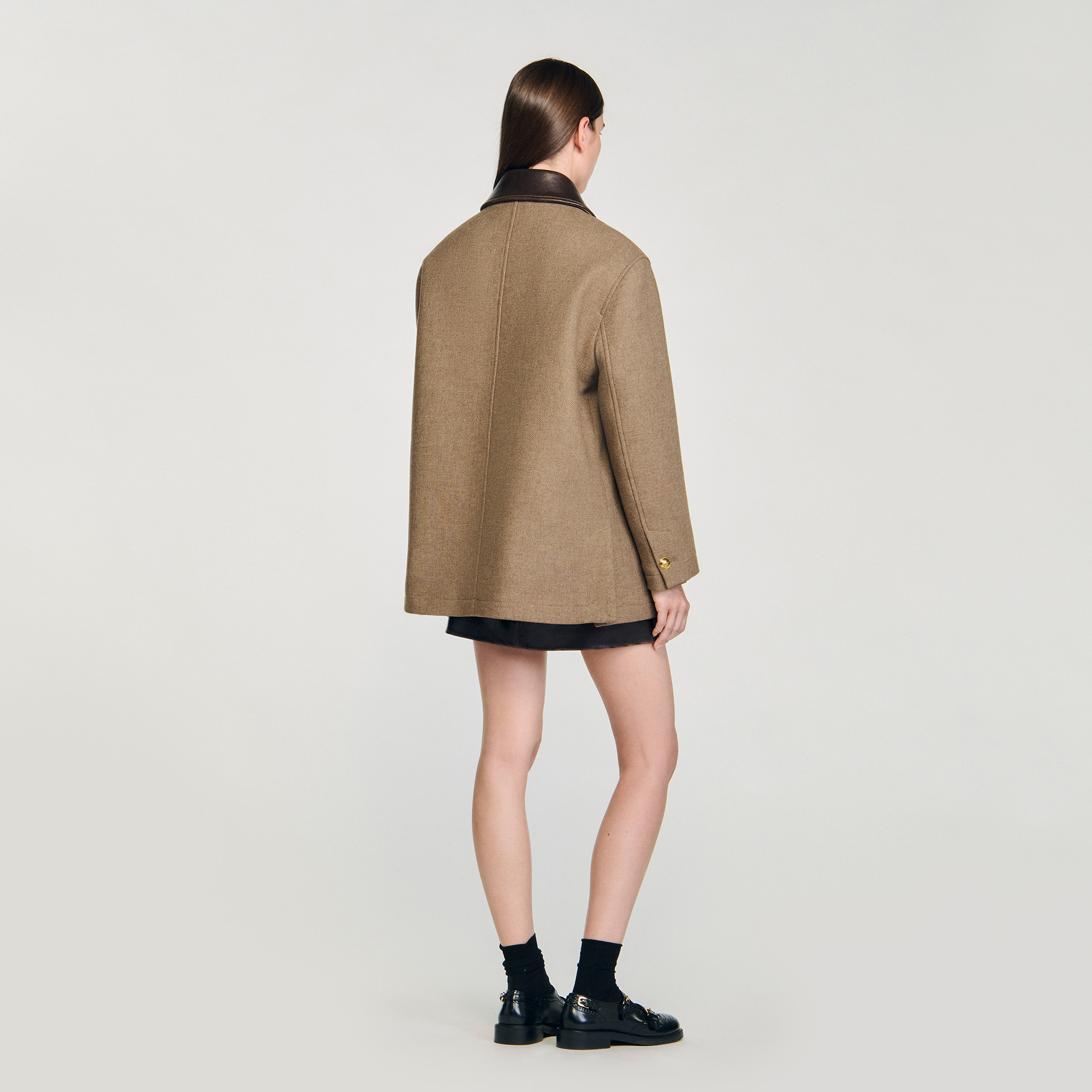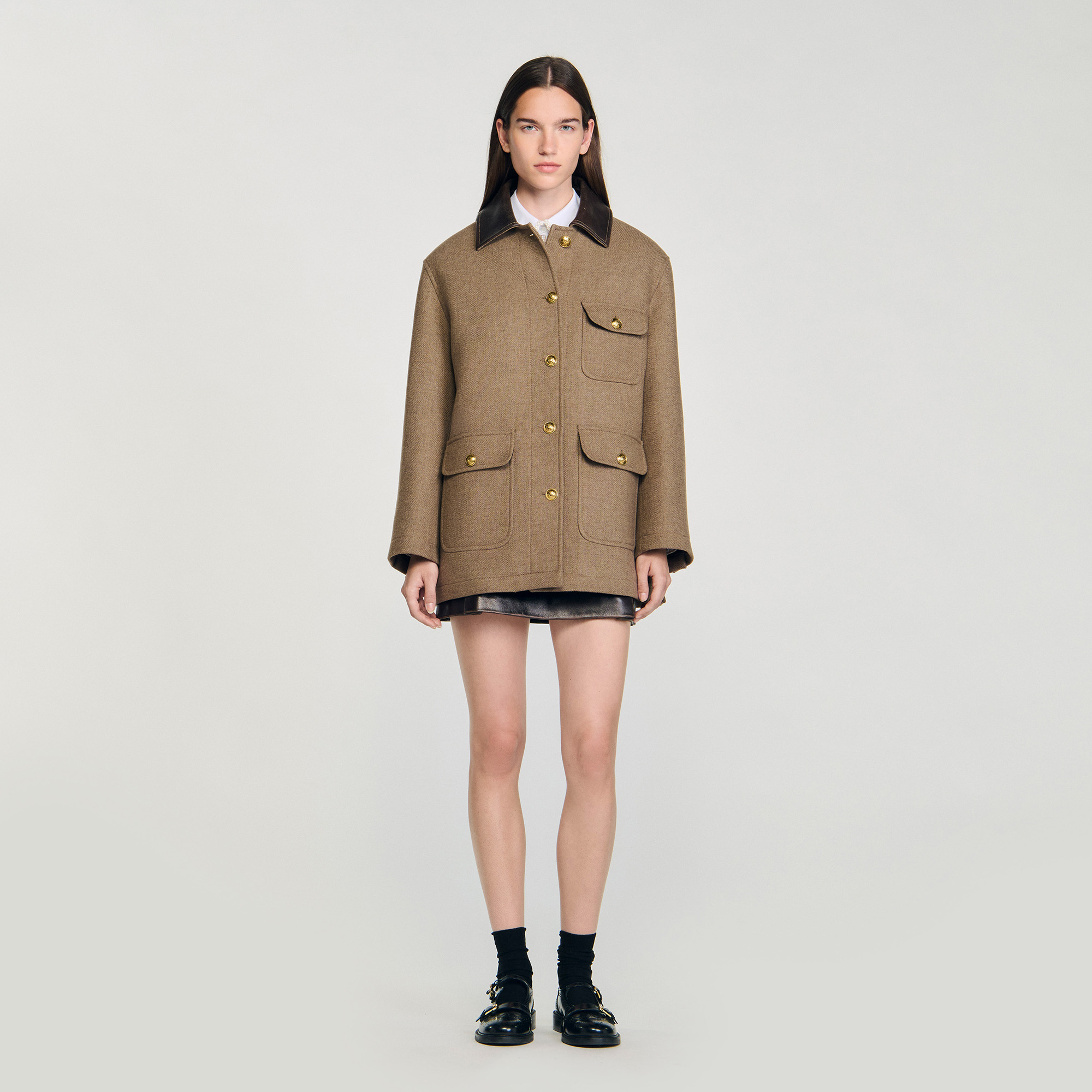 Sandro wool Tweed coat with leather collar, gold button fastening, long sleeves with button cuffs and flap pockets.
