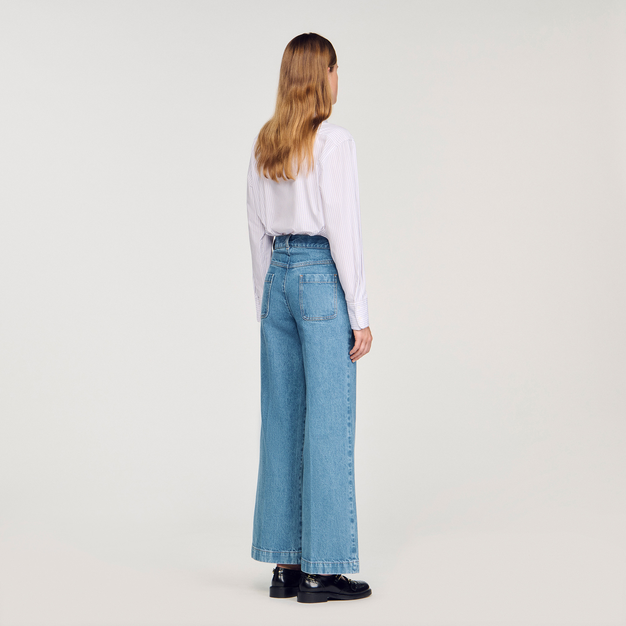 Sandro cotton High-waisted wide-leg jeans in faded denim, featuring patch pockets and belt loops.