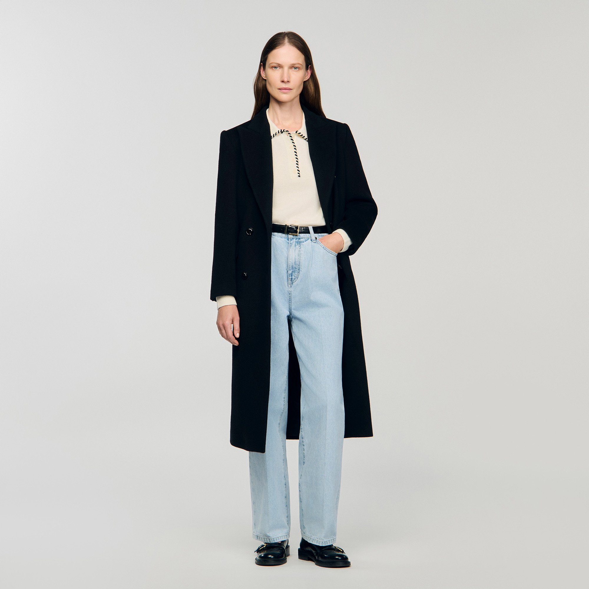Sandro Women's fine knit sweater Buttoned polo collar Long sleeves Contrasting finishes Designed for a boxy fit.